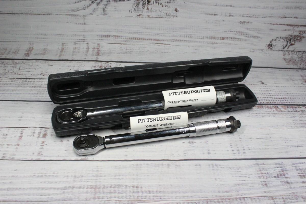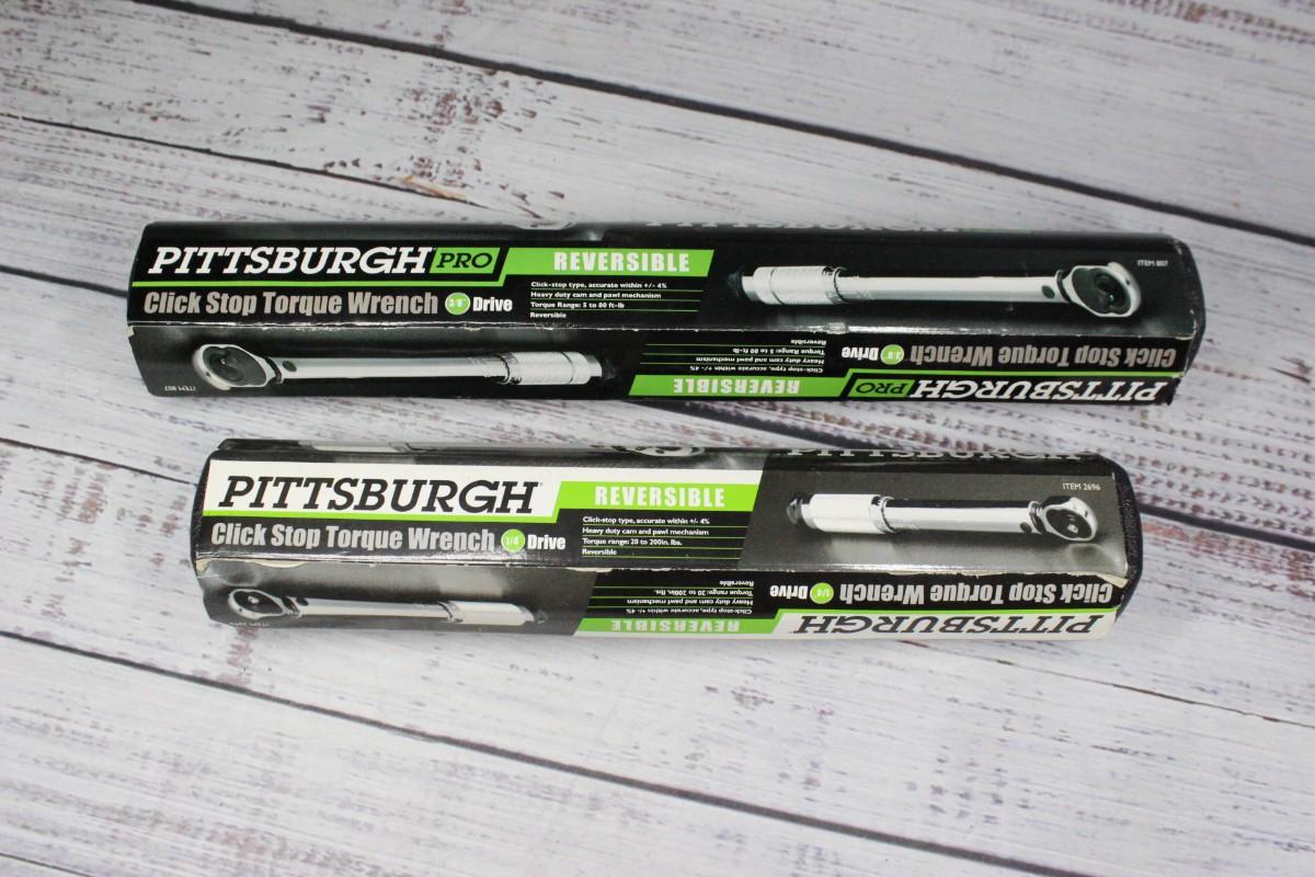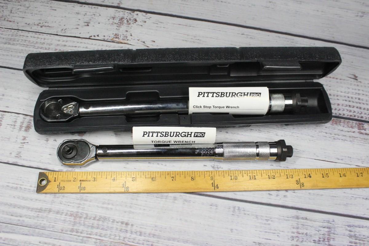 Pair of Pittsburgh Click Stop Torque Wrench with Cases, there's no significant wear or damage to both wrenches. See pictures for more information, comes with original slip cover for cases and instructions.