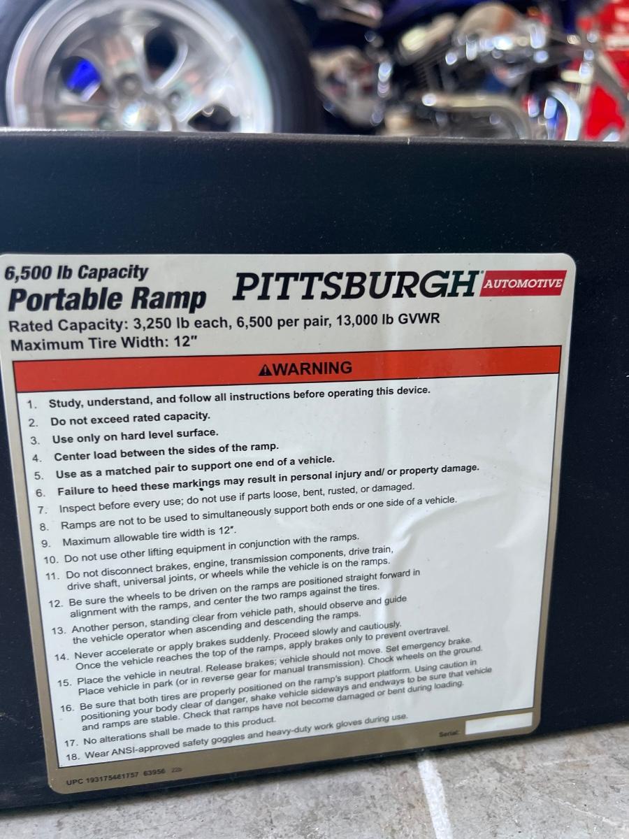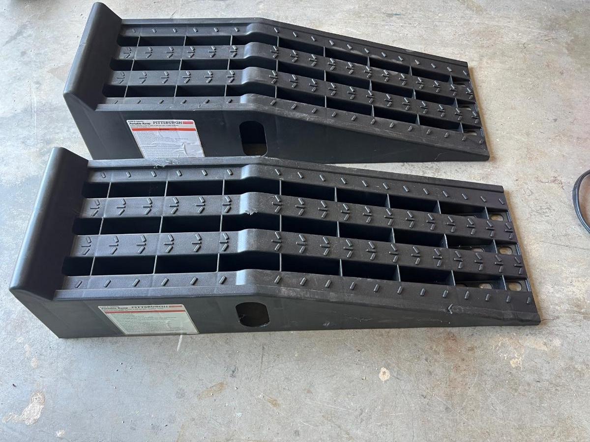 Heavy duty plastic. 6500 pound capacity. Twelve inch max width tires. Gently used. Measurement: 36"L (each).