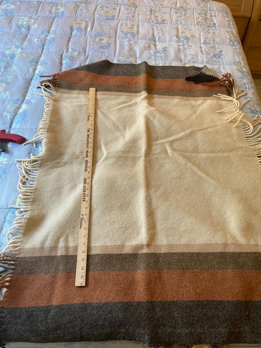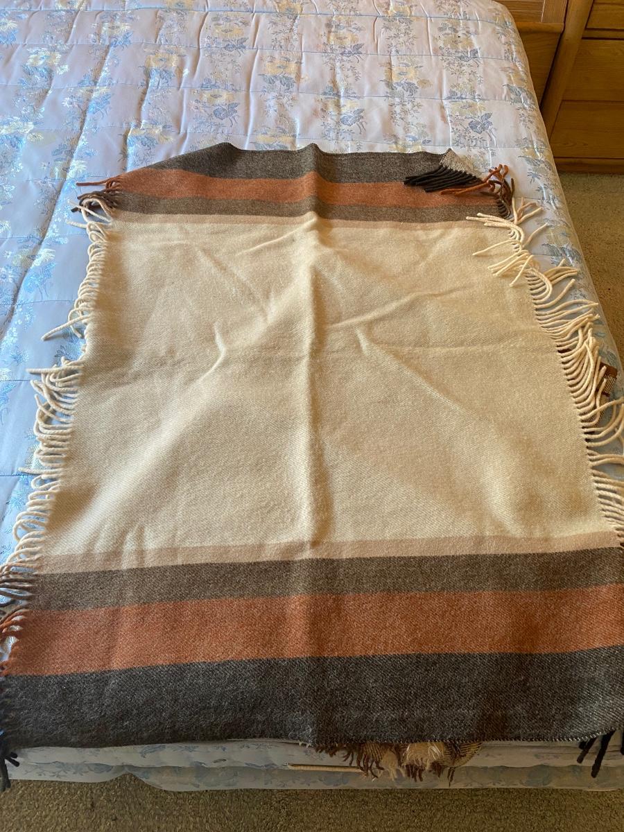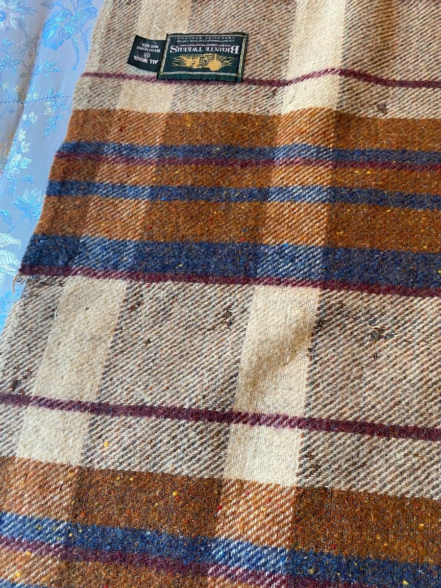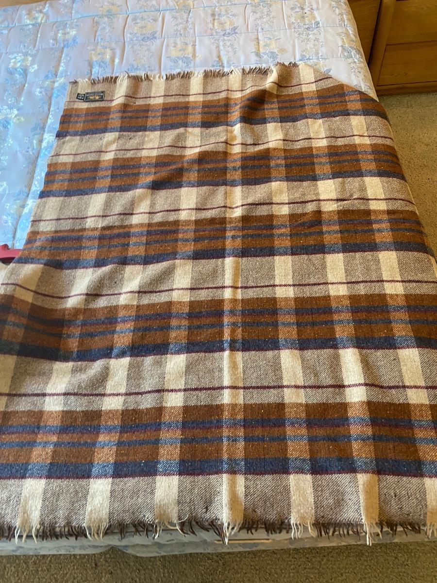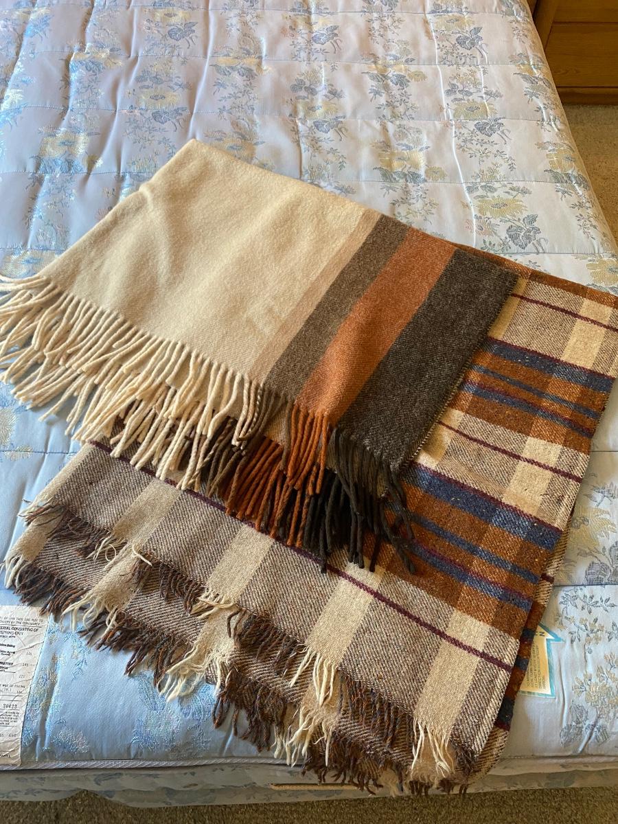 Pair of Plaid Flannel Wool Fringed Throw Lap Blankets. Fair condition, no spots but a few small moth holes.