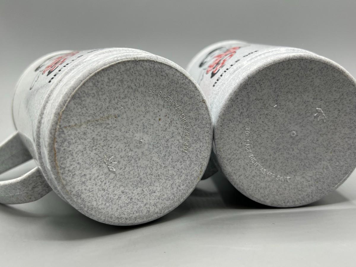 There is no significant damage to the plastic mugs and is in good collectible or useable condition. Check pictures for more details and for sizing.