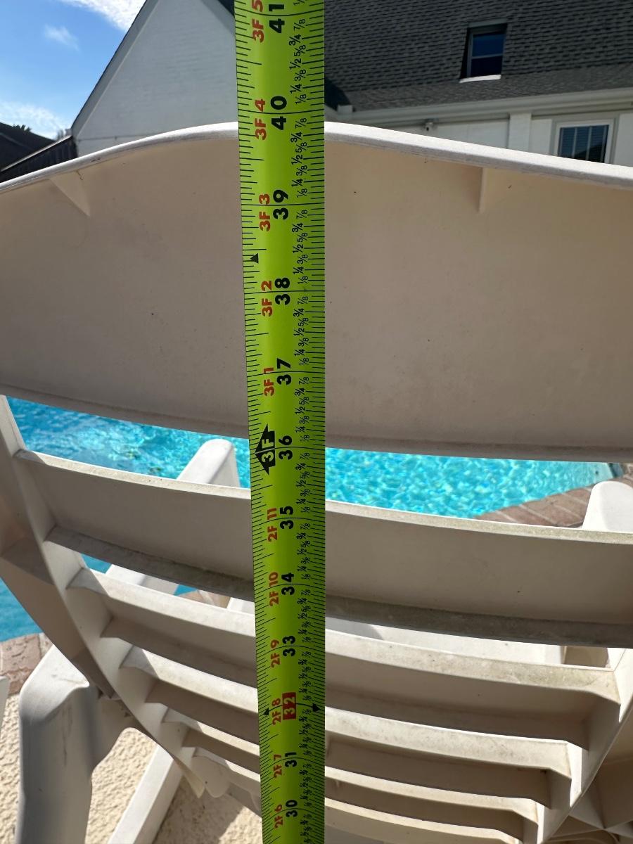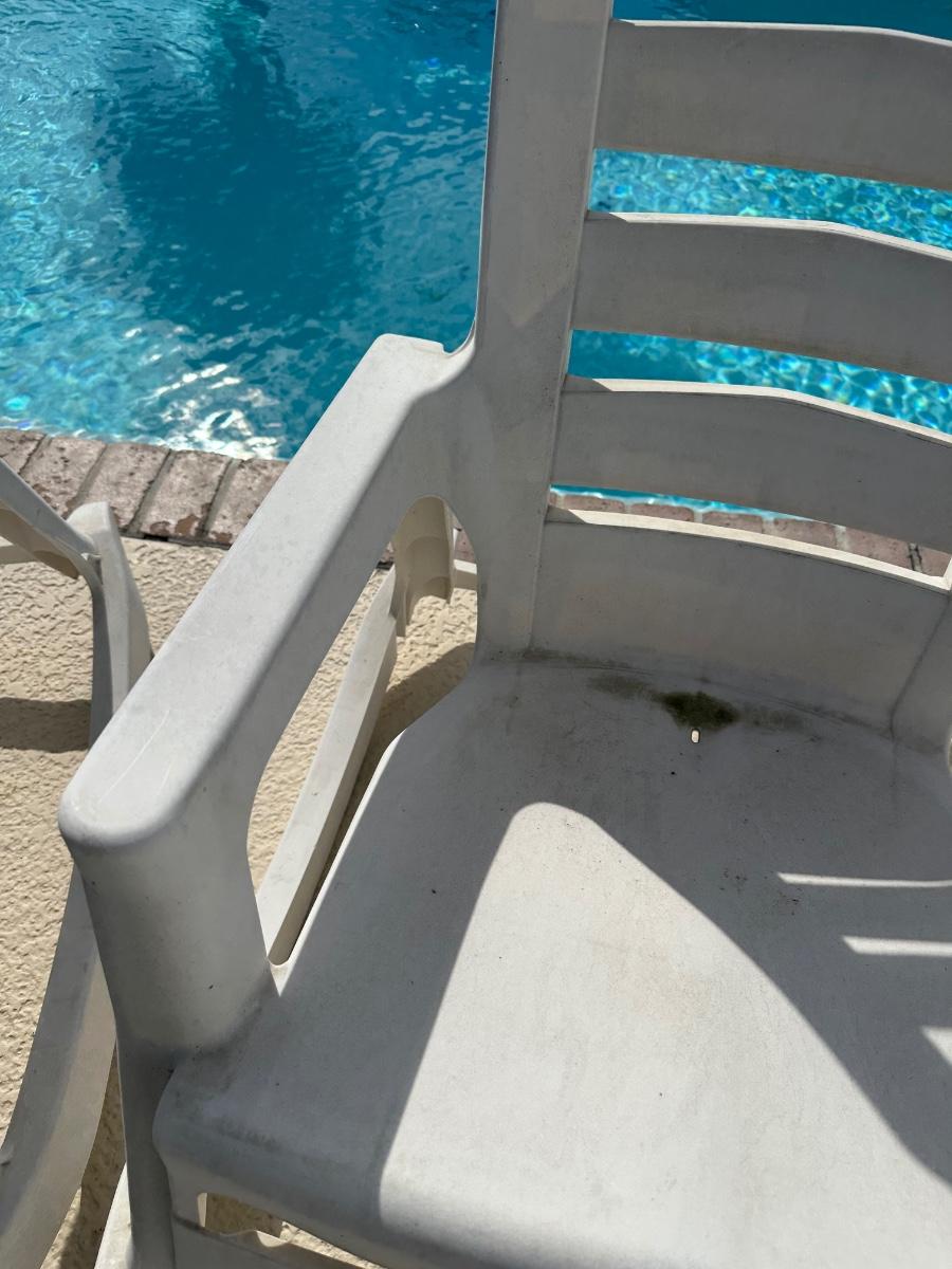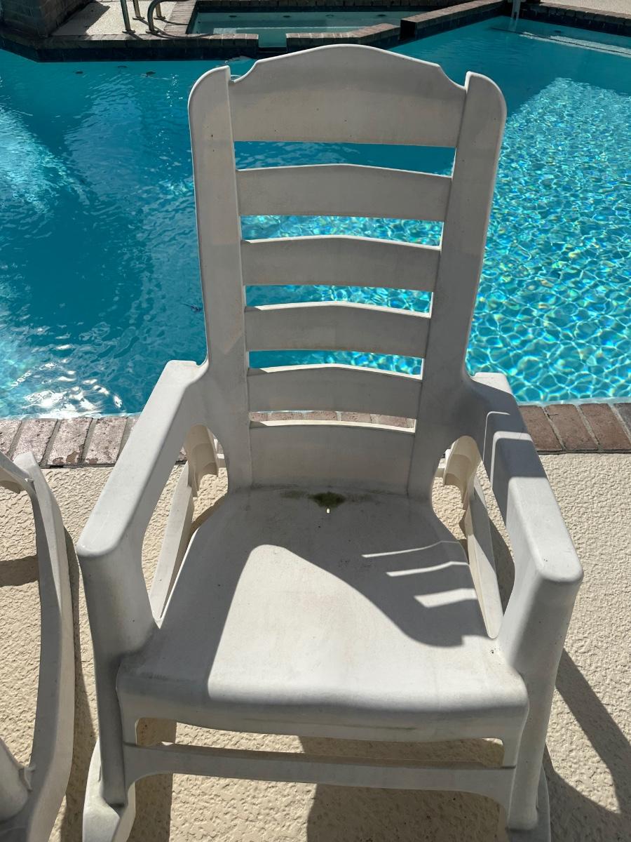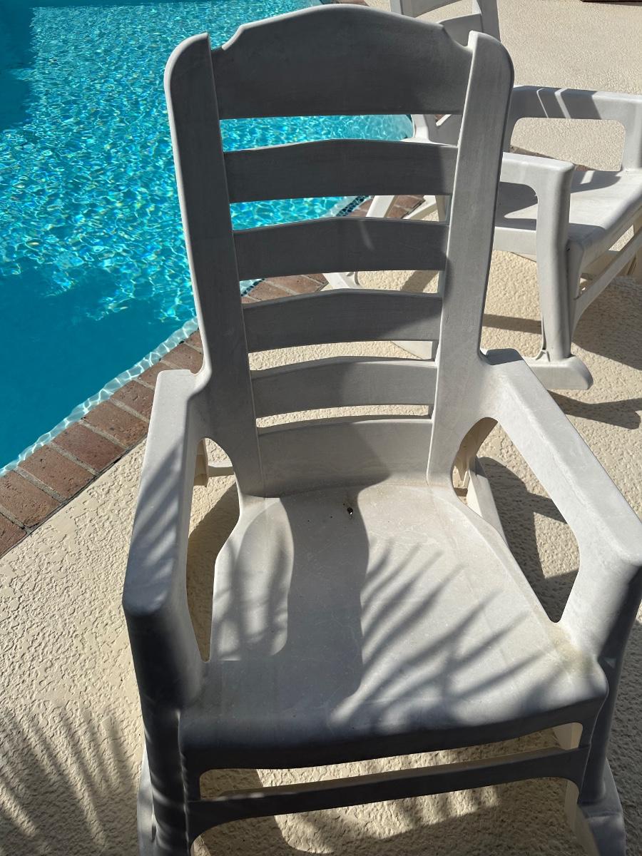 Set of two plastic outdoor rocking patio chairs with armrests. Sturdy and suitable for poolside or patio use. Shows surface wear and staining from outdoor exposure (see photos).