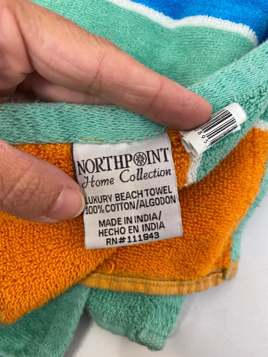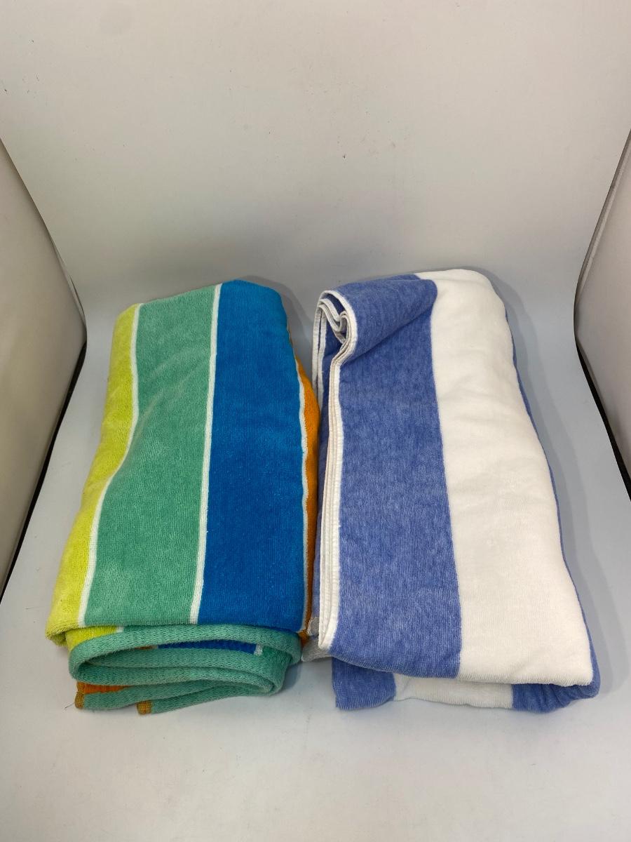 Pair of Plush Striped Beach Towels. The larger one says it measures 35"x70", the other is only a couple inches smaller. Both are in good condition, possibly unused.