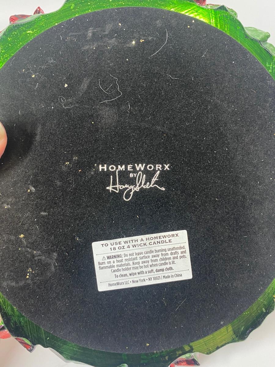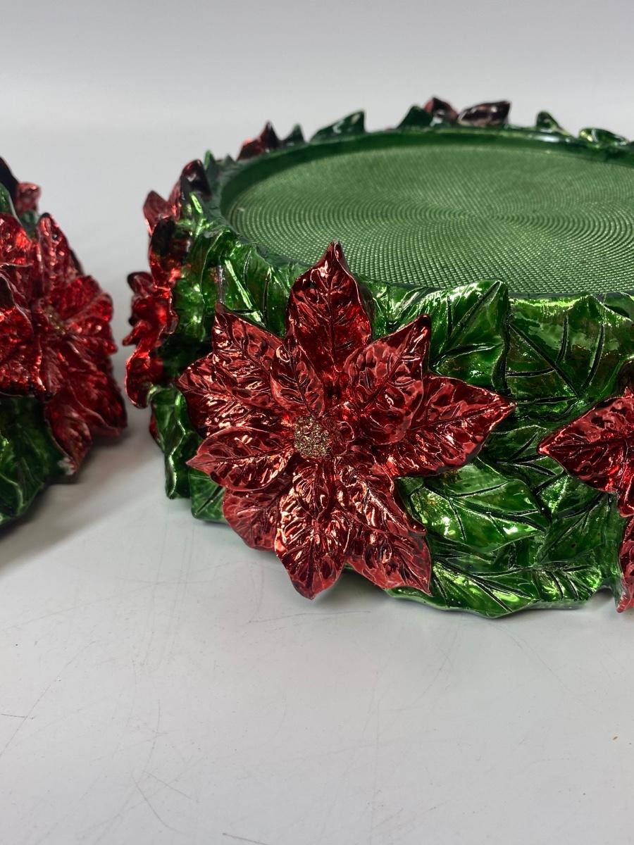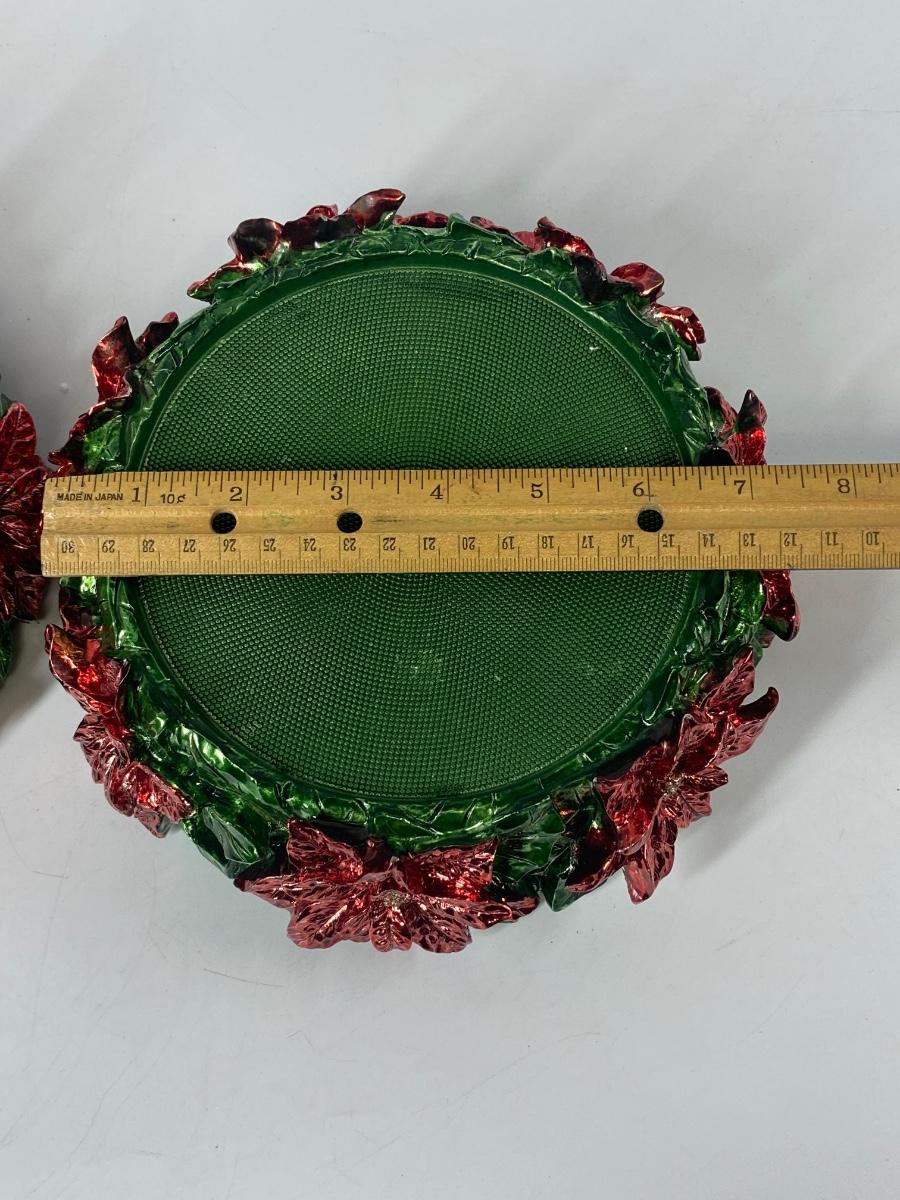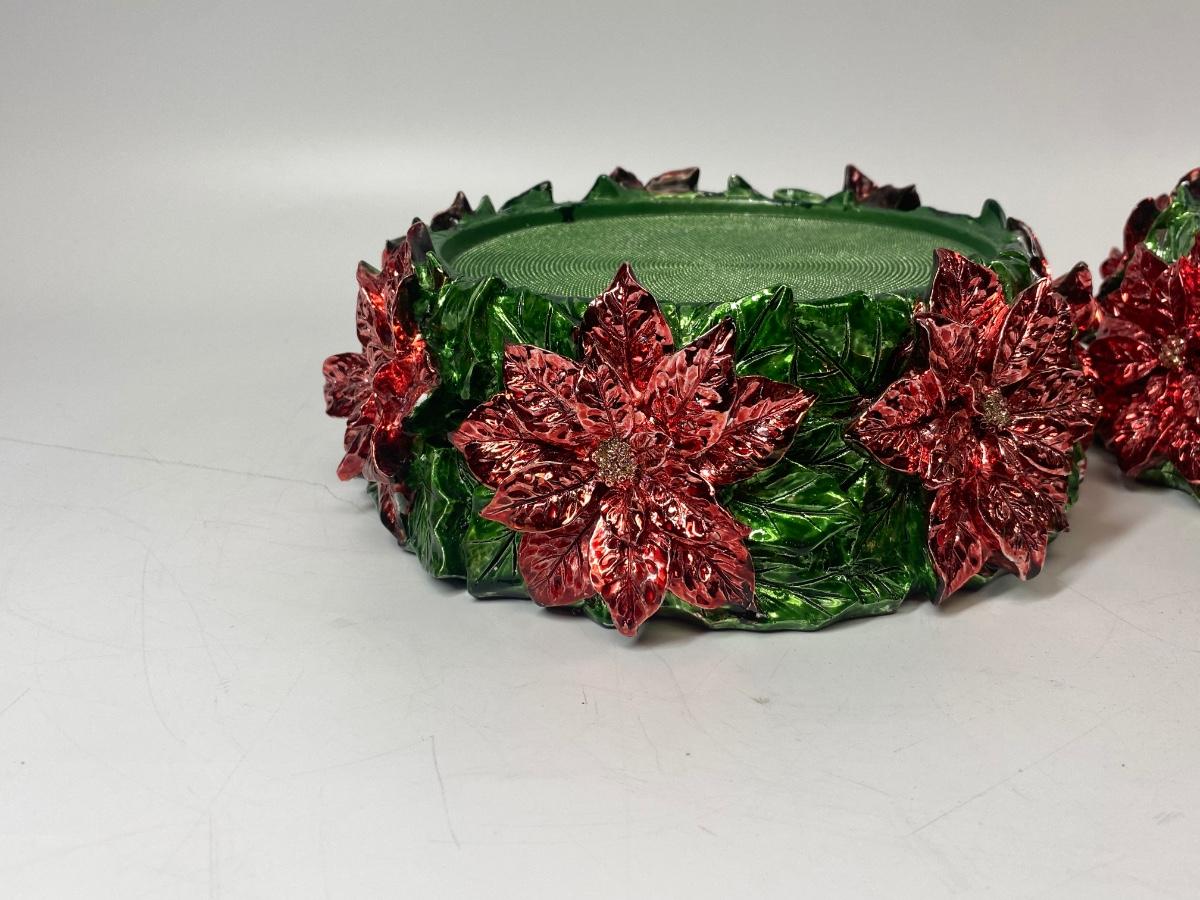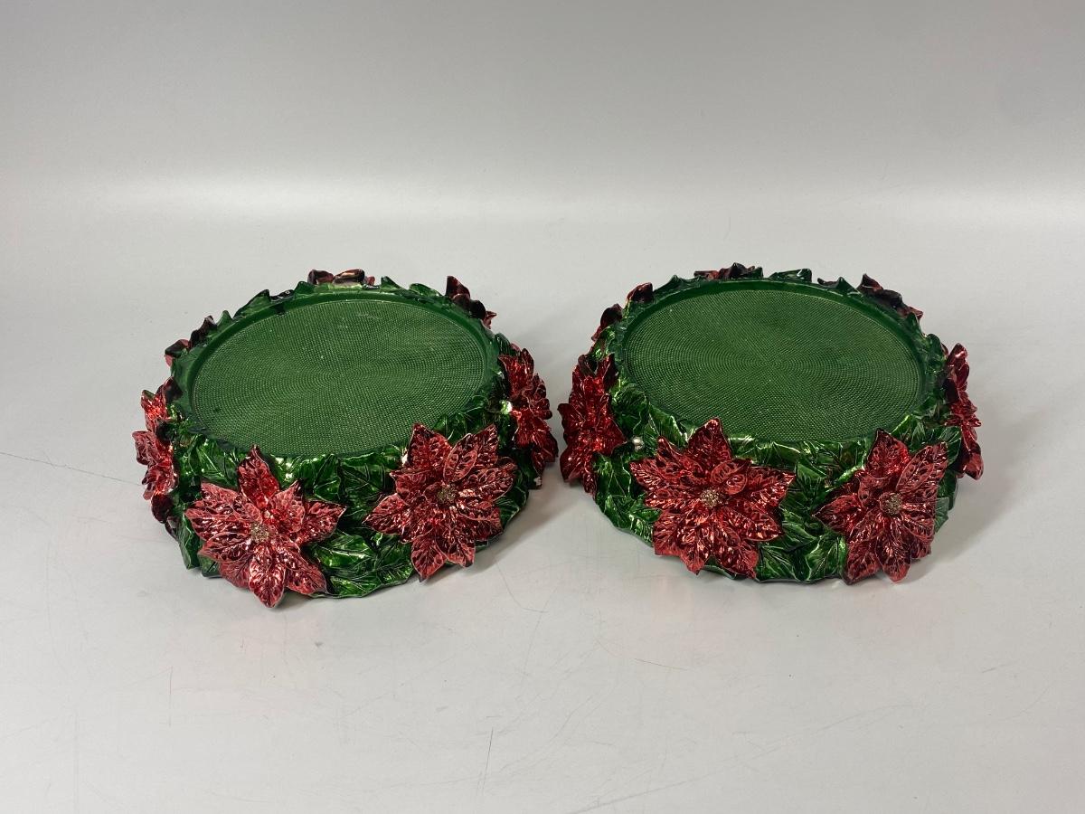 Pair of Poinsettia Red & Green Candle Base Holders. Metallic finish. Good condition.
