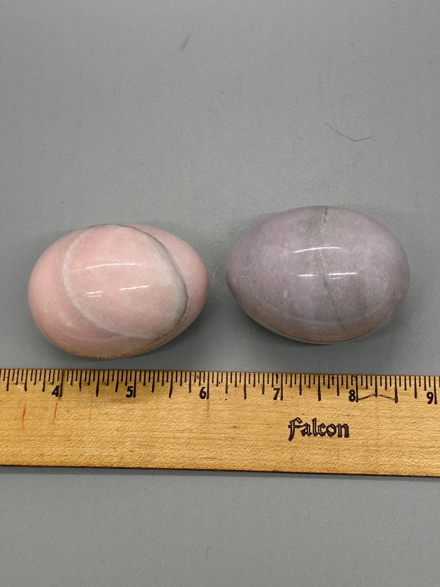 Pair of polished stone eggs. Look like pink and purple quartz. Good condition, under 3" size.