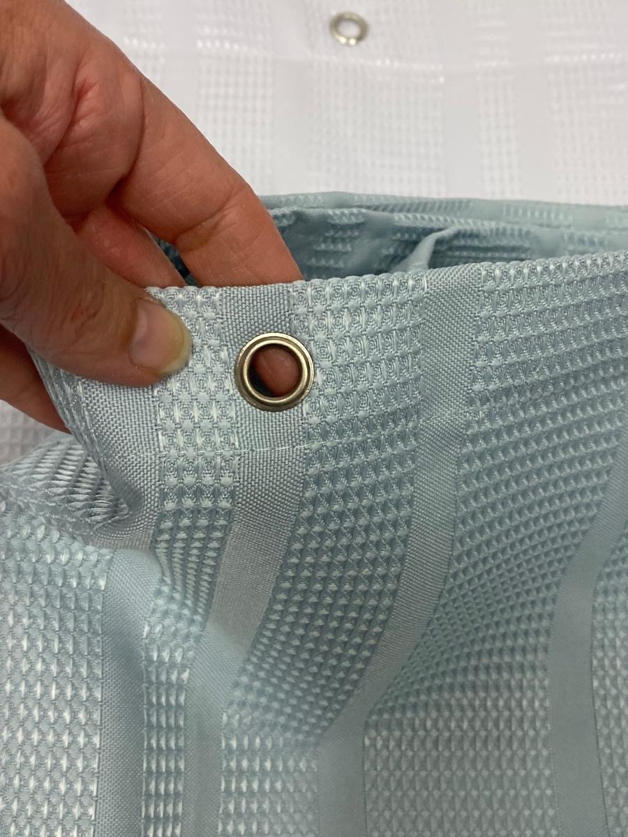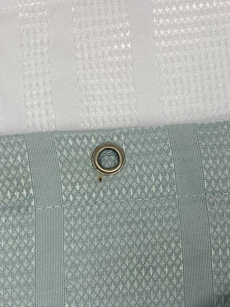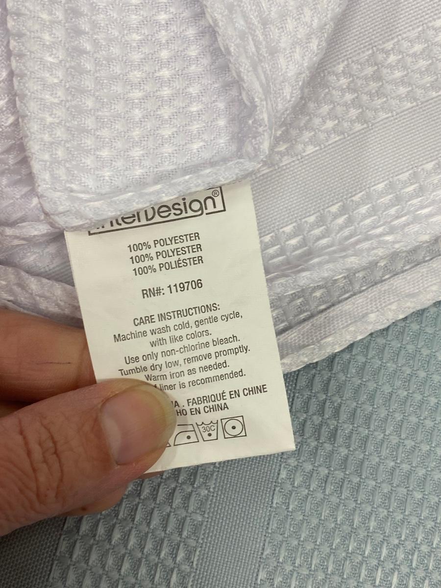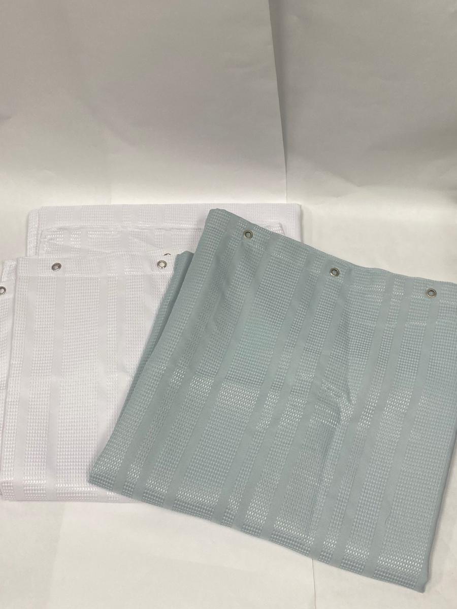 Pair of Polyester Shower Curtains White & Pale Blue. Both look unused except for some discolor at the eyelets on the blue one but that could be from age.