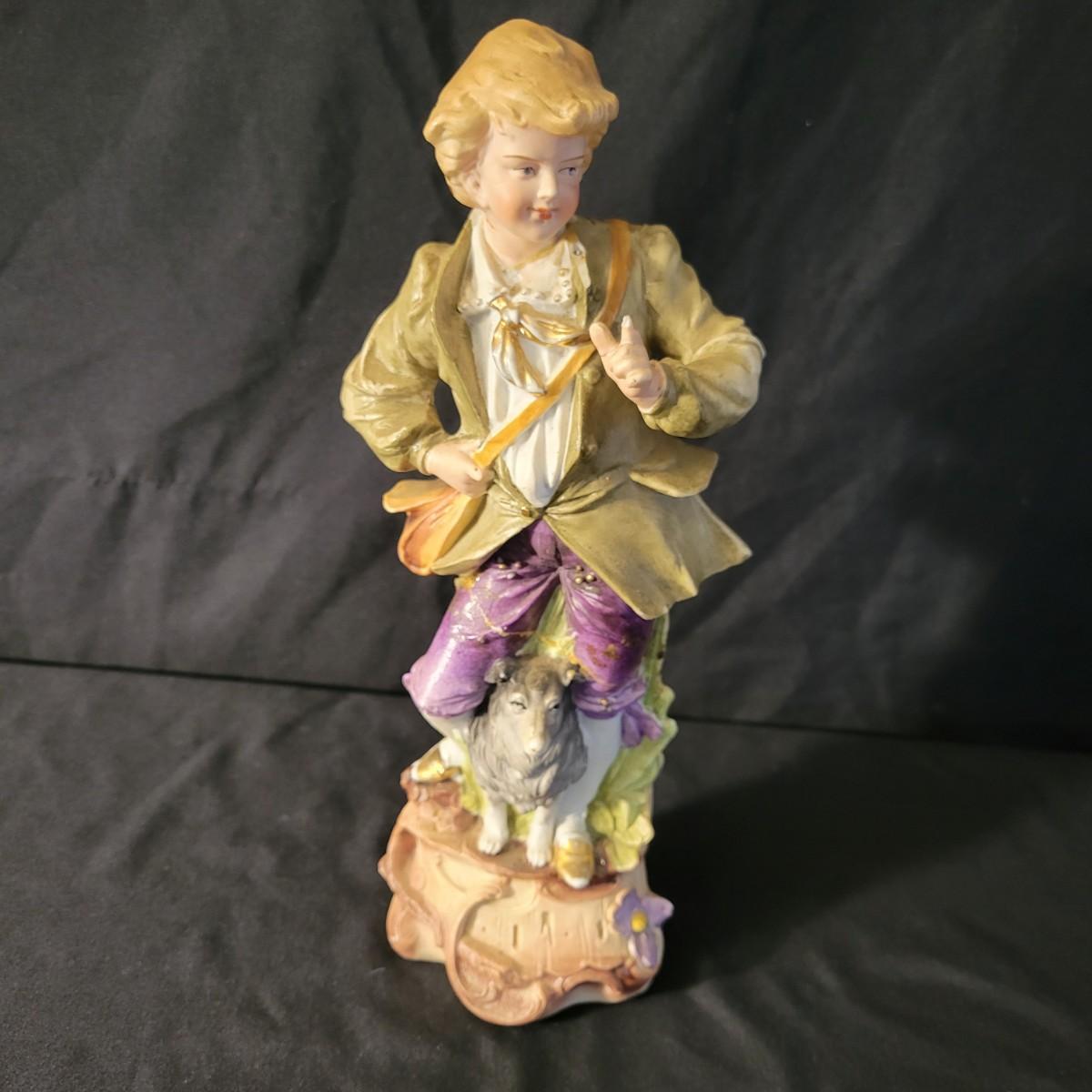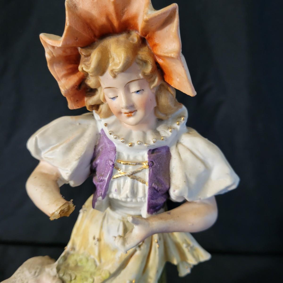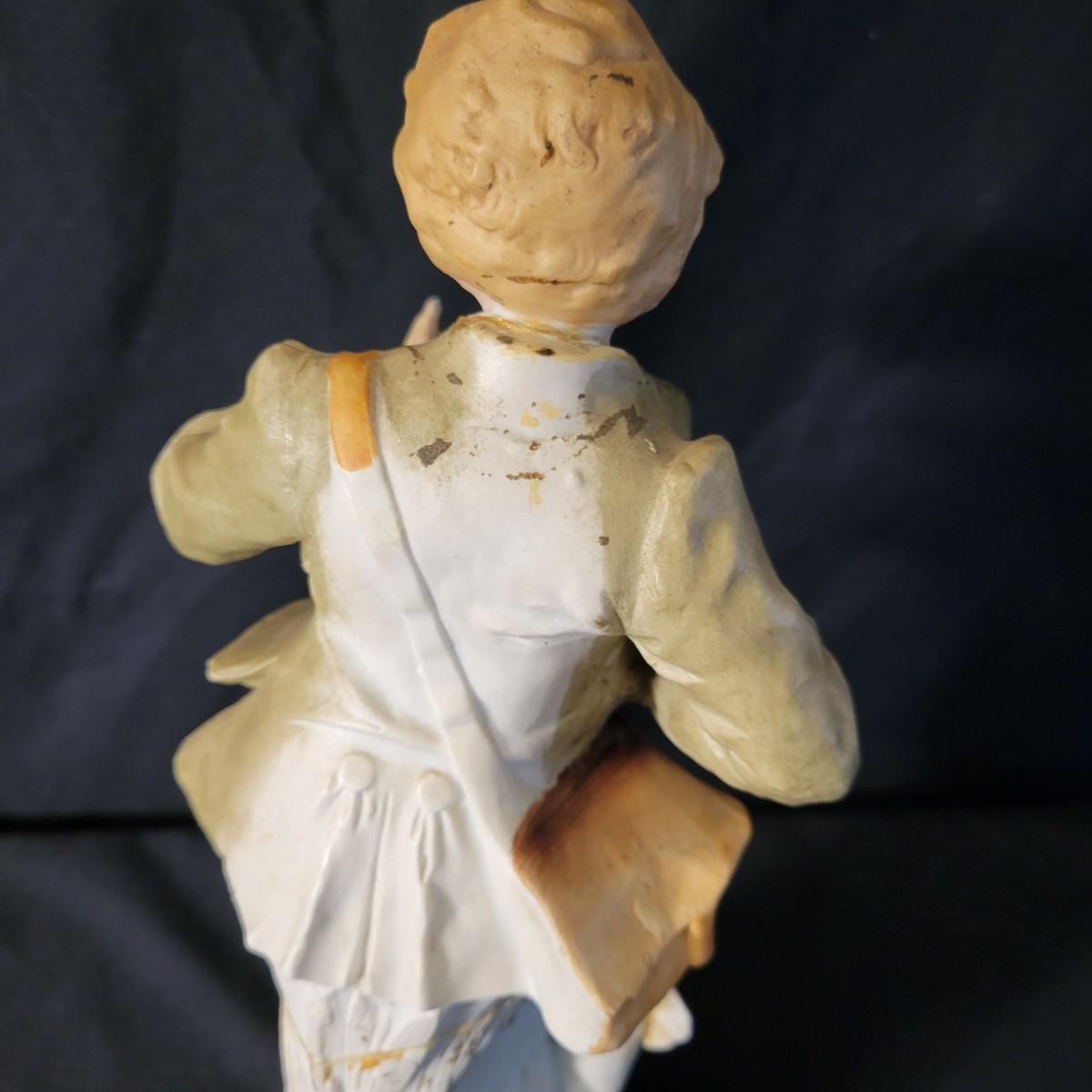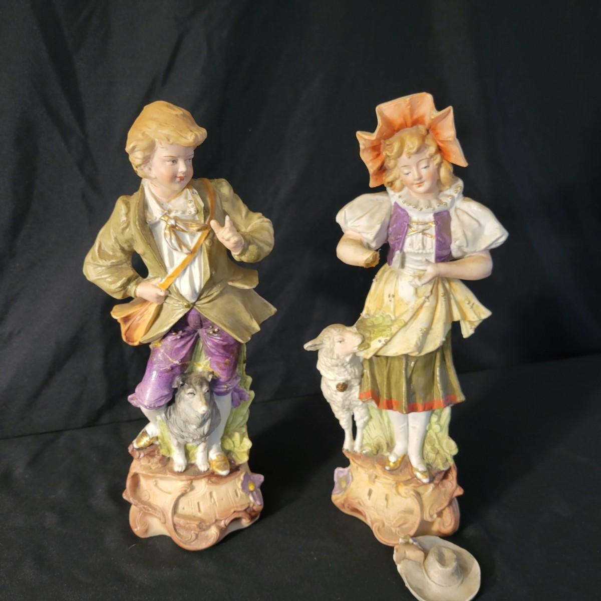 A pair of porcelain statues in fair condition with some notable damage. The boy statue has a large crack and was glued back together and the girls hand and hat has broken off. Both Statues have an imprint with the number 1863, which could be a lot number. The girl measures approximately 5" x 12.5" Shipping available