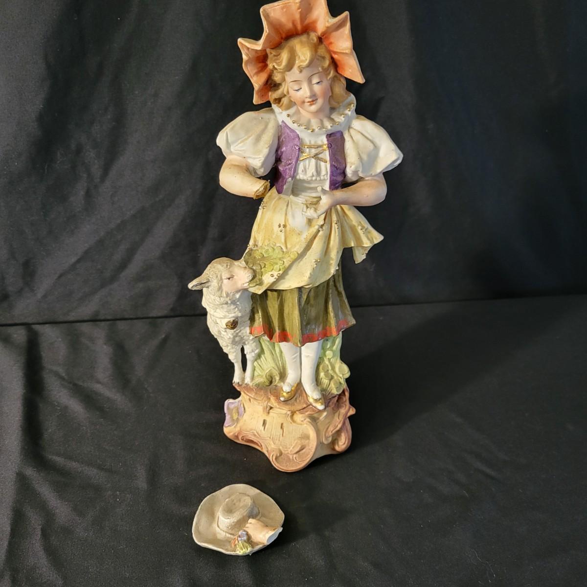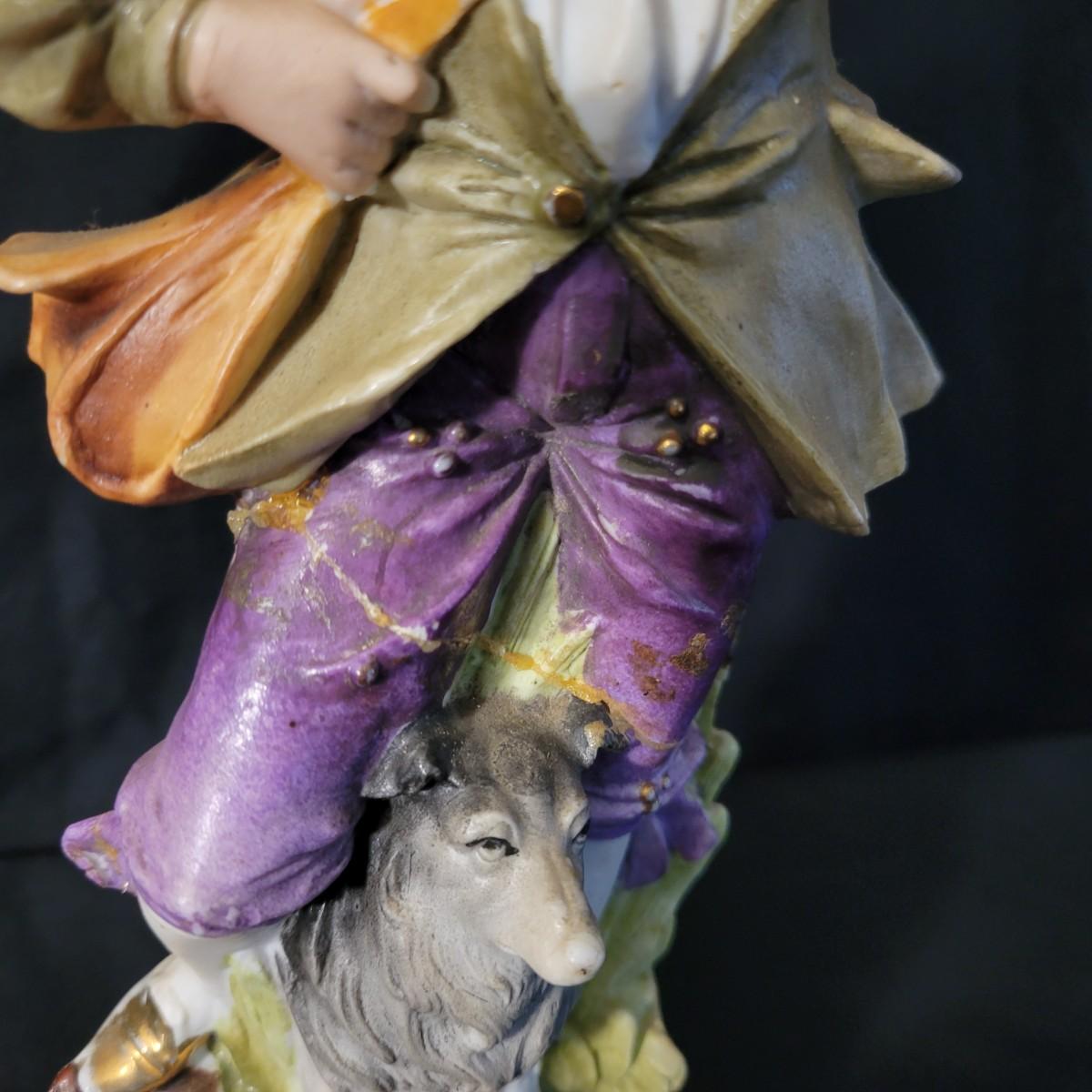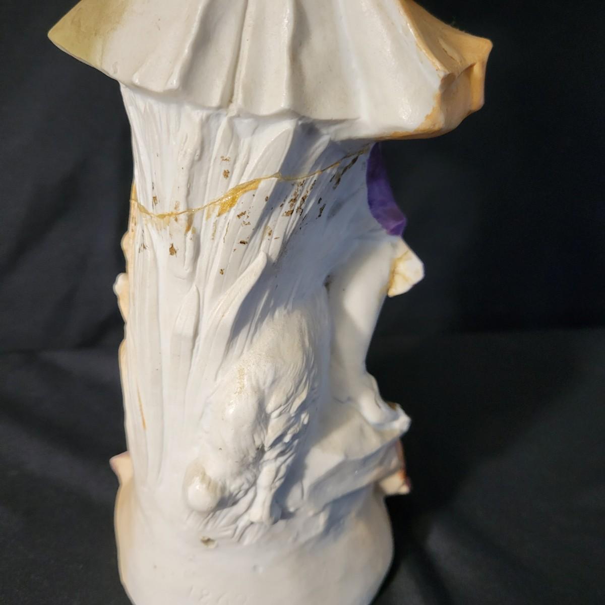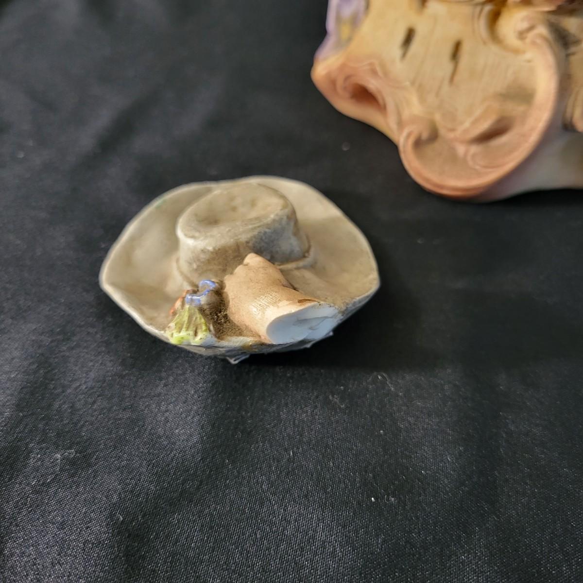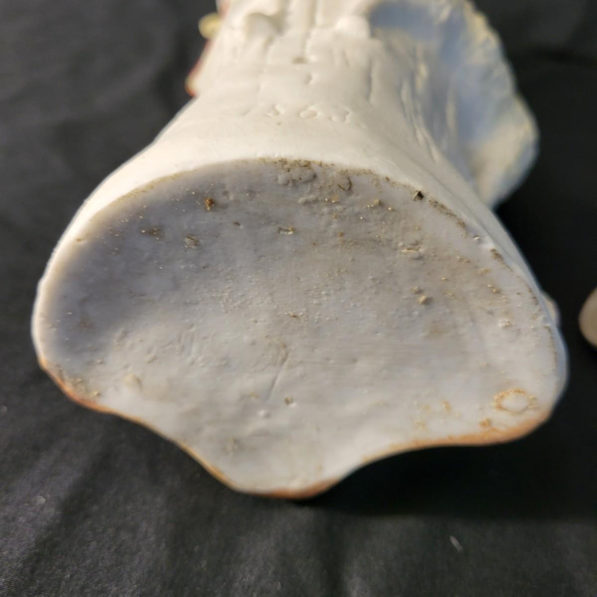 A pair of porcelain statues in fair condition with some notable damage. The boy statue has a large crack and was glued back together and the girls hand and hat has broken off. Both Statues have an imprint with the number 1863, which could be a lot number. The girl measures approximately 5" x 12.5" Shipping available