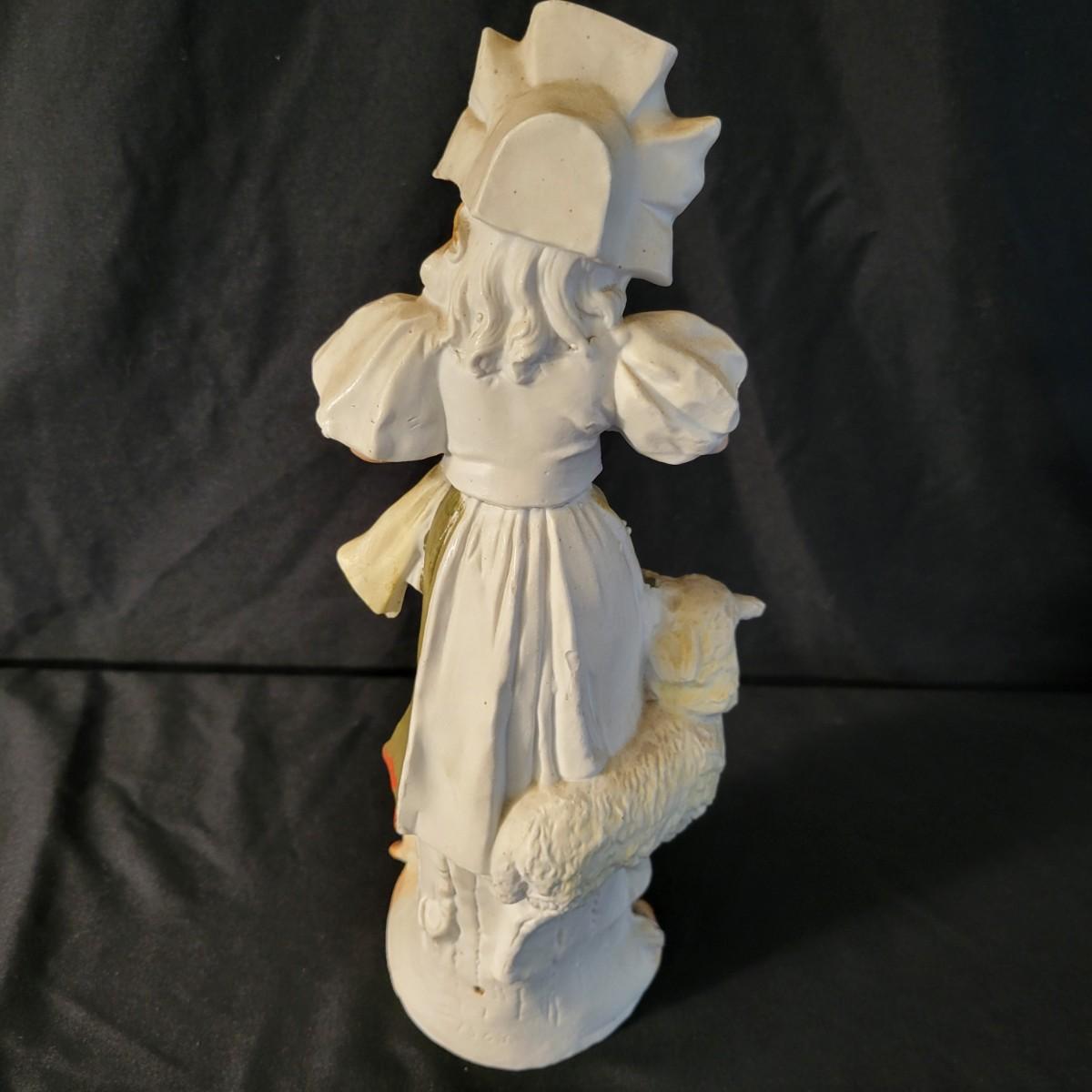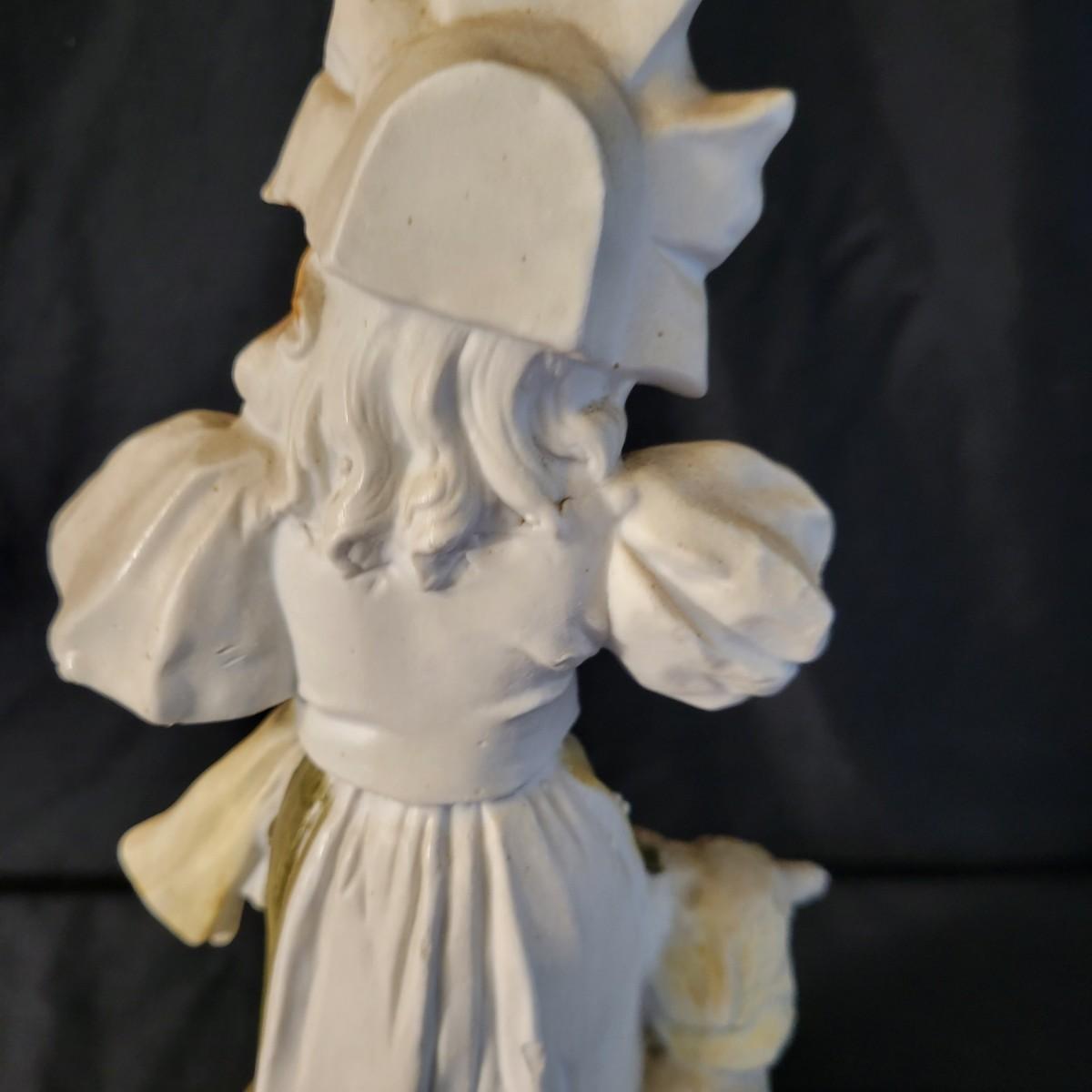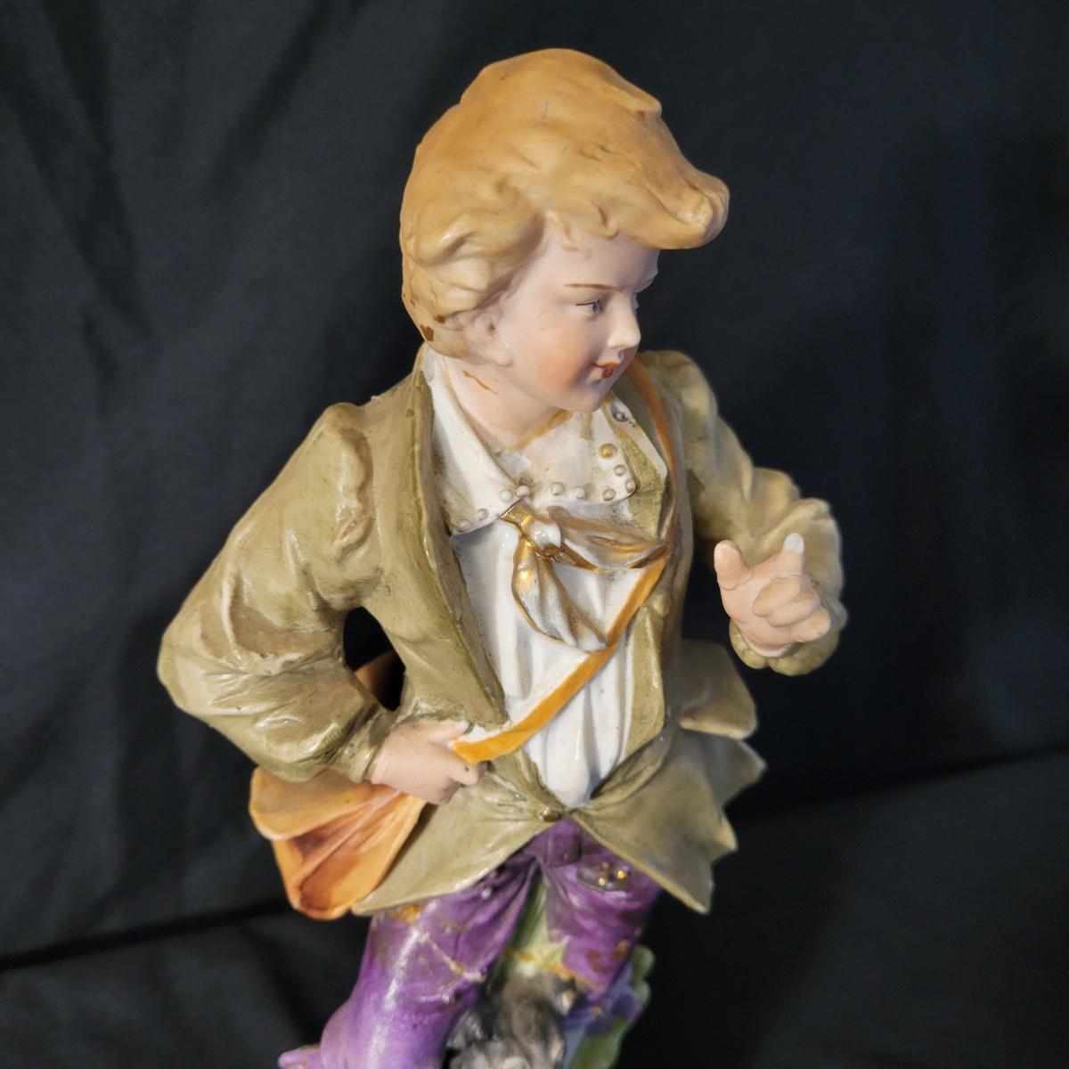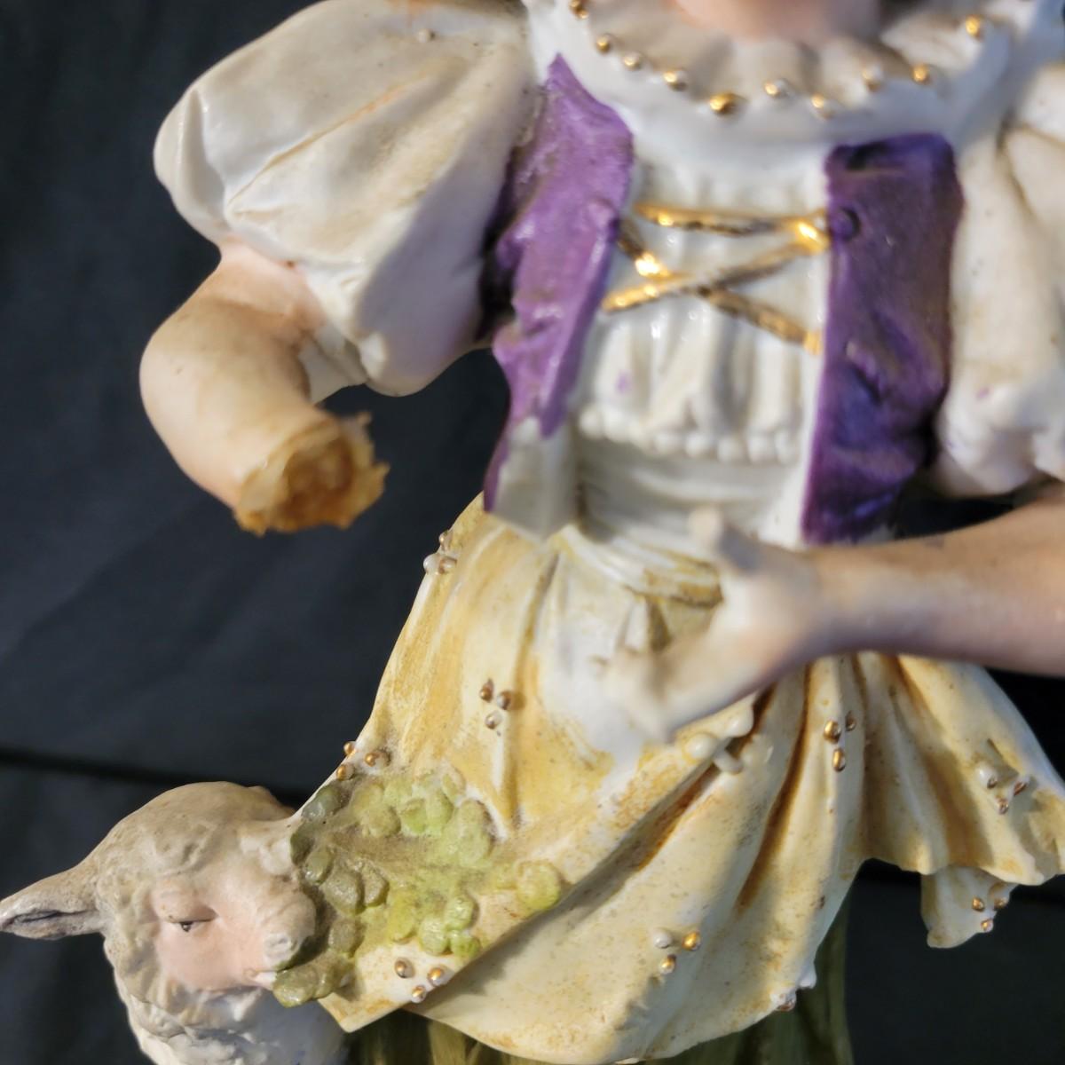 A pair of porcelain statues in fair condition with some notable damage. The boy statue has a large crack and was glued back together and the girls hand and hat has broken off. Both Statues have an imprint with the number 1863, which could be a lot number. The girl measures approximately 5" x 12.5" Shipping available