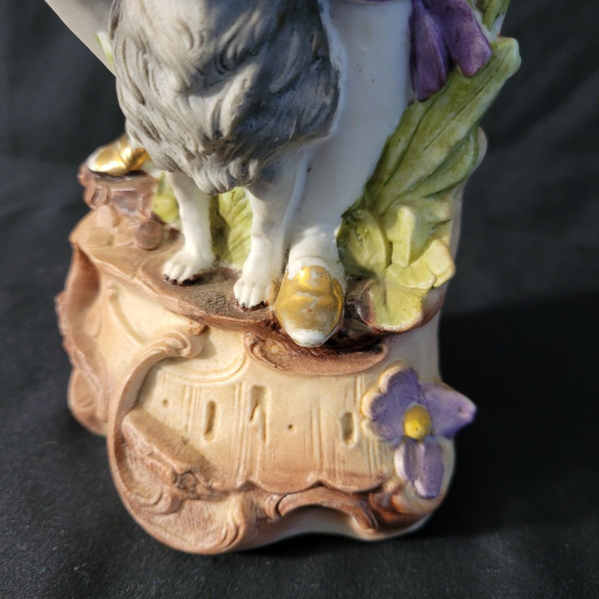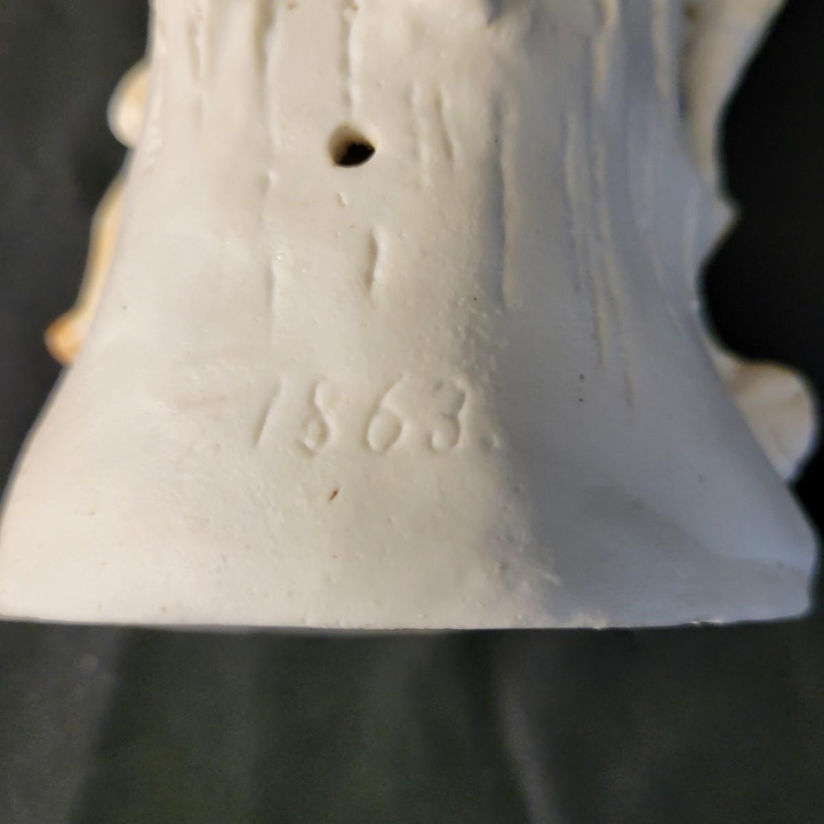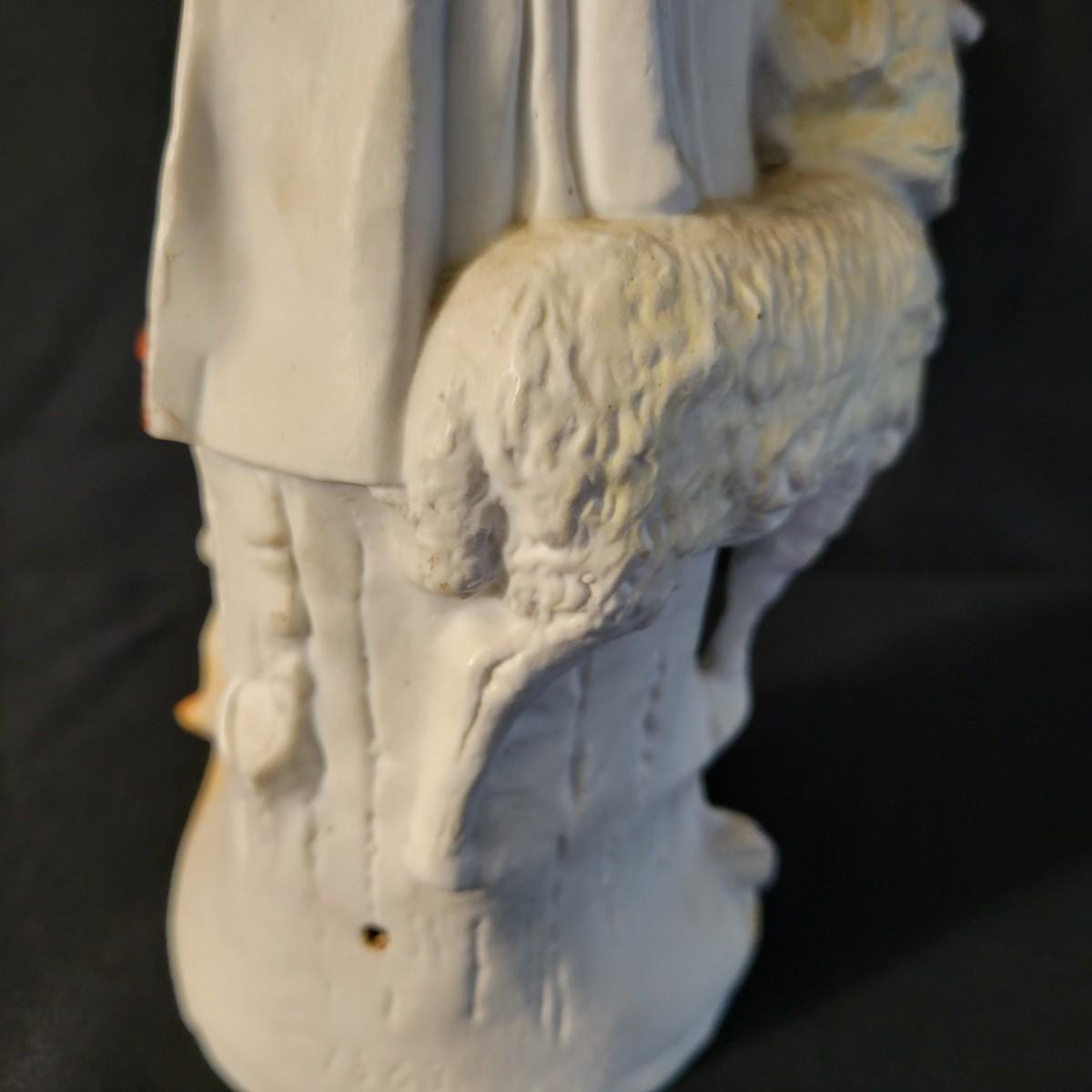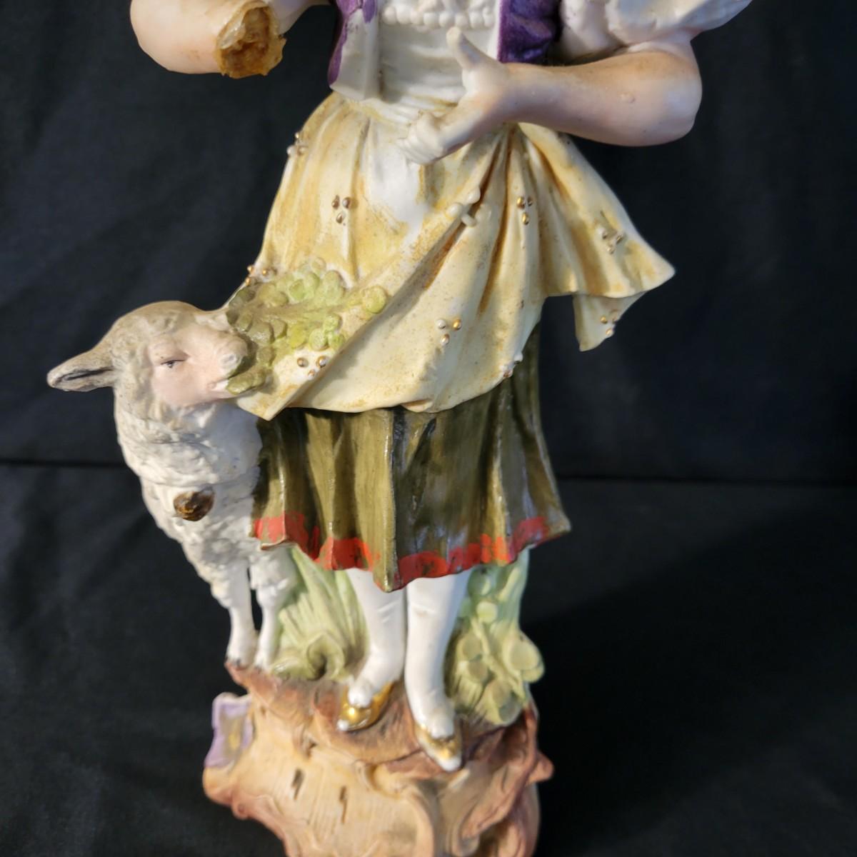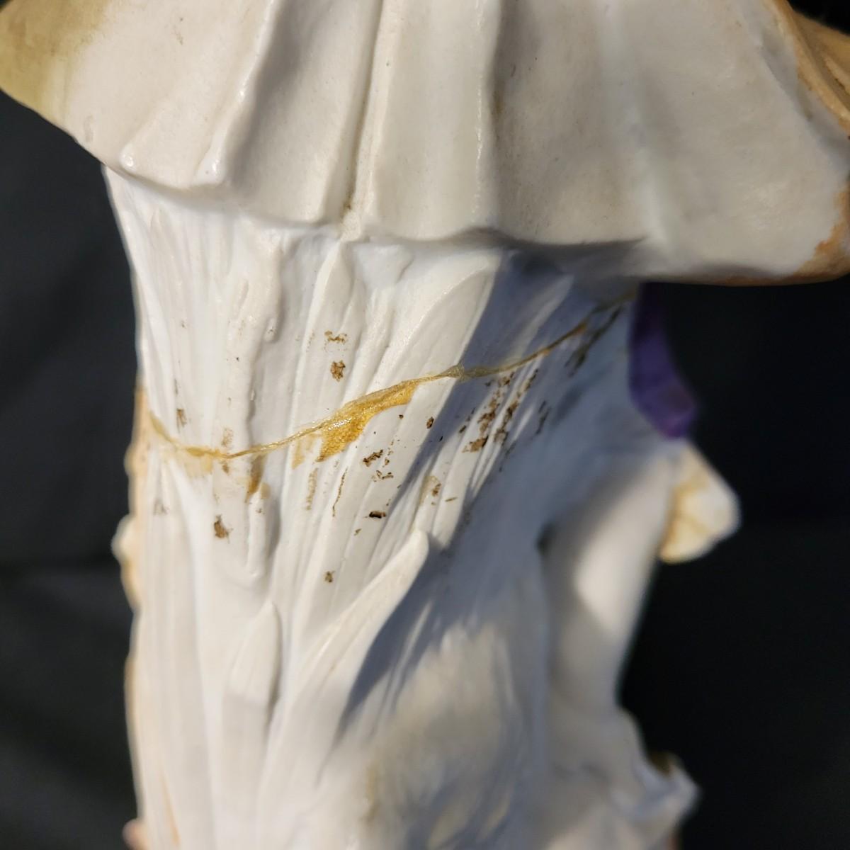 A pair of porcelain statues in fair condition with some notable damage. The boy statue has a large crack and was glued back together and the girls hand and hat has broken off. Both Statues have an imprint with the number 1863, which could be a lot number. The girl measures approximately 5" x 12.5" Shipping available