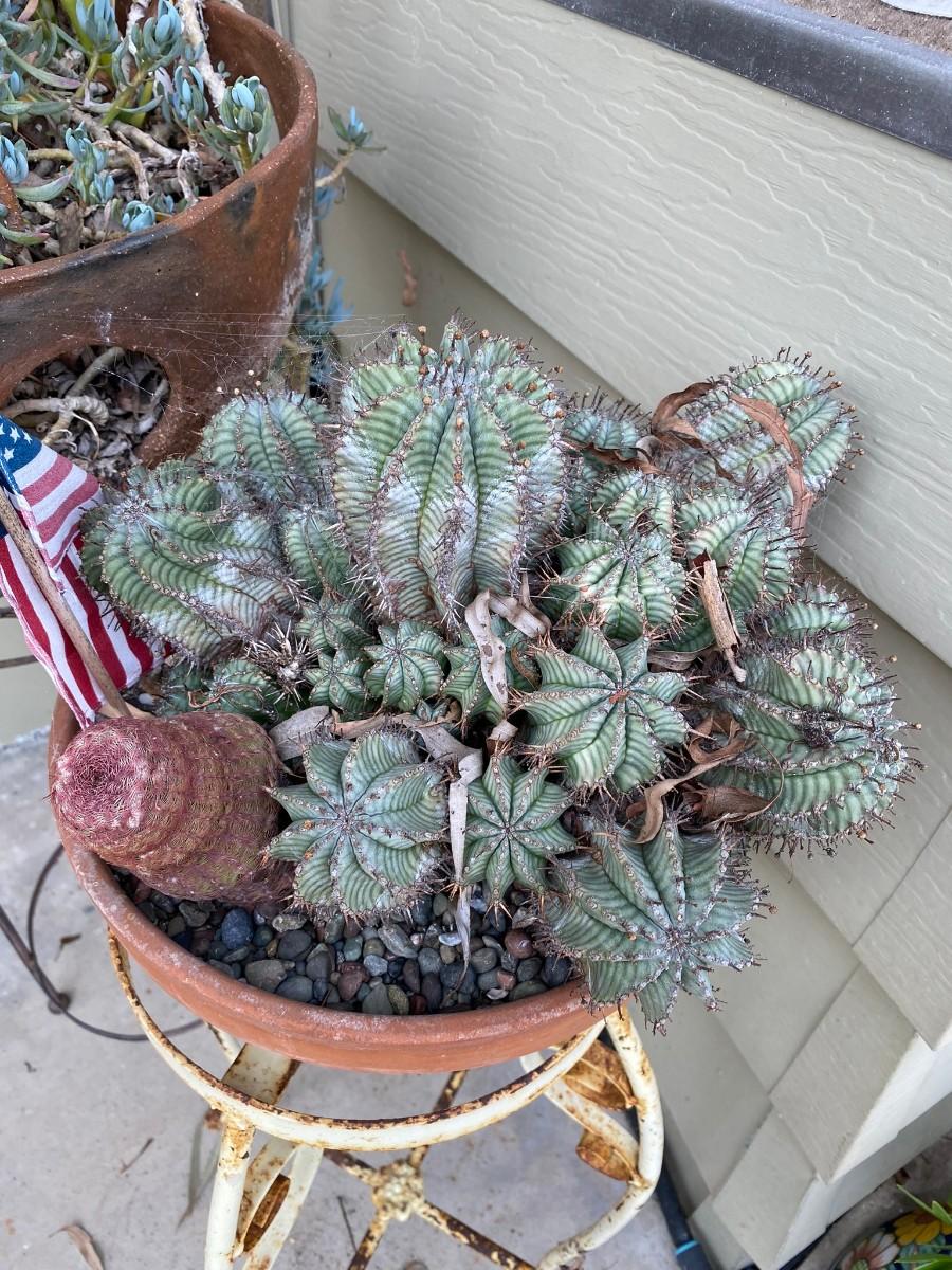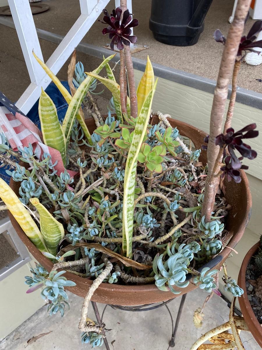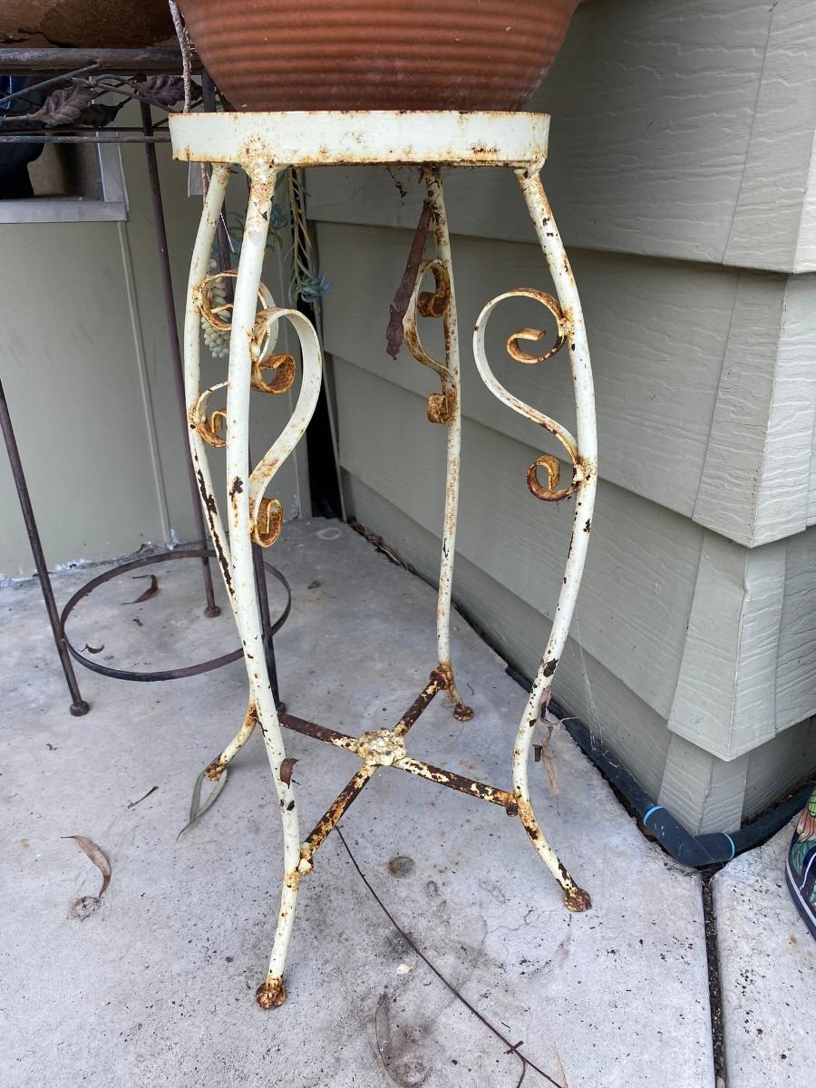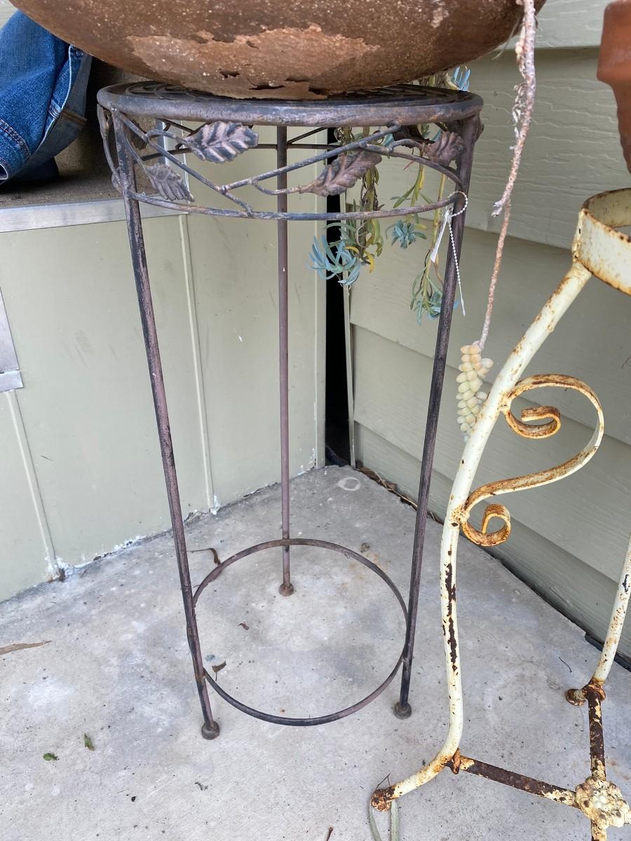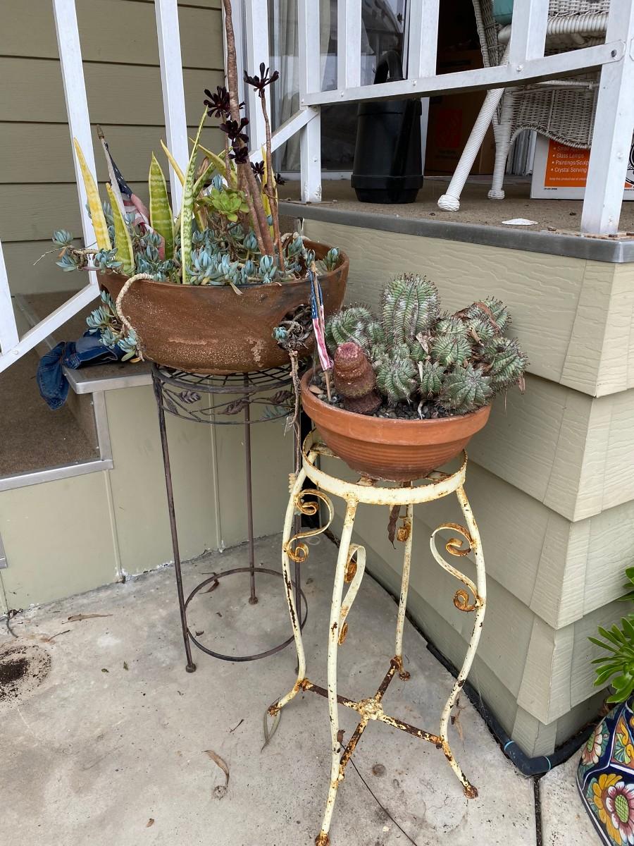 Pair of potted succulent plants in clay pots with metal plant stands. Pots and stands are weathered but sturdy. Plants are nicely established.