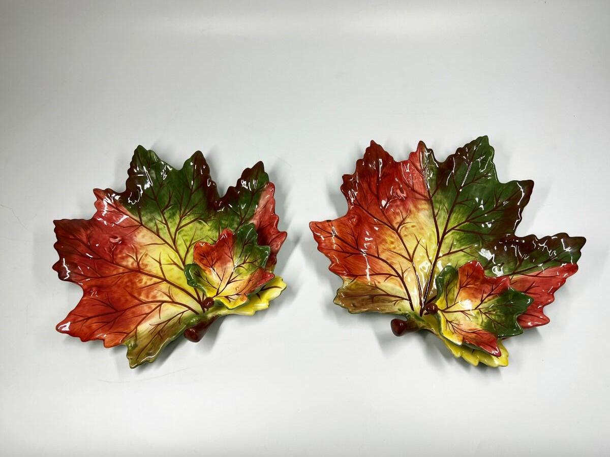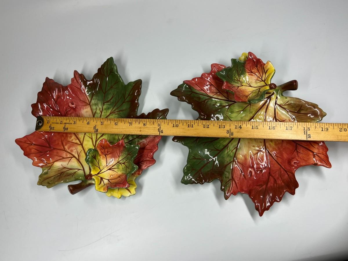 Pair of Pottery Leaf Serving Platter Chip and Dip Bowl Dishes with Attached Dip Bowl, there is no signifncant damage to either of the pieces in the lot and is in good useable condition. Check pictures for more details and for sizing.