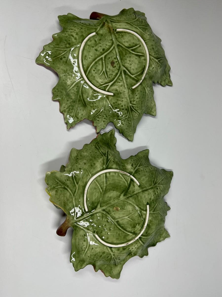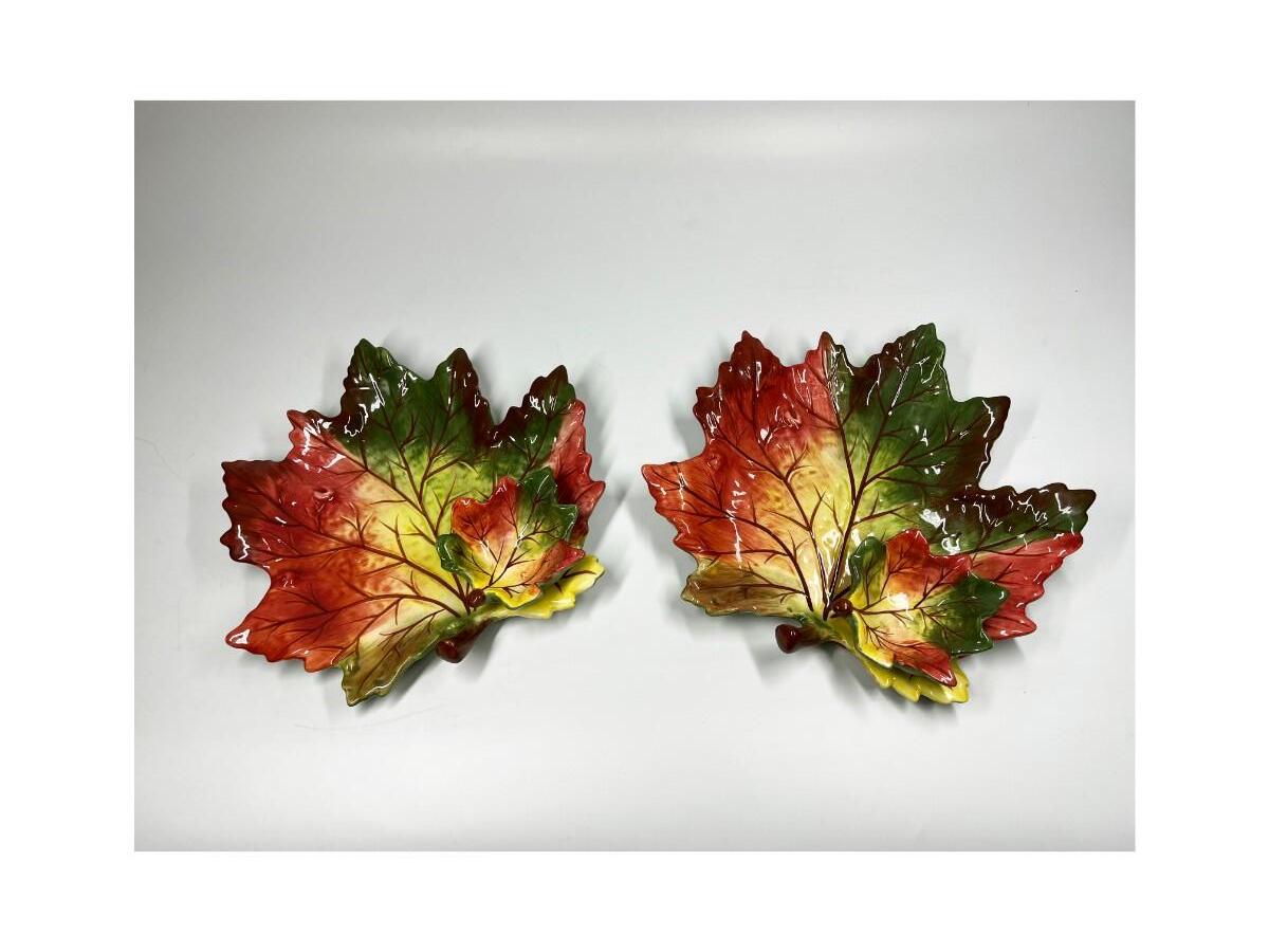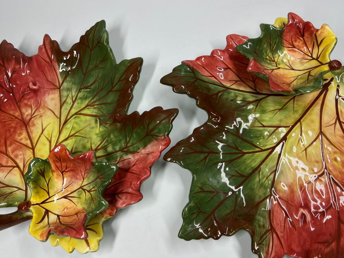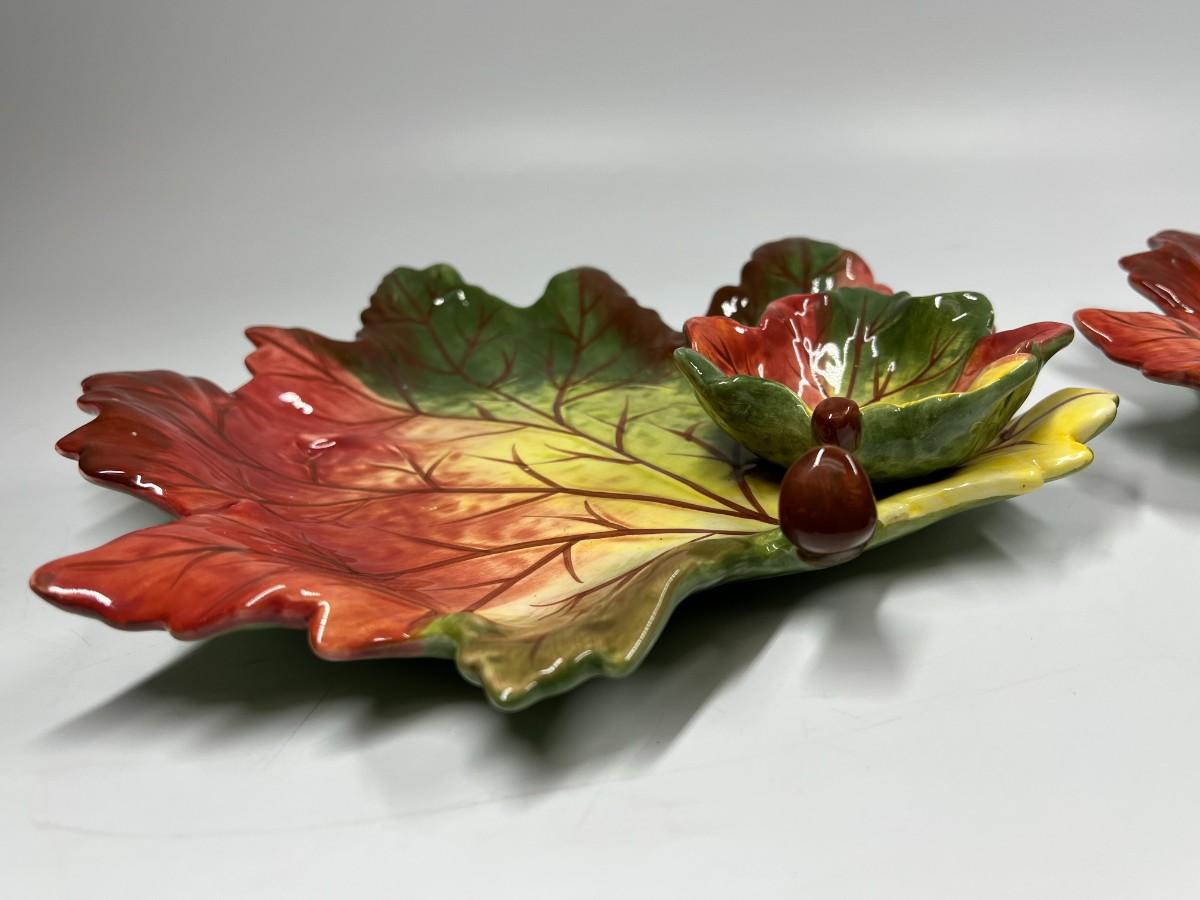 Pair of Pottery Leaf Serving Platter Chip and Dip Bowl Dishes with Attached Dip Bowl