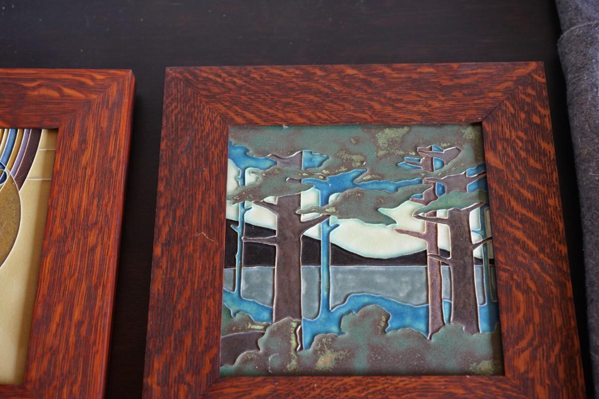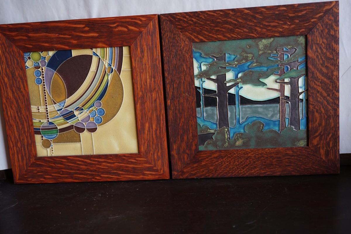 PAIR OF PRAIRIE STYLE MOTAWI TILES. FRAMED IN QUARTER SAWN OAK