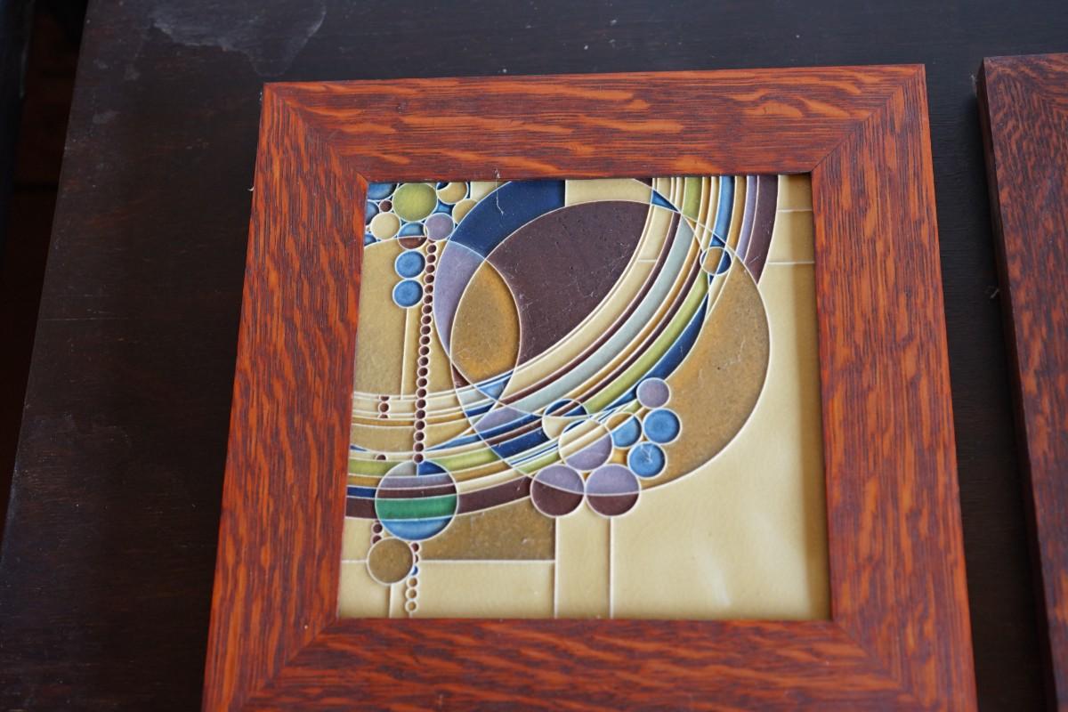 These are in the Frank Lloyd Wright prairie style and the arts and crafts style. These tiles I believe of this design are no longer available so very collectible.