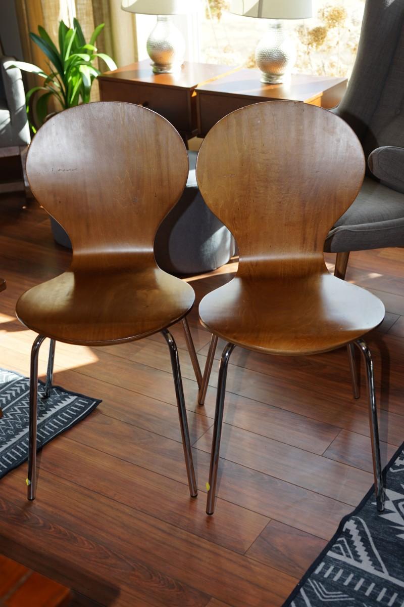 PAIR OF PRESSED TEAK PLYWOOD CHAIRS WITH CHROME BASE - THE PERFECT STACKABLE SIDE CHAIR FOR THE MCM HOME