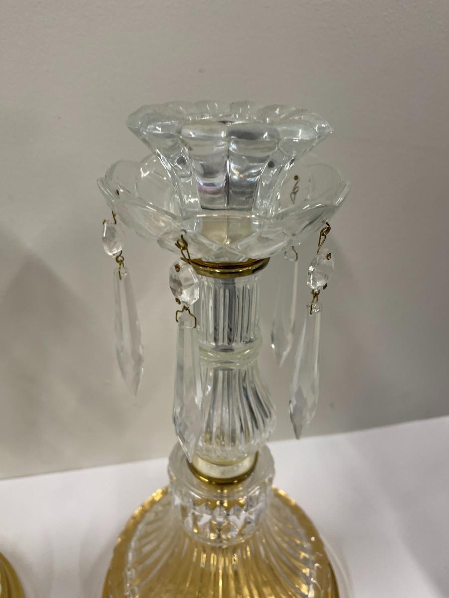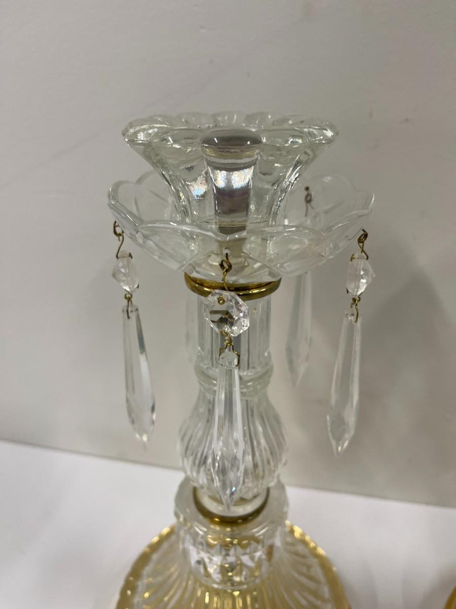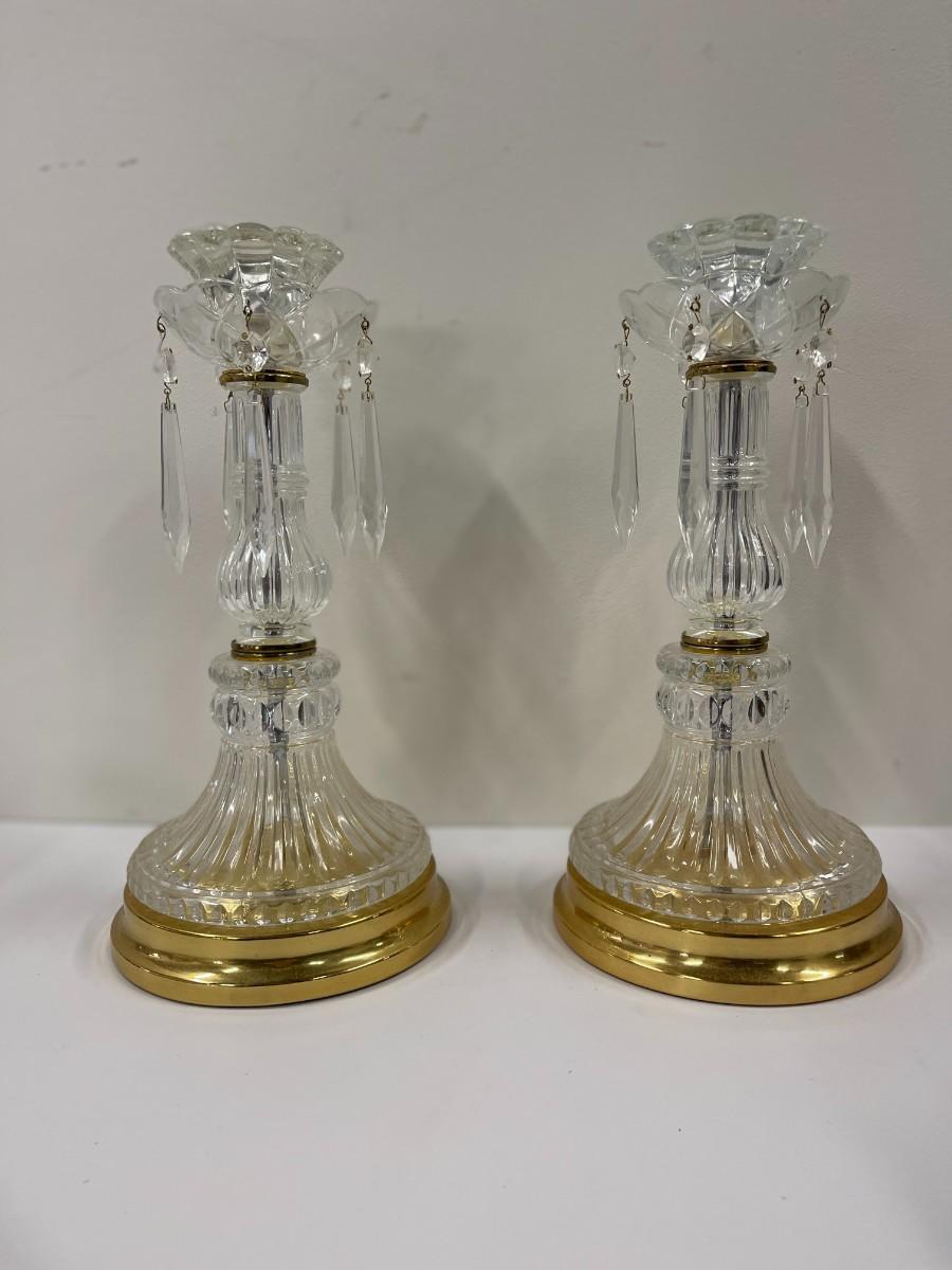 Pair of glass candelabras with bobeches and prisms. Very good condition. Minor wear to the brass bases. 13" tall x 6 1/2" diameter. # 993