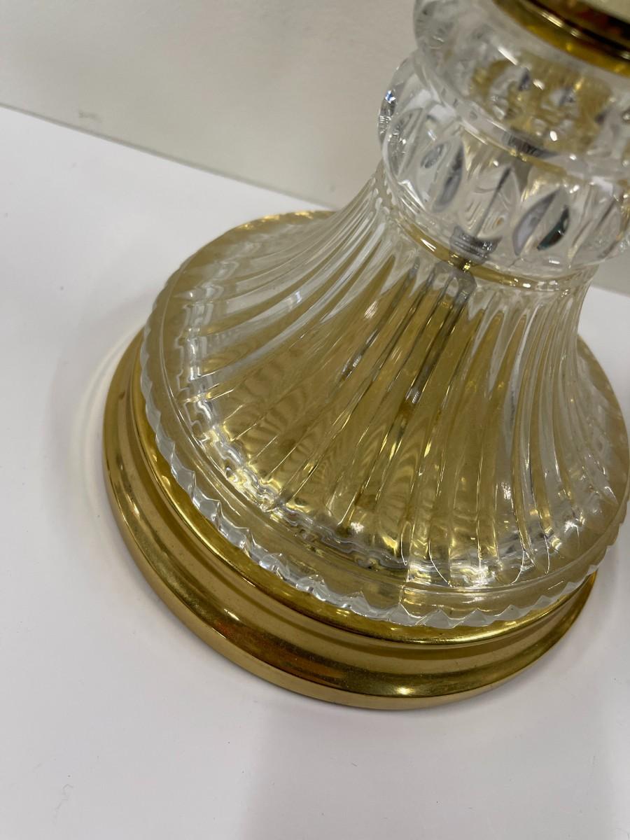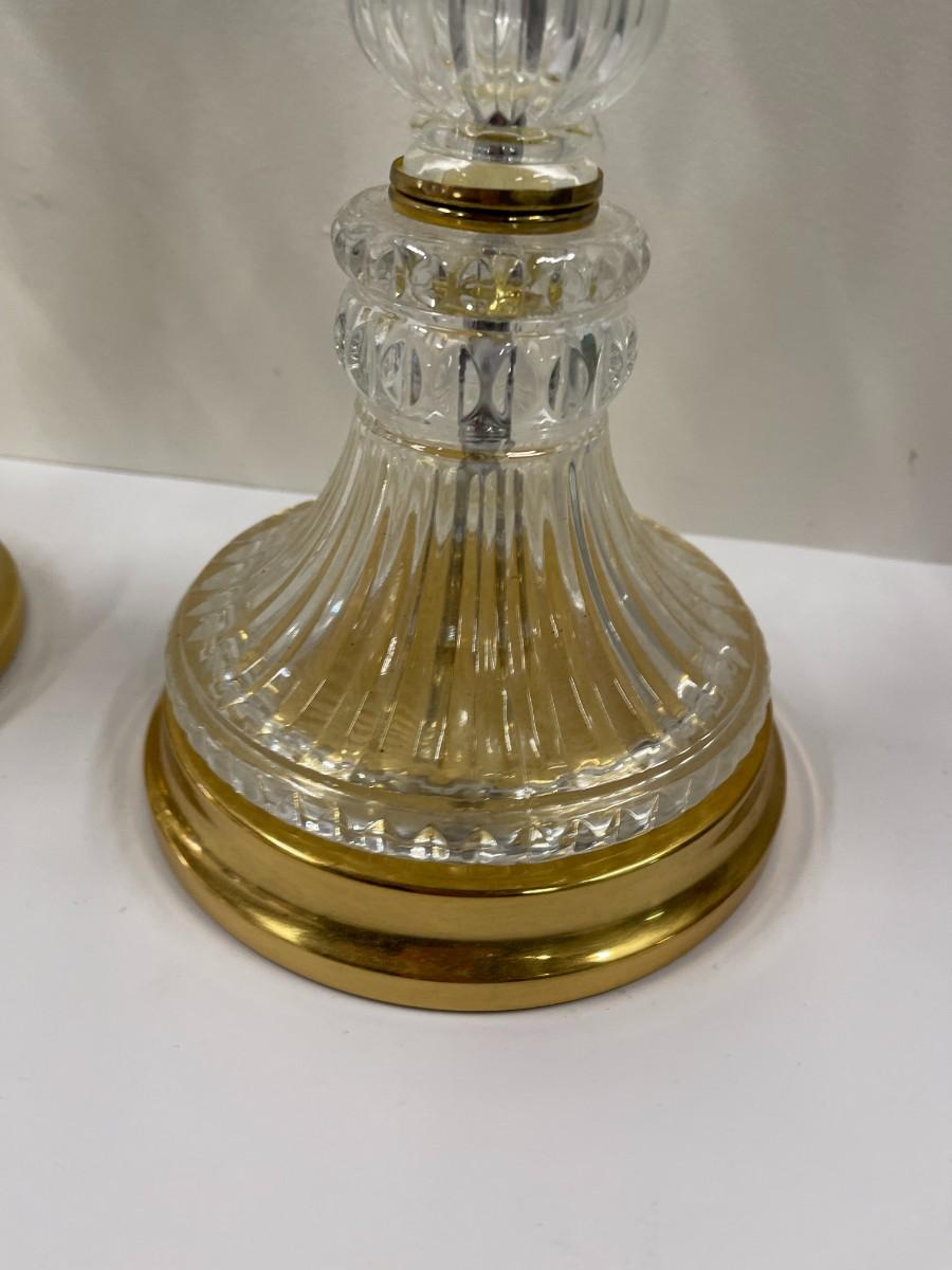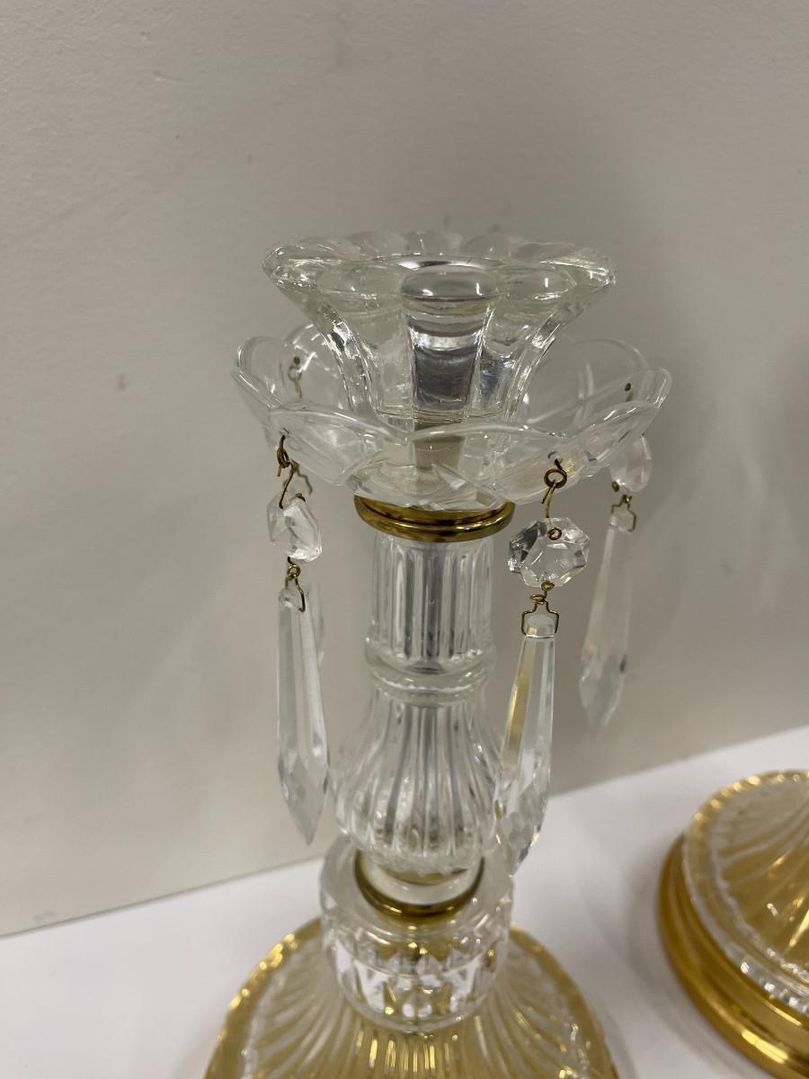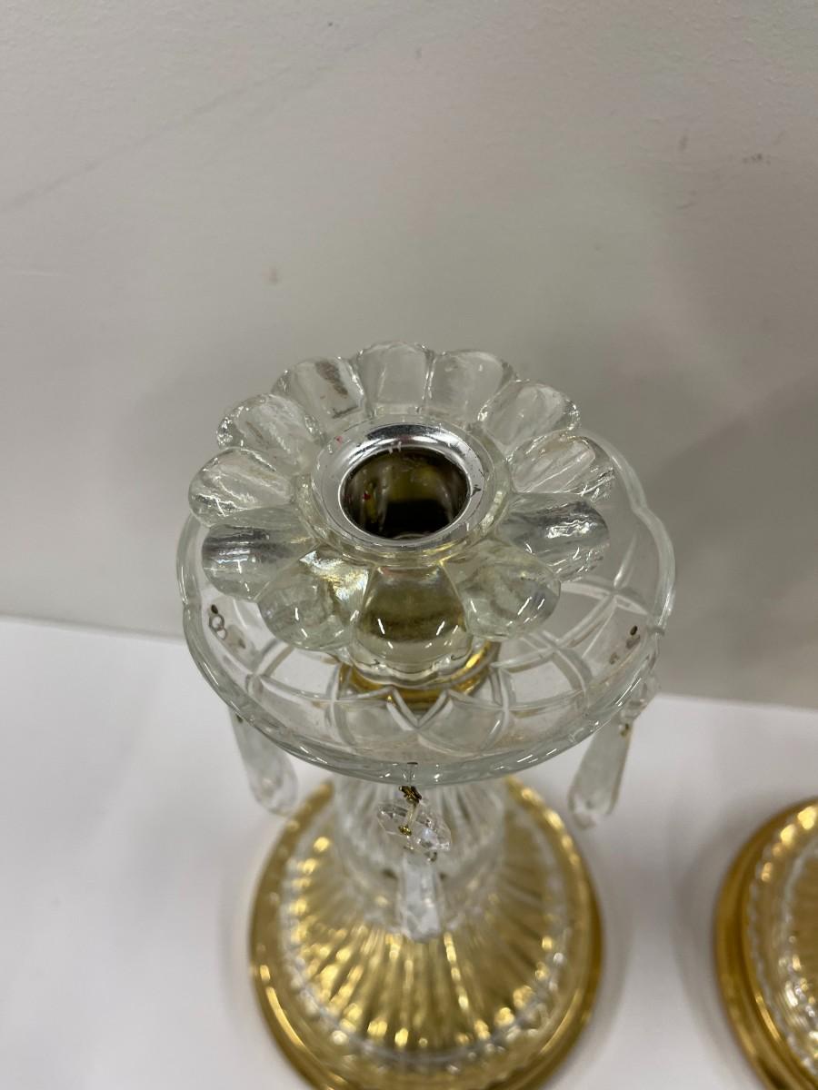 Pair of glass candelabras with bobeches and prisms. Very good condition. Minor wear to the brass bases. 13" tall x 6 1/2" diameter. # 993