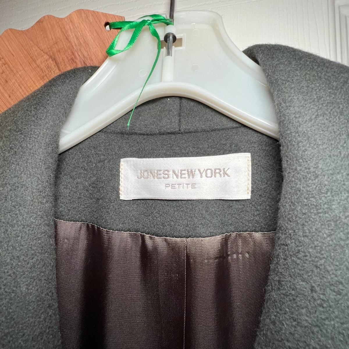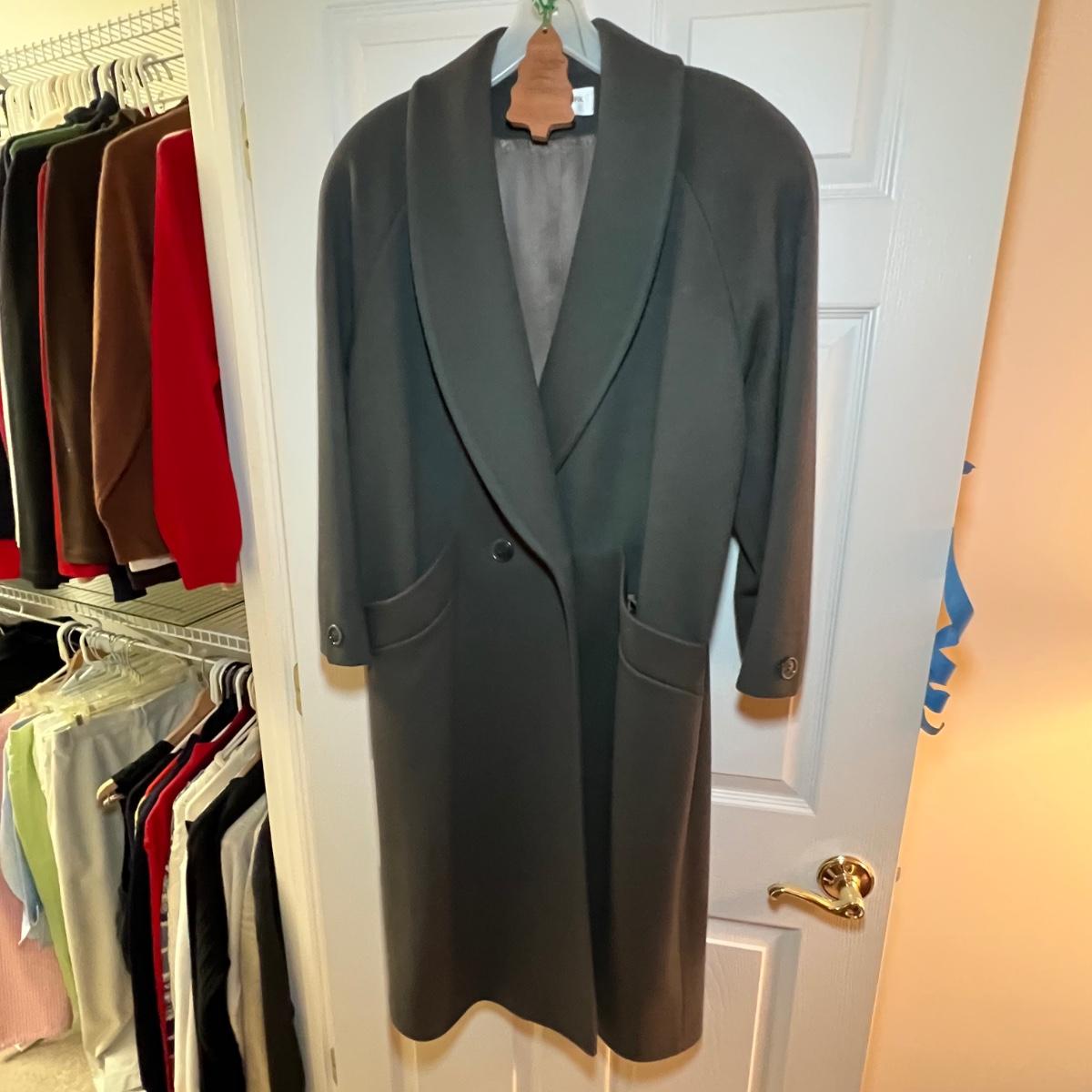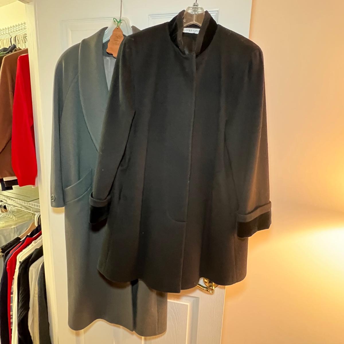 Two pure wool jackets here that includes a green Jones New York petite coat that measures 22” x 24” x 46”. The black coat is size 8 and both jackets are lined. Dust jacket cover is included.