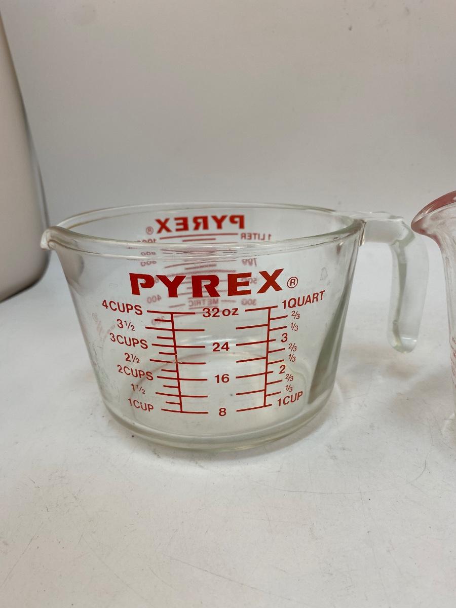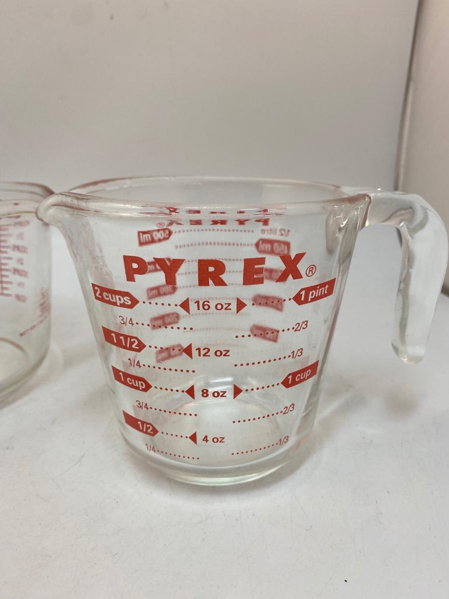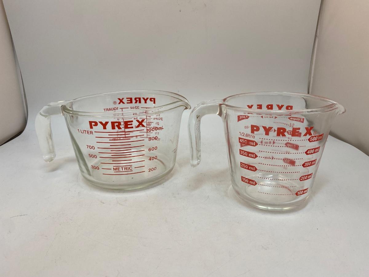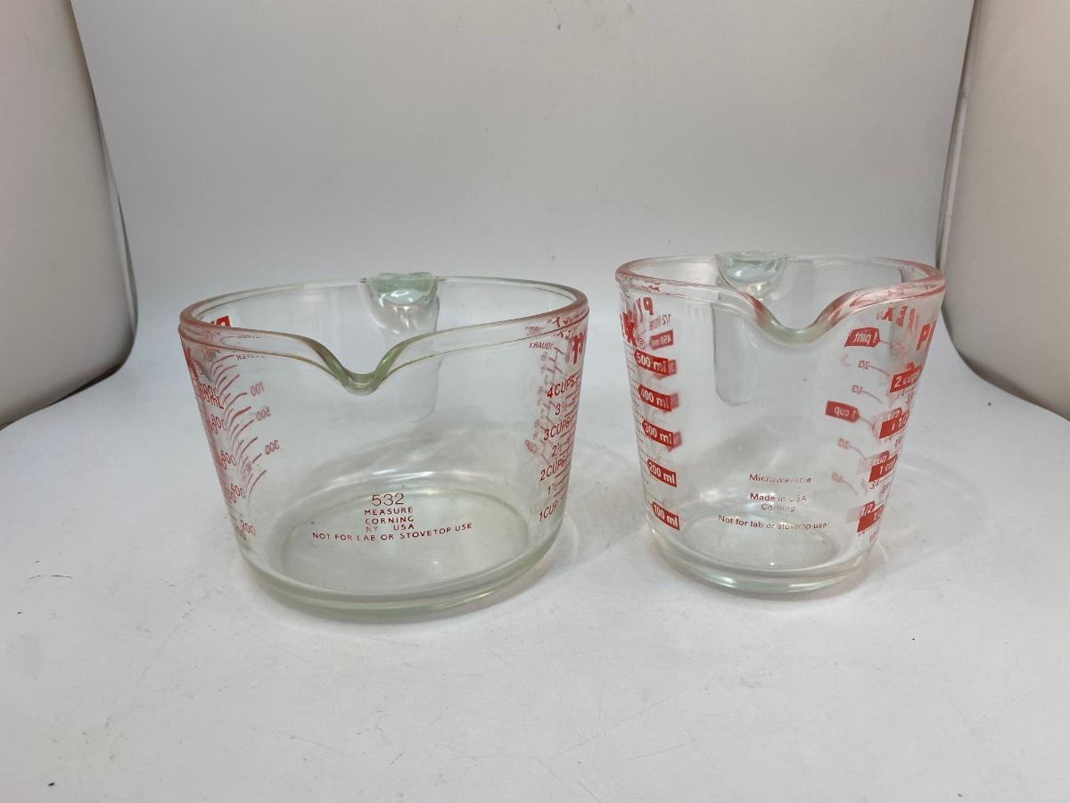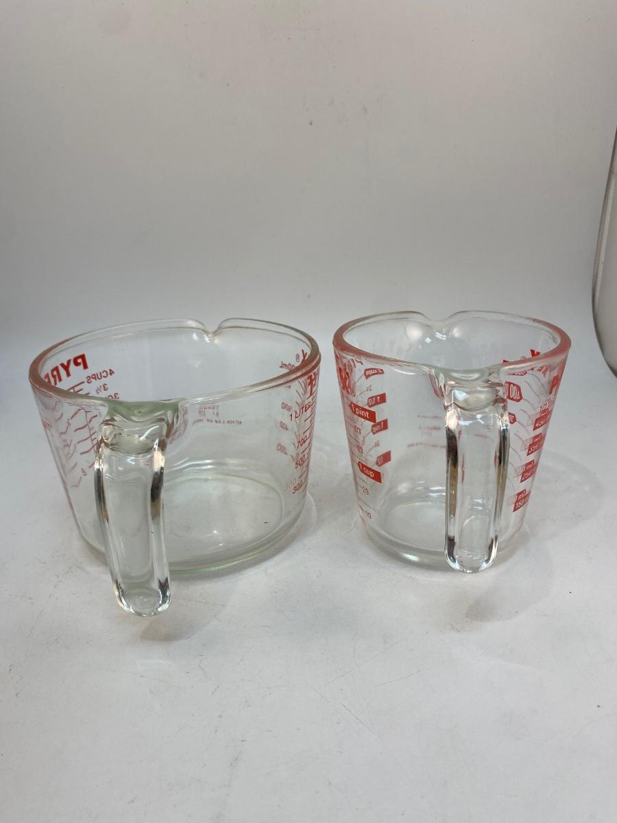 Pair of Pyrex Glass Spouted Measuring Cups. 2 cup and 4 cup size. In good used condition.