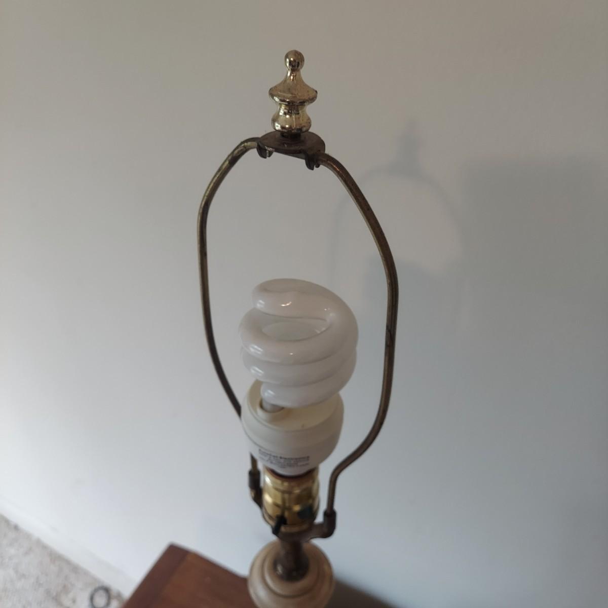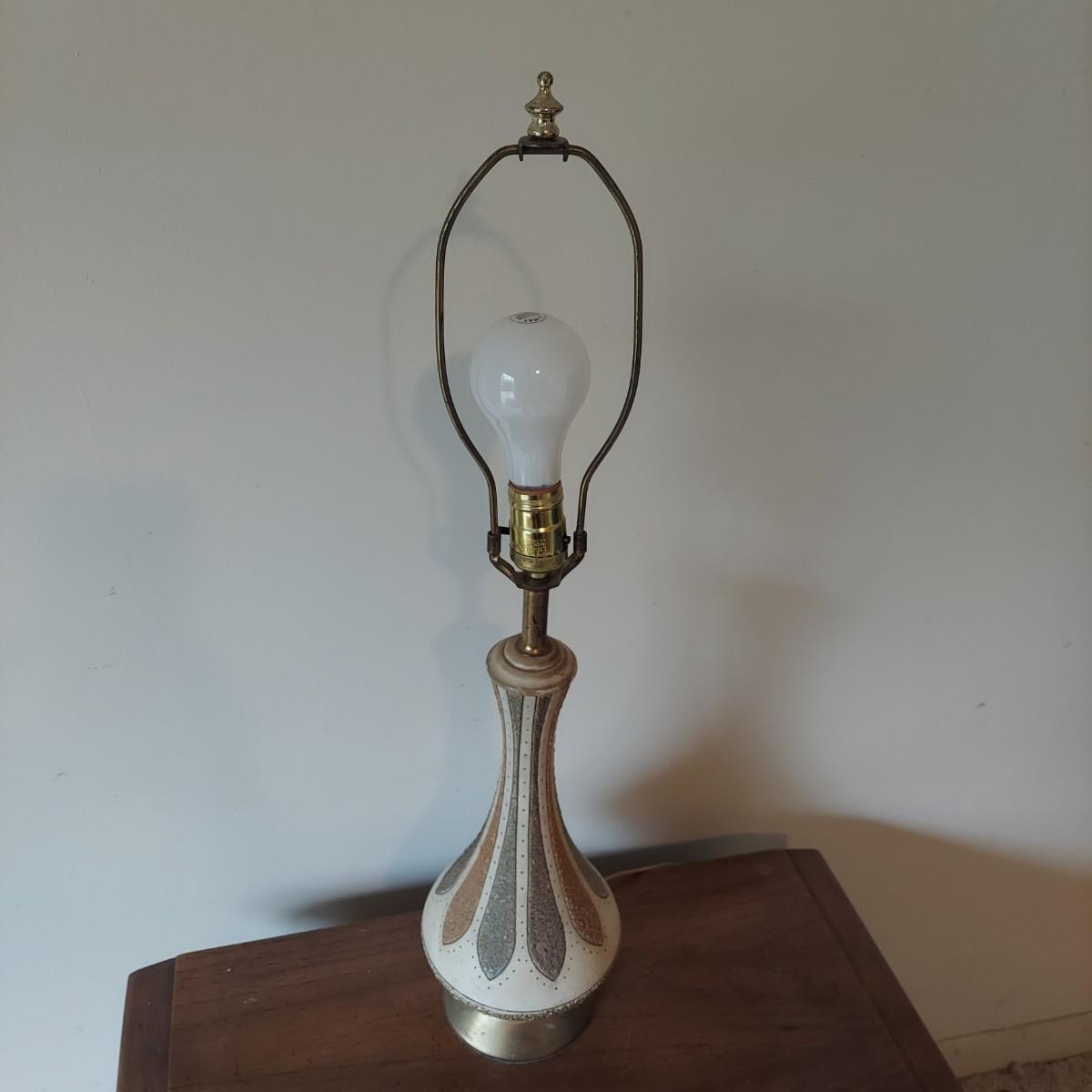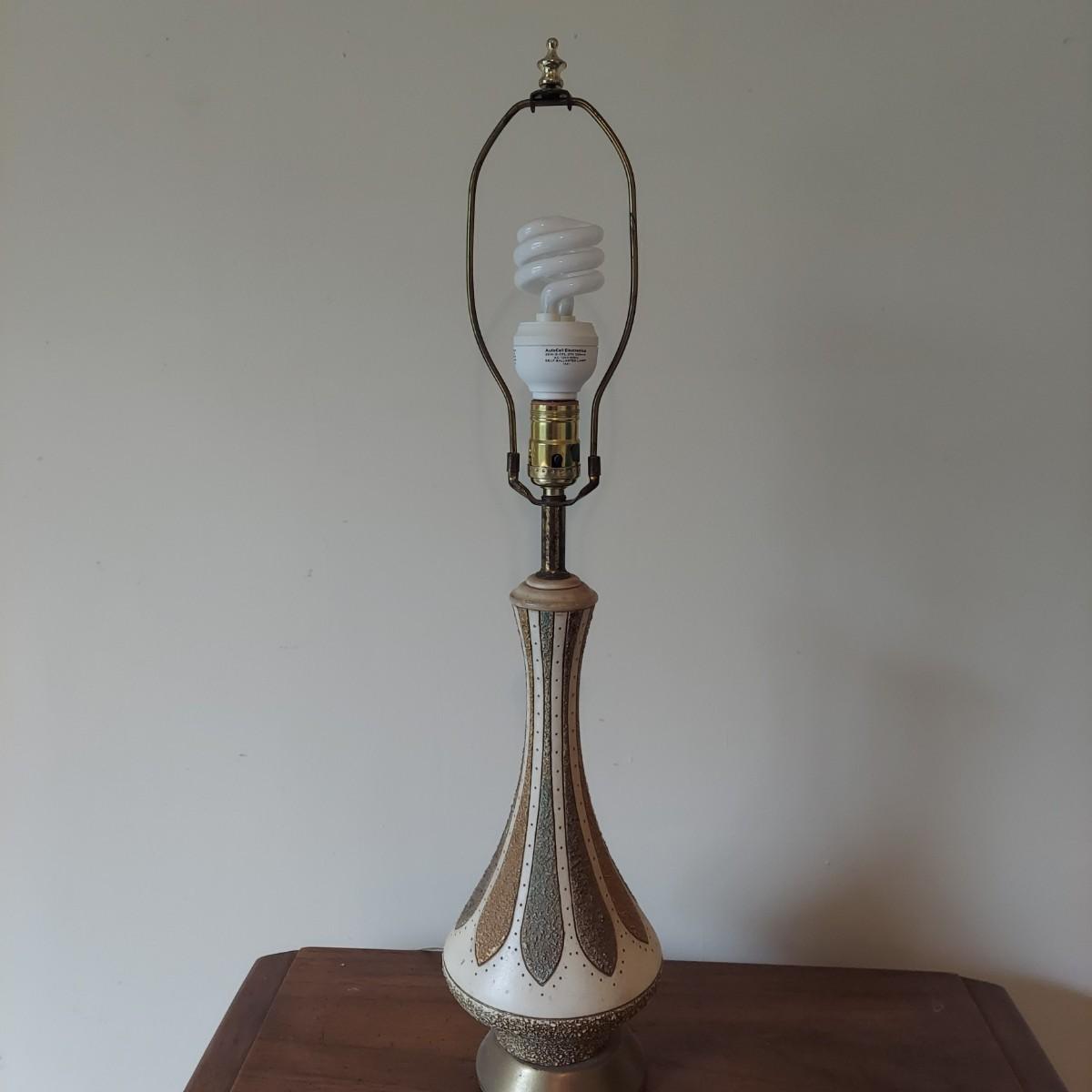 Two lamps that appear to Quartite Creative Corp. style stone-like lamps with brass accents. There are no visible tags or markings. They each measure 27"H. These do not come with shades but do have finials. Shipping available. Shipping certain items can be costly. We suggest contacting our preferred local shipping provider, Postage Express, with dimensions and getting an estimate before bidding: (828) 670-5501 or shipping@postageexpressnc.com
