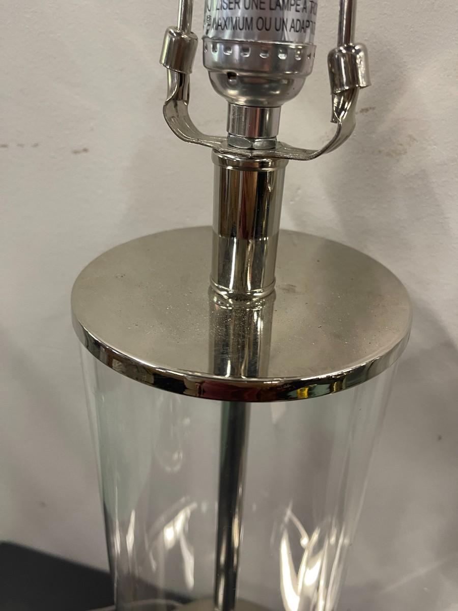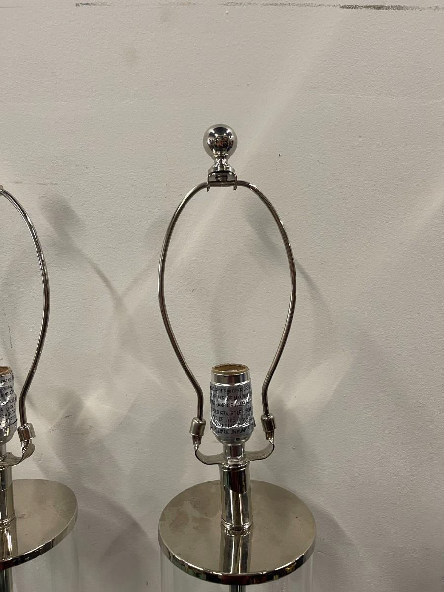 Pair of Ralph Lauren glass and chrome table lamps. They do not come with shades. One has a small dent in the base and the other has a damaged brand tag. Untested. 28" high to the top of the finial.