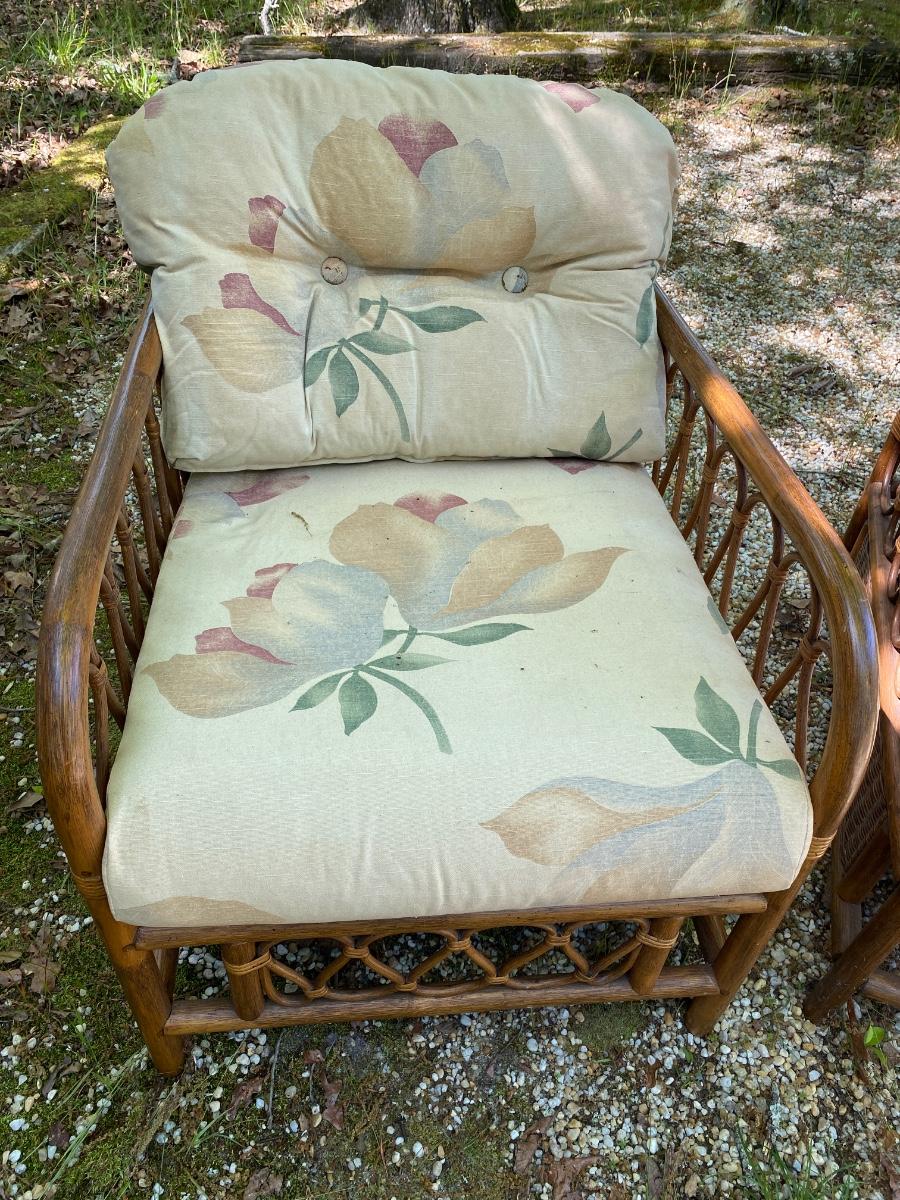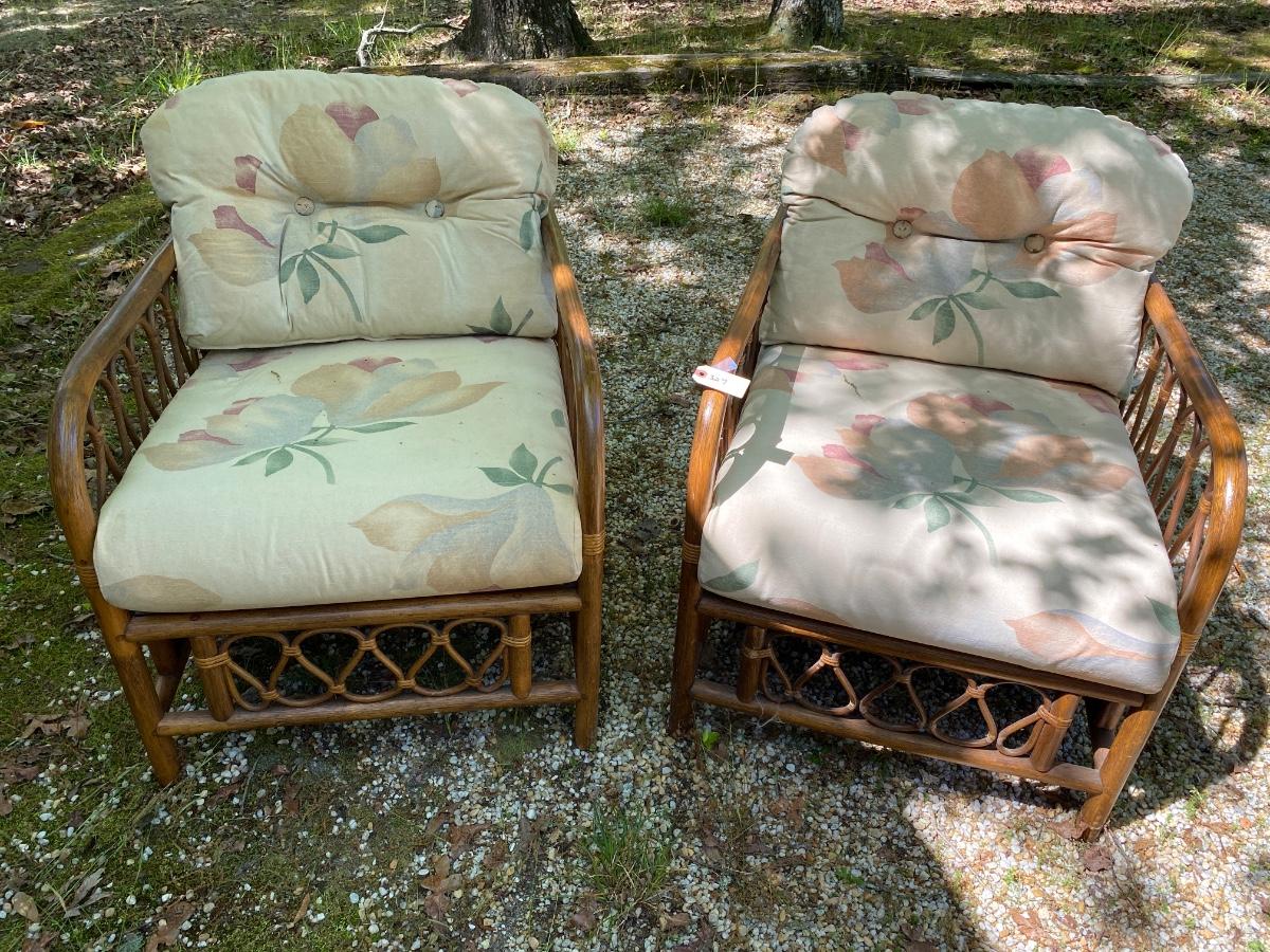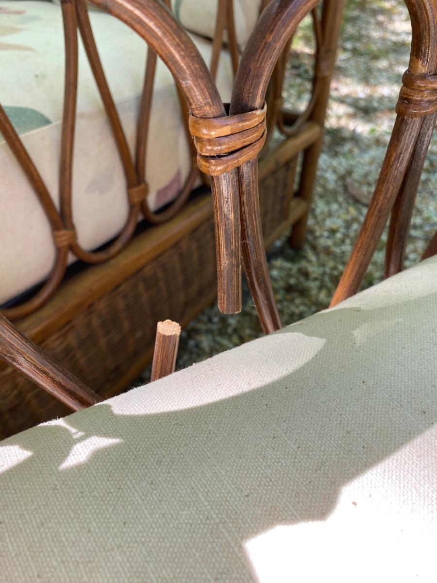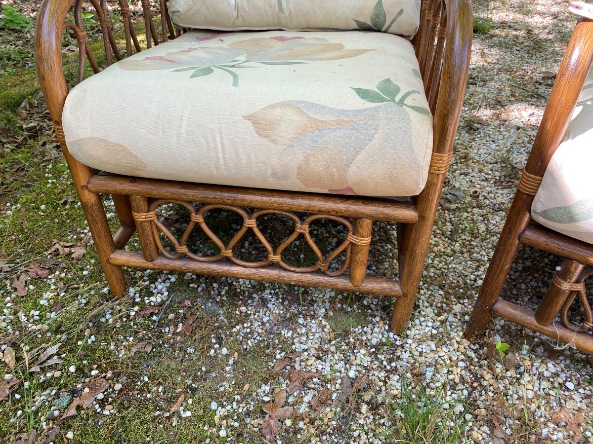 Pair of Ratan accent chairs, one piece of fretwork is damaged as pictured