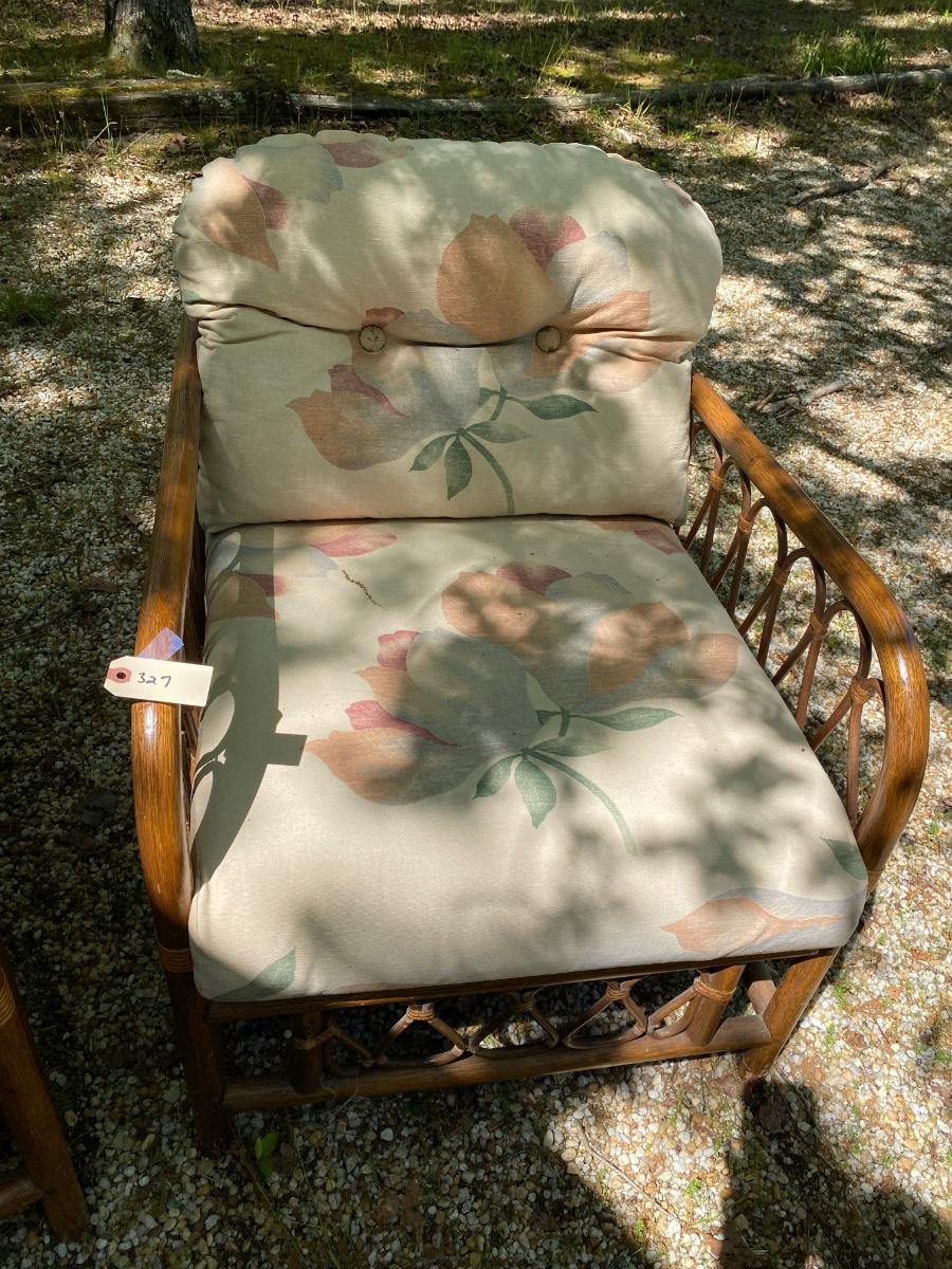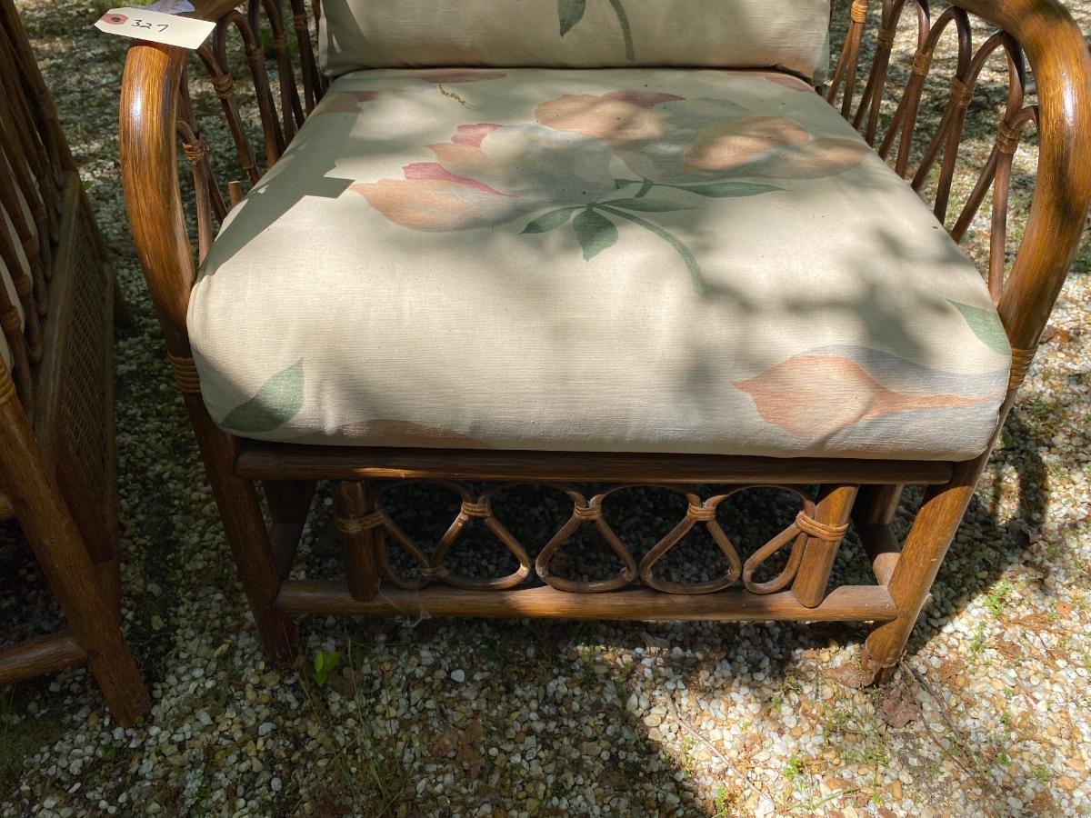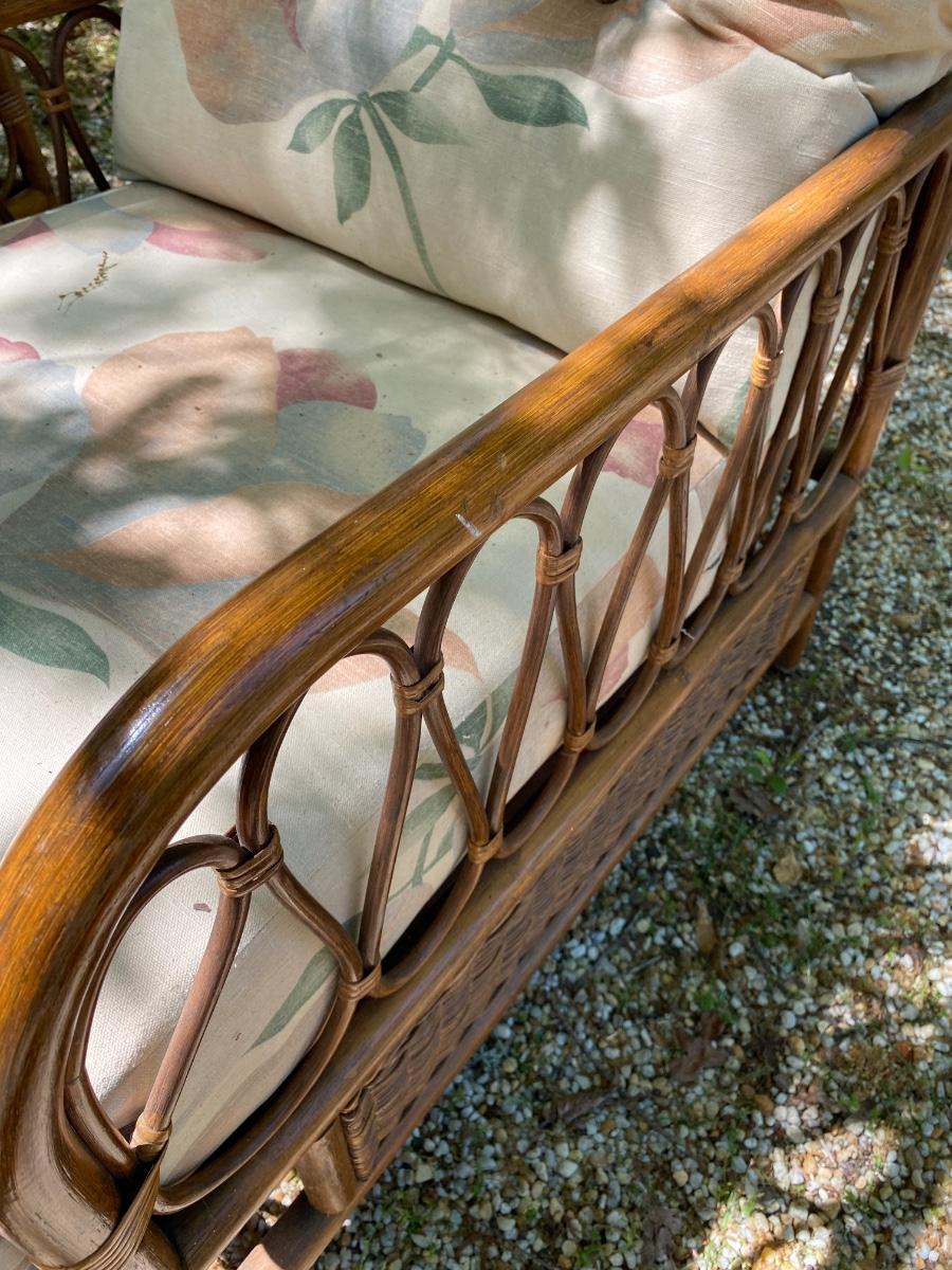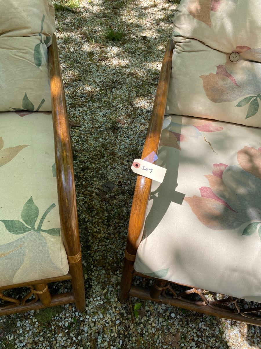 Pair of Ratan accent chairs, one piece of fretwork is damaged as pictured
