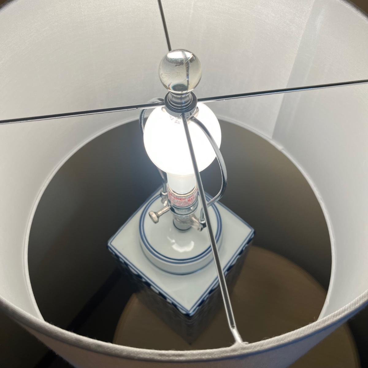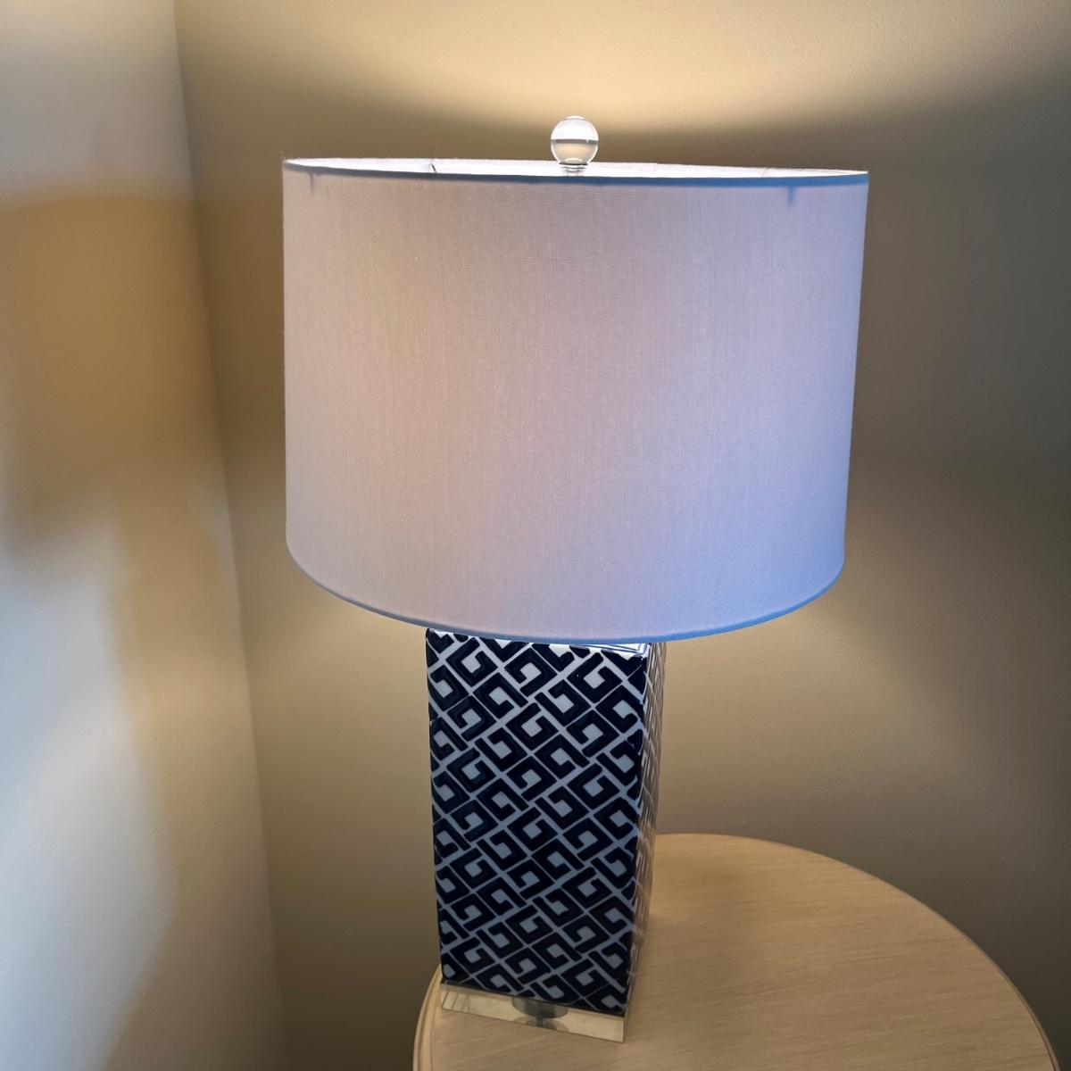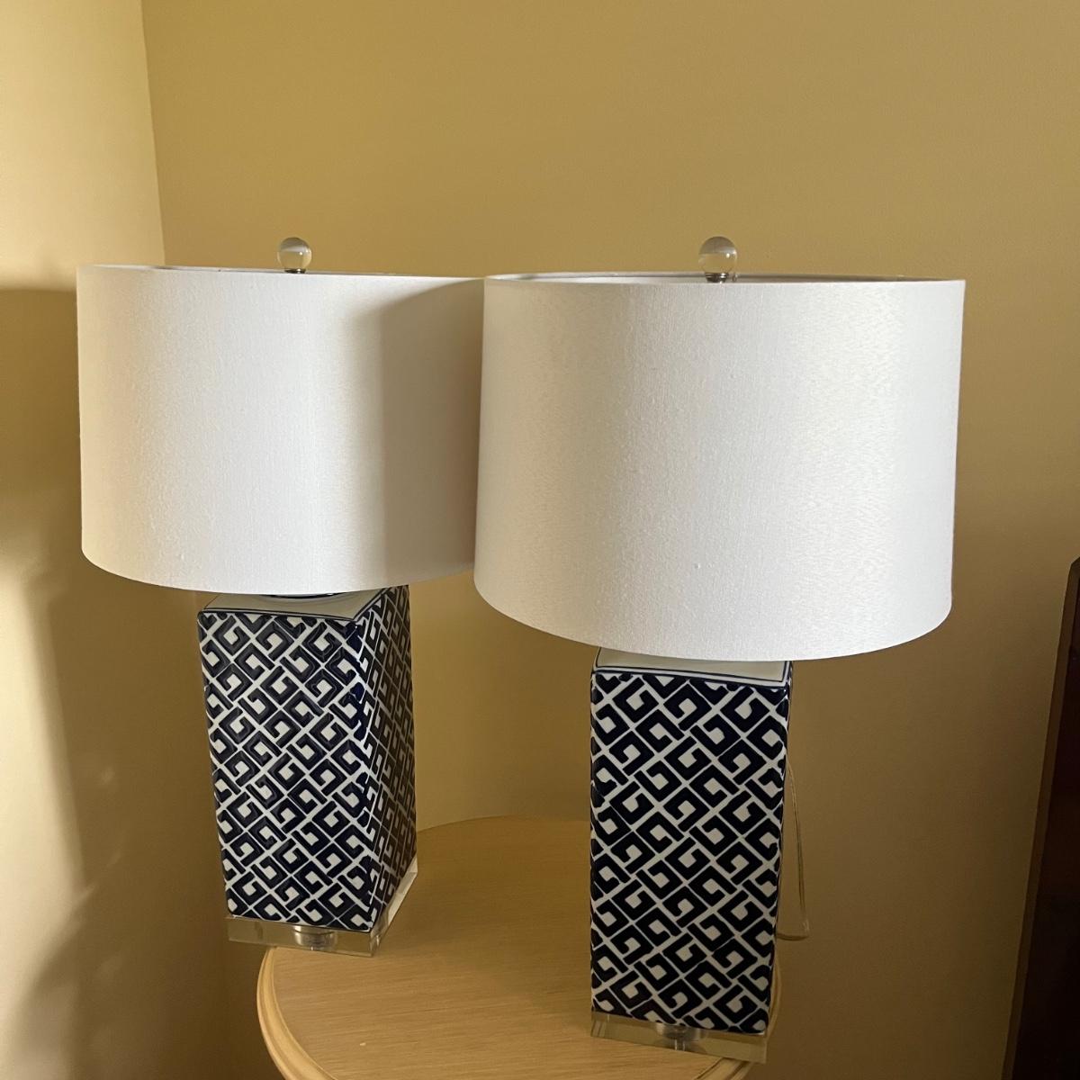 Lot includes two ceramic rectangular shaped table lamps with three way switches that are a dark blue with white. Both lamps powered on when plugged in. Lamps measure 14”D x 27”H including shade.