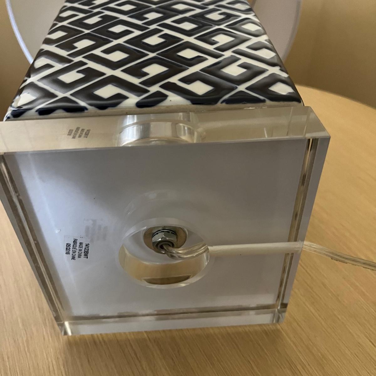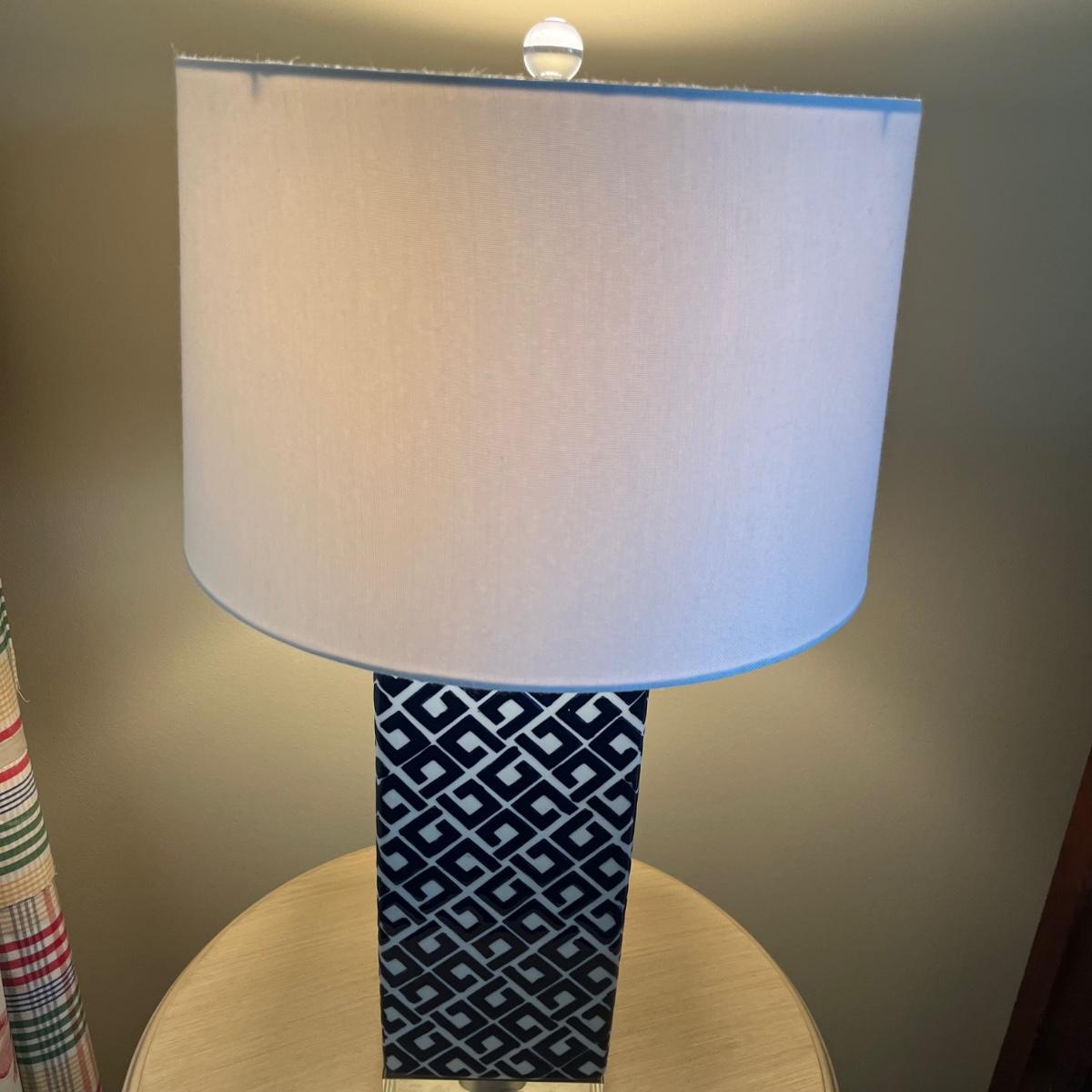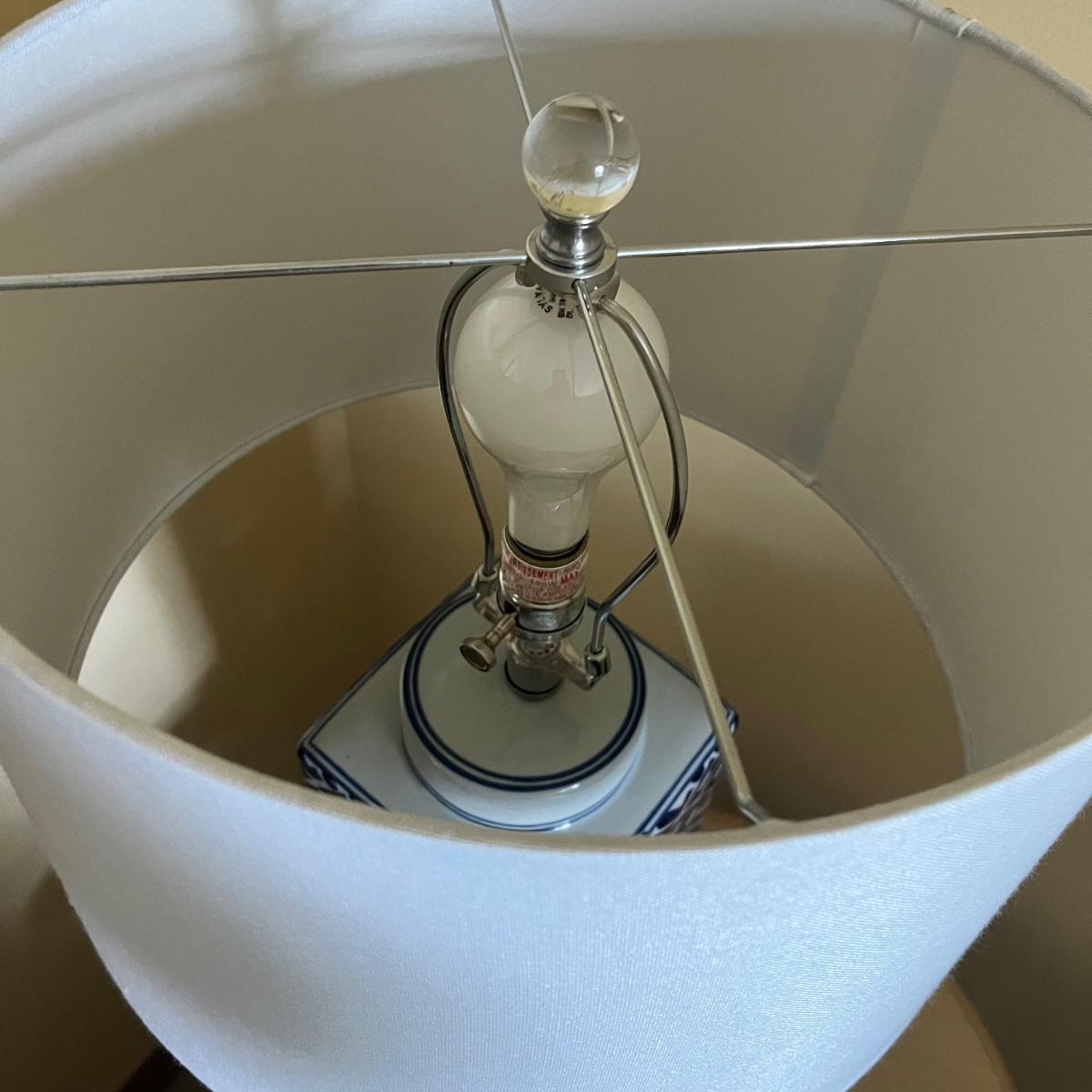 Lot includes two ceramic rectangular shaped table lamps with three way switches that are a dark blue with white. Both lamps powered on when plugged in. Lamps measure 14”D x 27”H including shade.