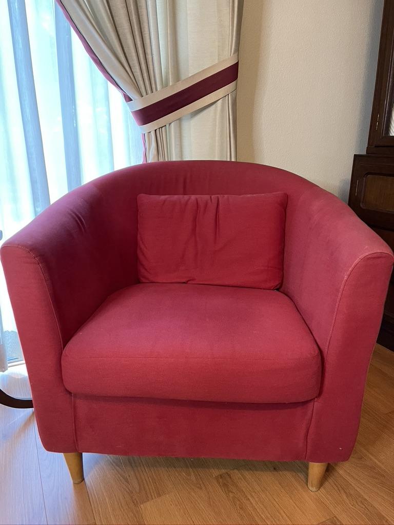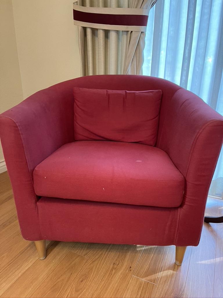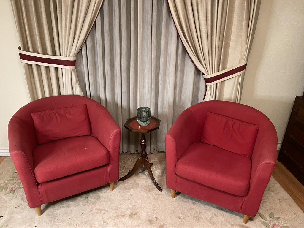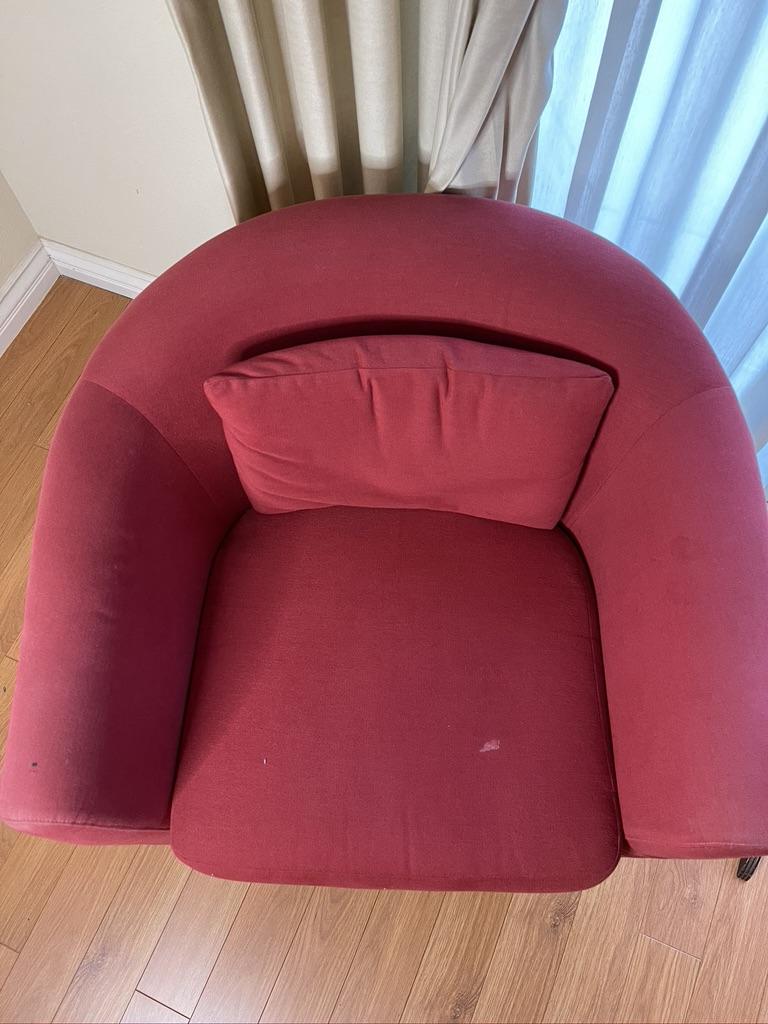 Pair of Red Arm Chairs with Wood Legs with some stains