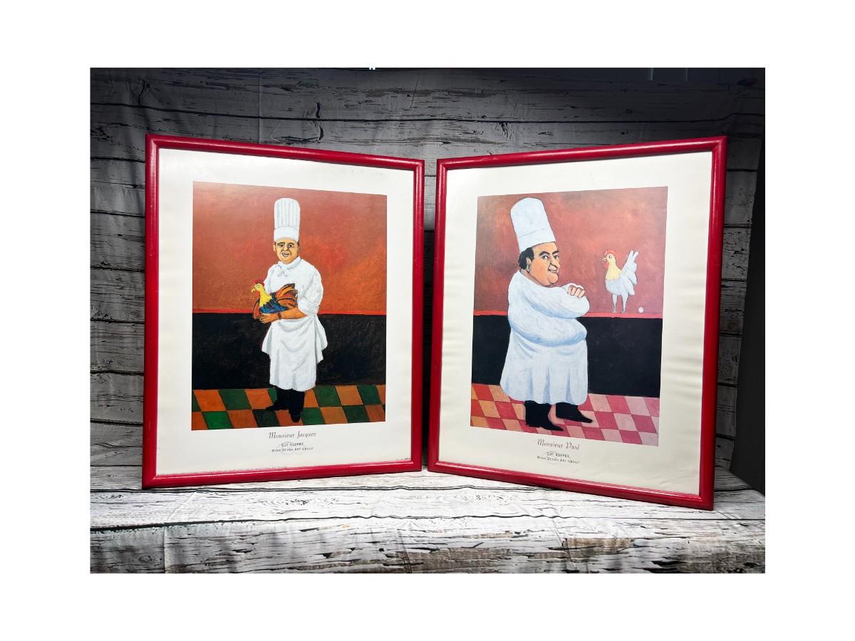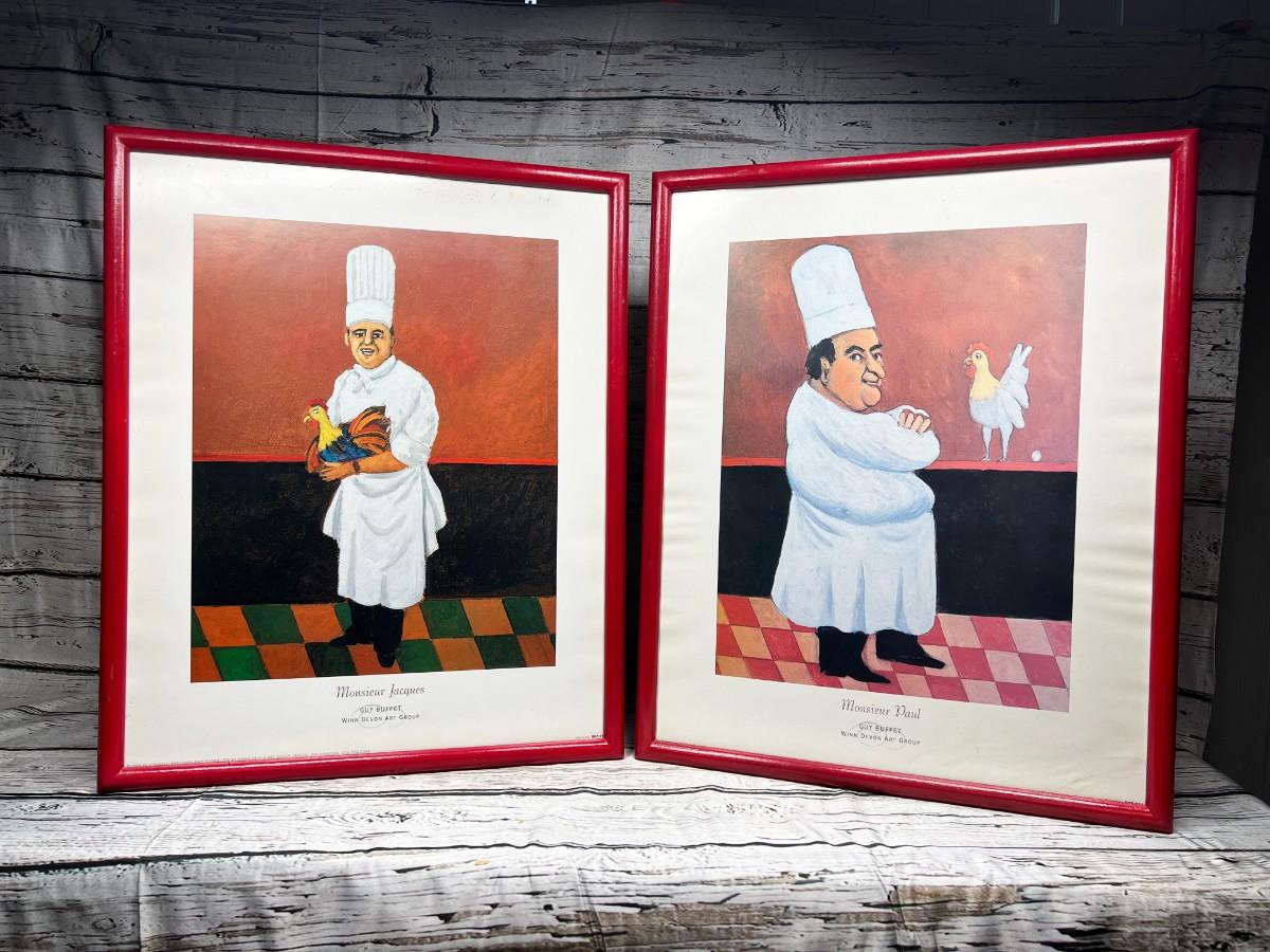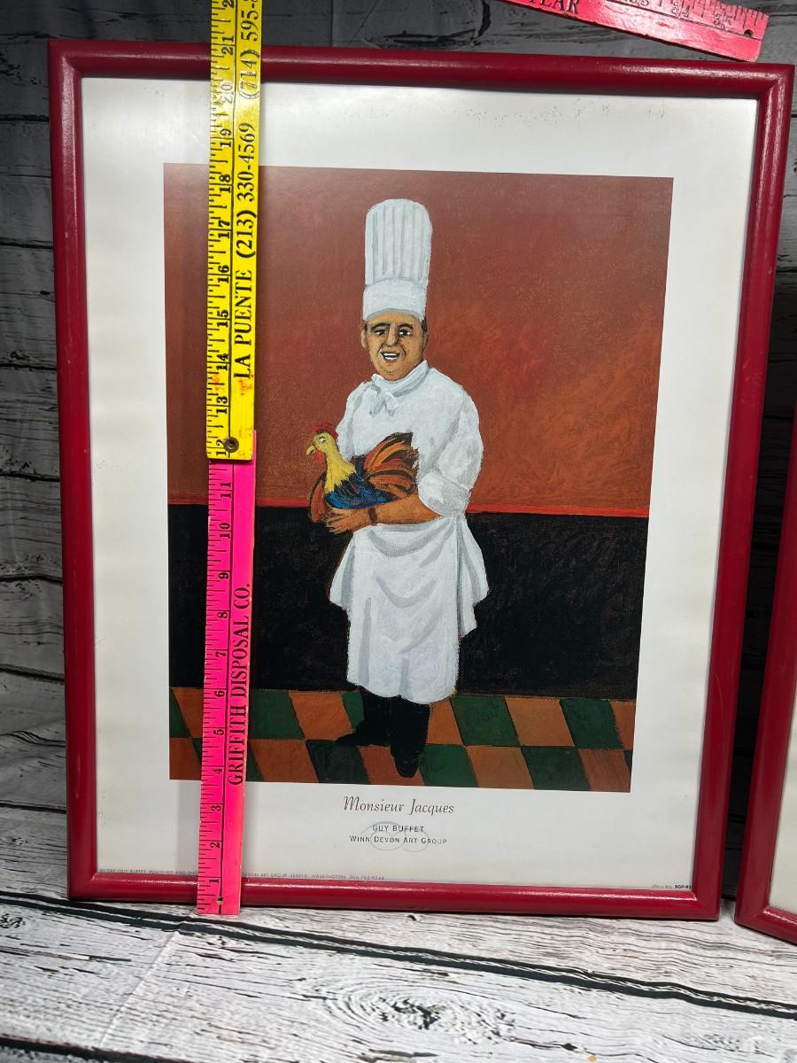 Pair of Framed Guy Buffet Winn Devin Art Group Chef with Chickens Poster Prints, there is no significant damage to the glass or the frame and is in good displayable condition. The frames are a little dirty and need to be cleaned, check pictures for more details and for sizing.