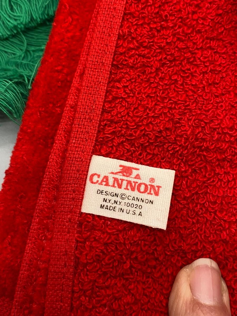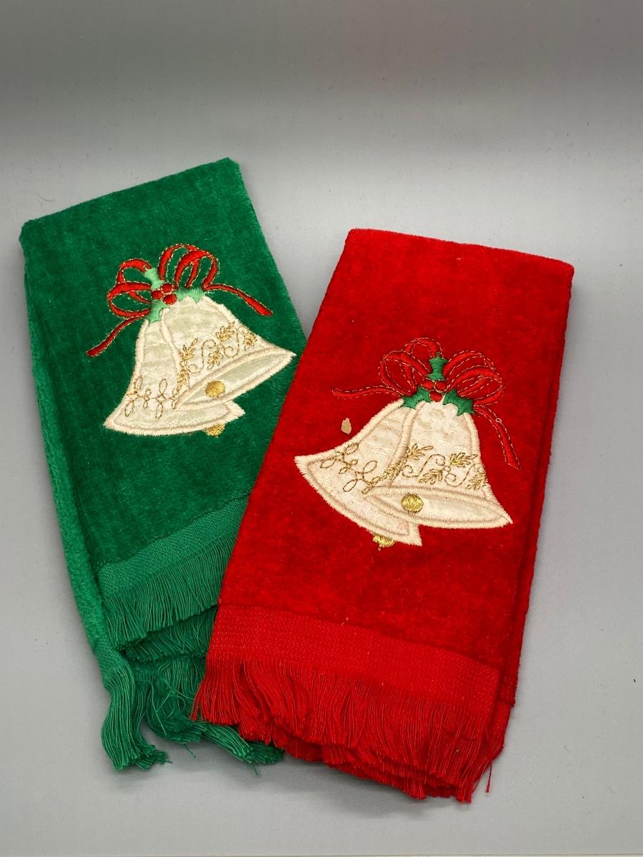 Pair of Christmas holiday hand towels. One red, one green, both have festive bells on them. Good condition.