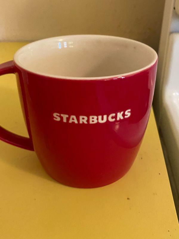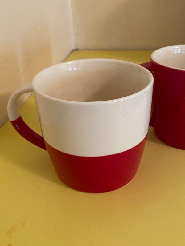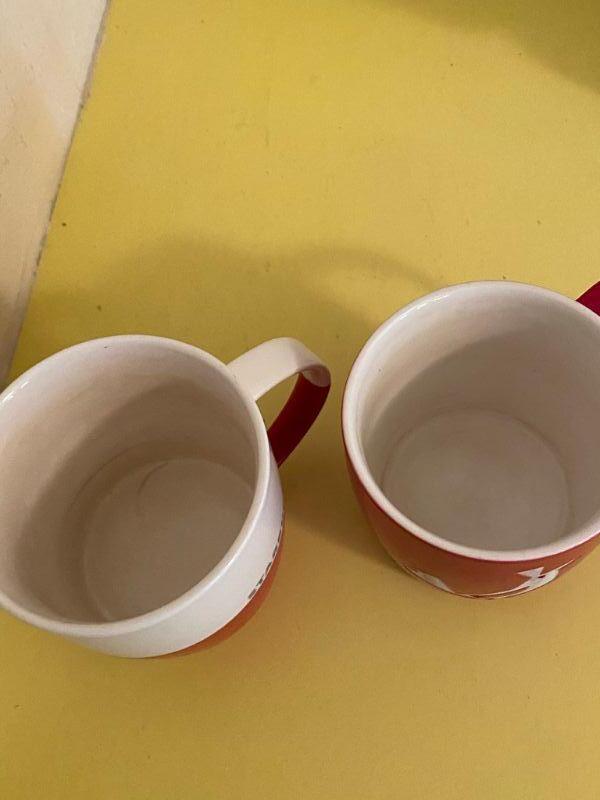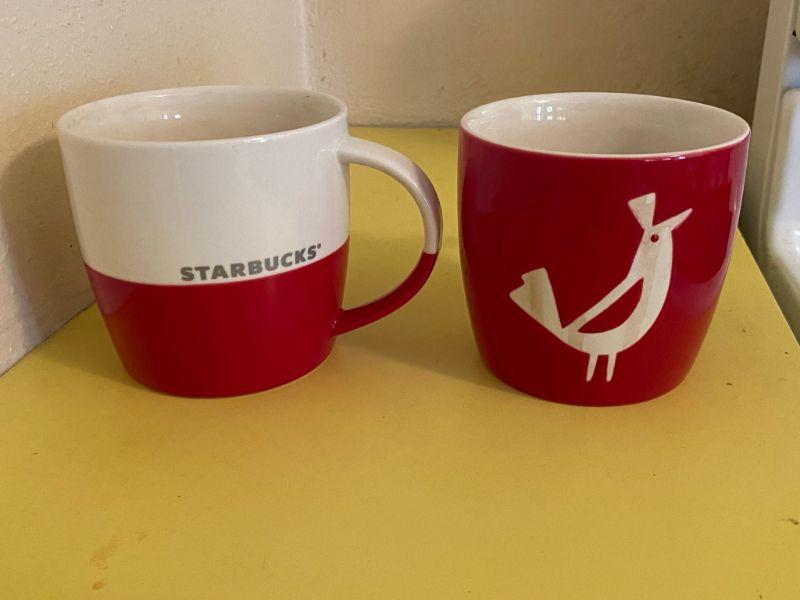 Pair of red & white Starbucks coffee cups. One is red & white with Starbucks name, the other is red with white bird. Good condition,