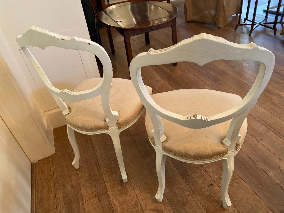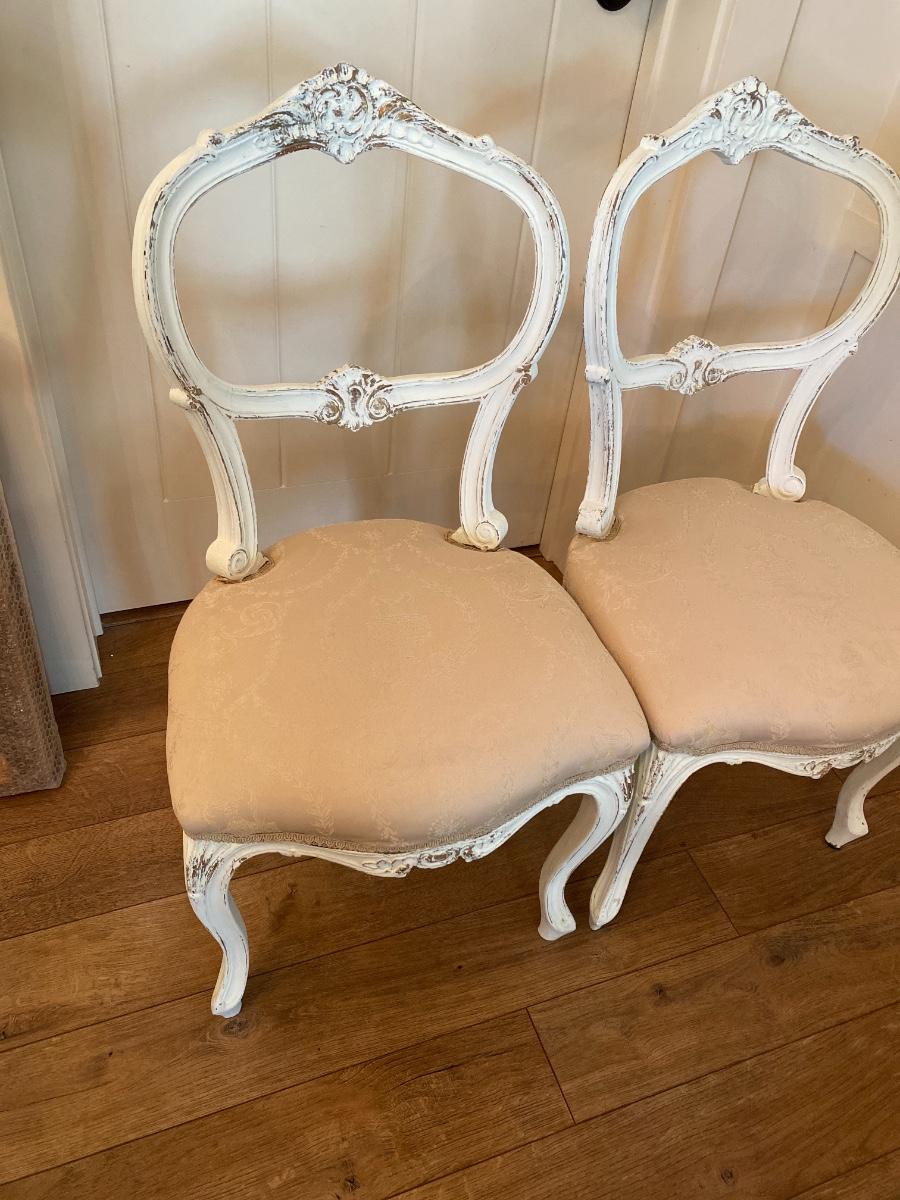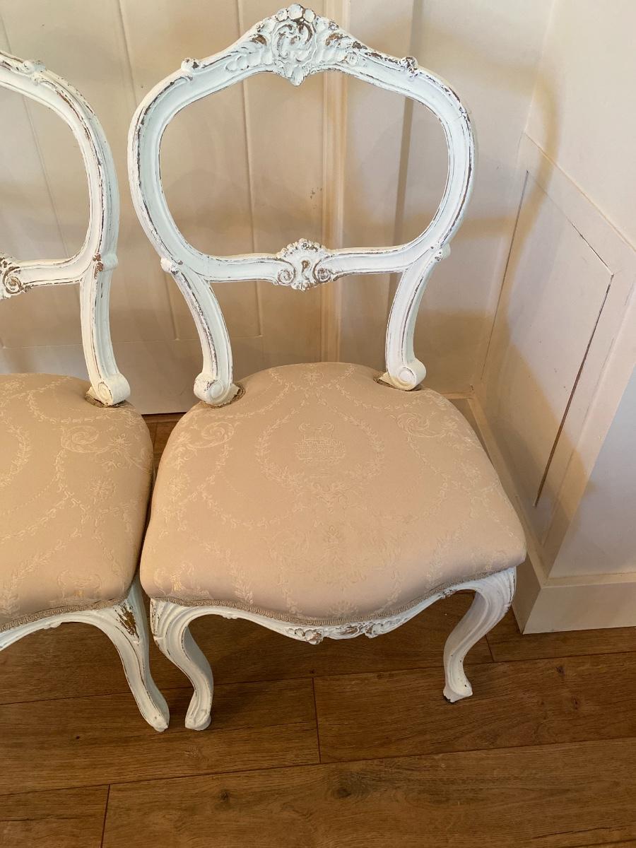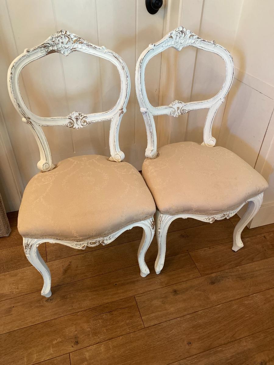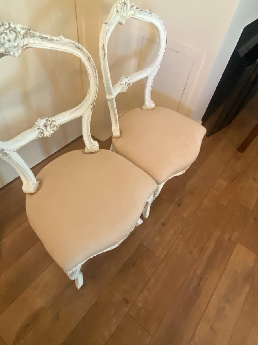 18”w x 18”d x 34”h for seatback and 16”h for seat. Upholstered seat with off white champagne colored fabric with design. Shabby Chic. Cottage Core.