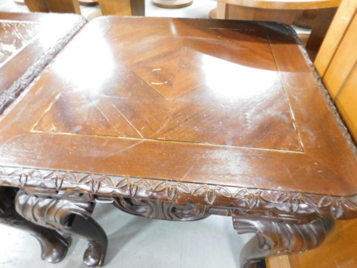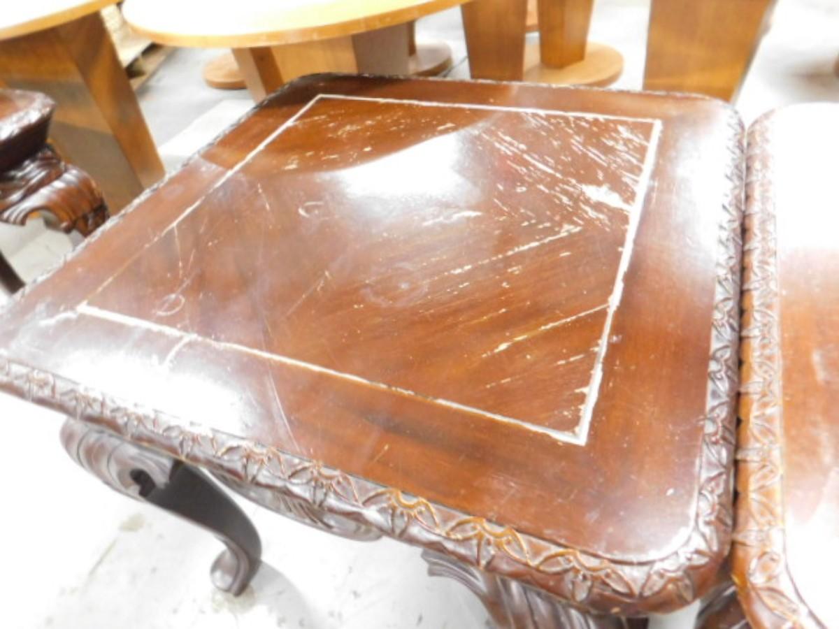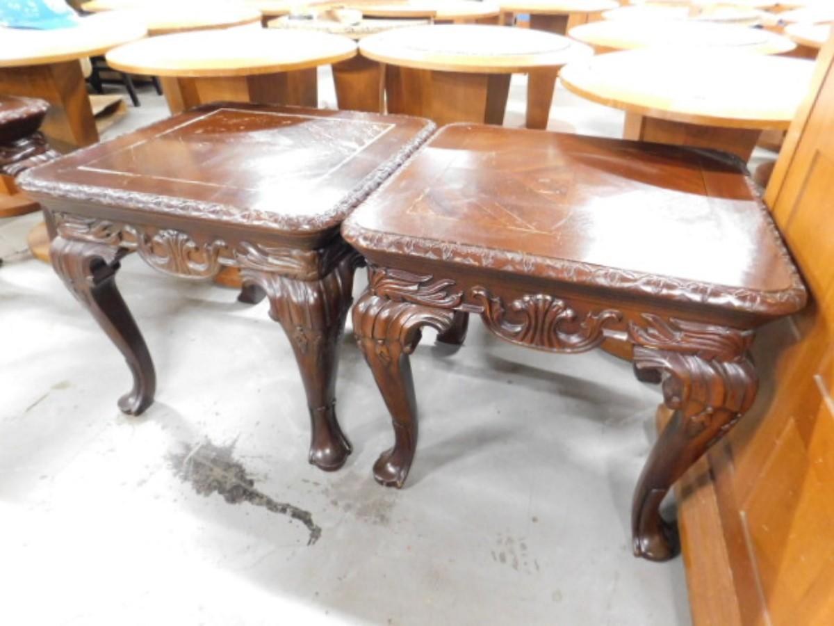 Pair of Regency Mahogany Finish Side Tables Choice B. Legs will need to be tightened. Wear to the surface. Expect some wear or scratches to the finish. Shipping option available via freight or local mover at Buyer's expense. Buyer must have all shipping scheduled within the stated dates and times of pickup. Recommended local mover is Beaty Bros. Moving 828-201-2982