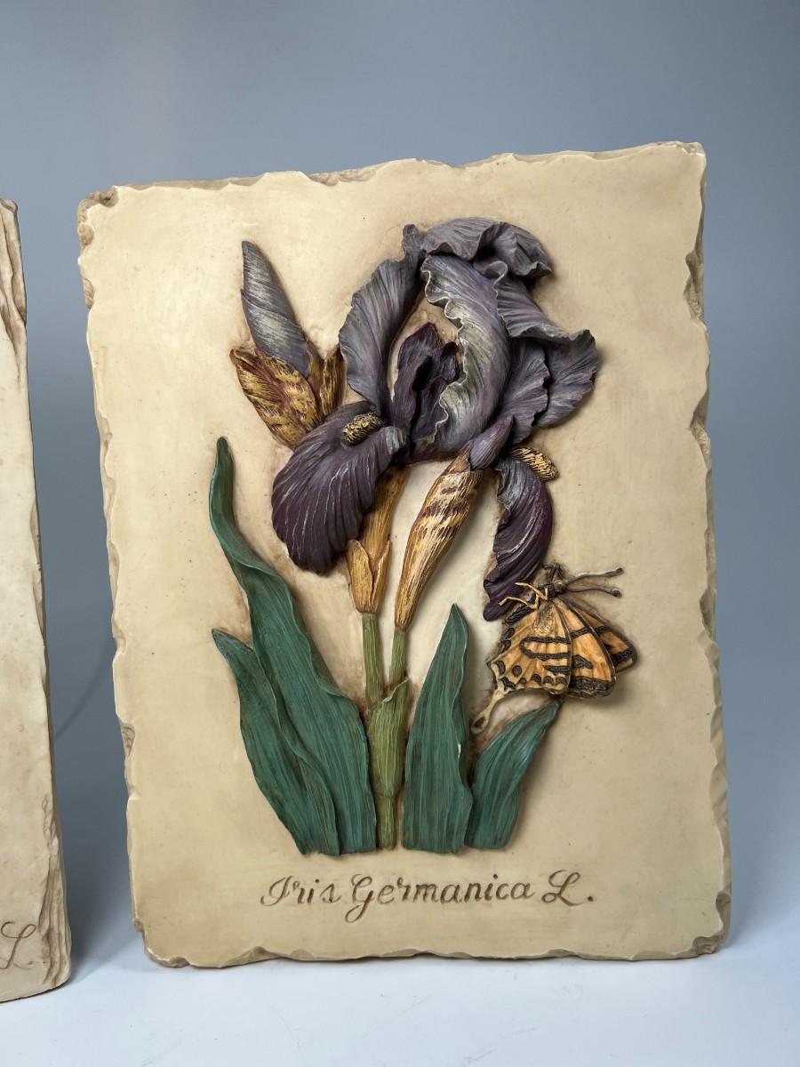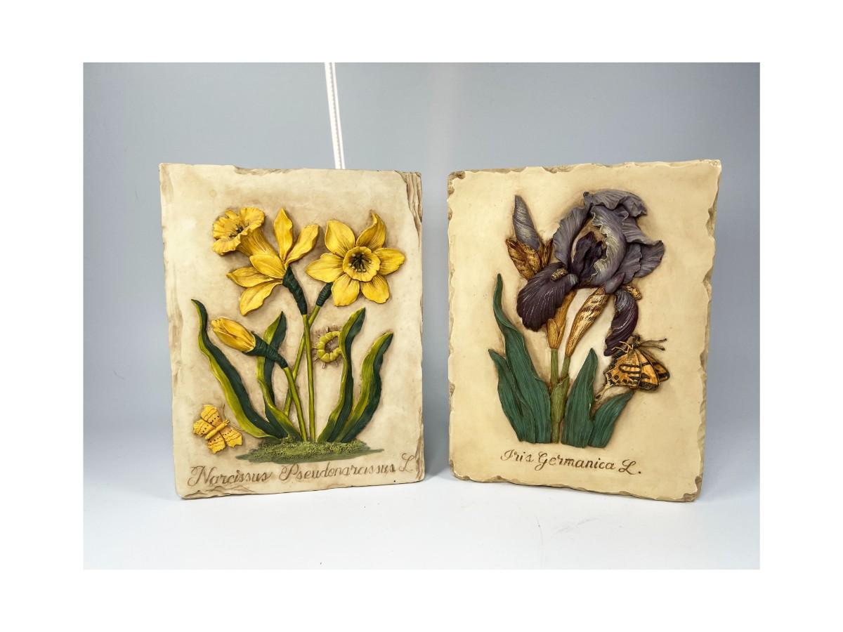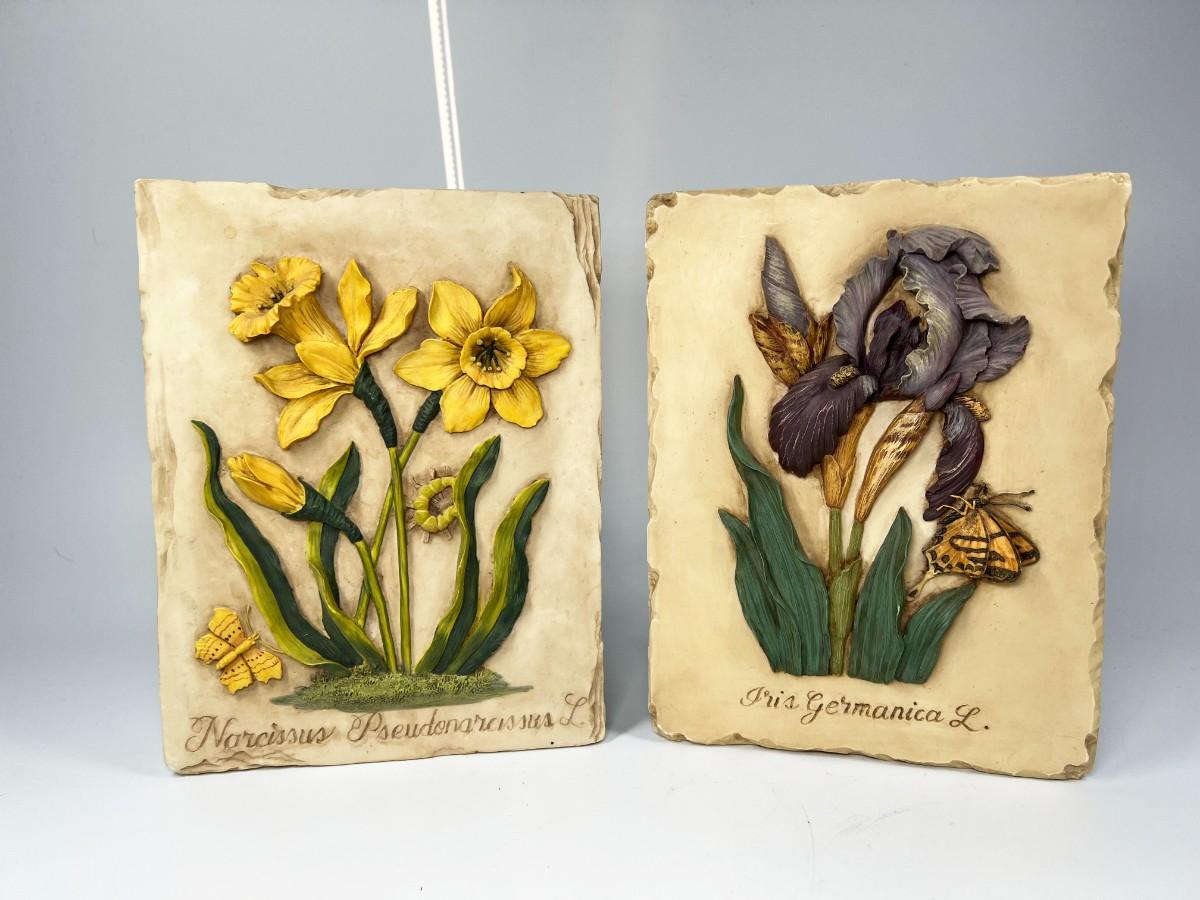 Pair of Resin Cast Three Dimensional Flower Wall Plaque Daffodil & Iris with Butterflies