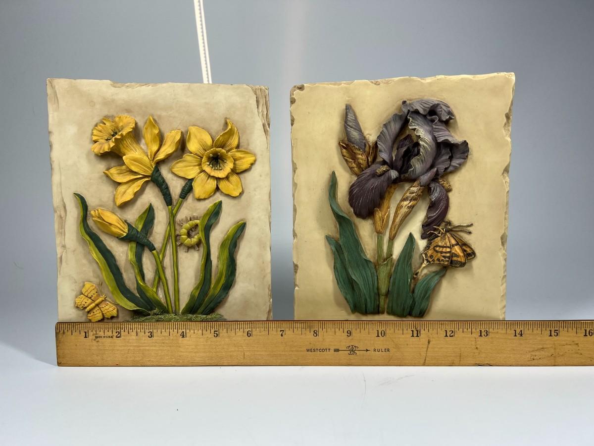 Pair of Resin Cast Three Dimensional Flower Wall Plaque Daffodil & Iris with Butterflies, there is no significant damage to the plaques and is in good displayable condition. Check pictures for more details and for sizing.