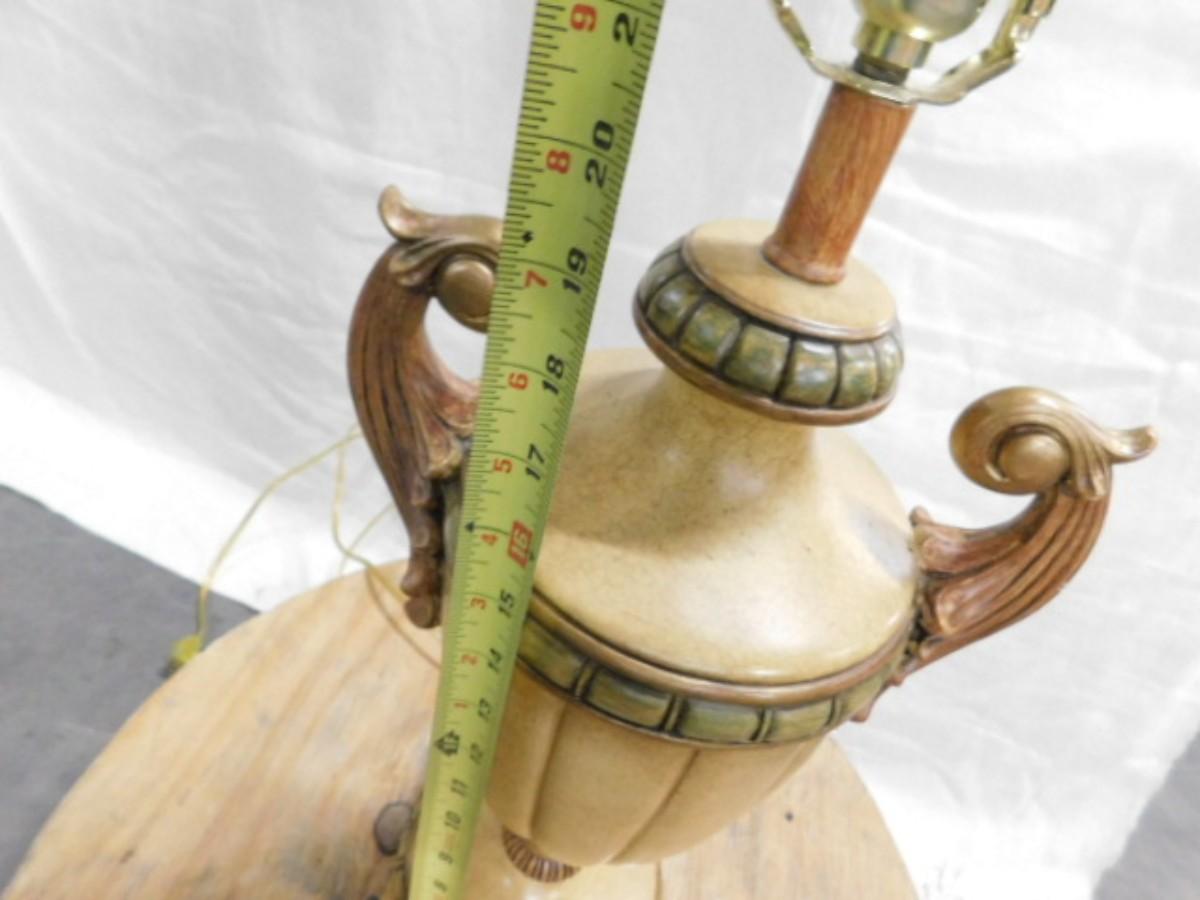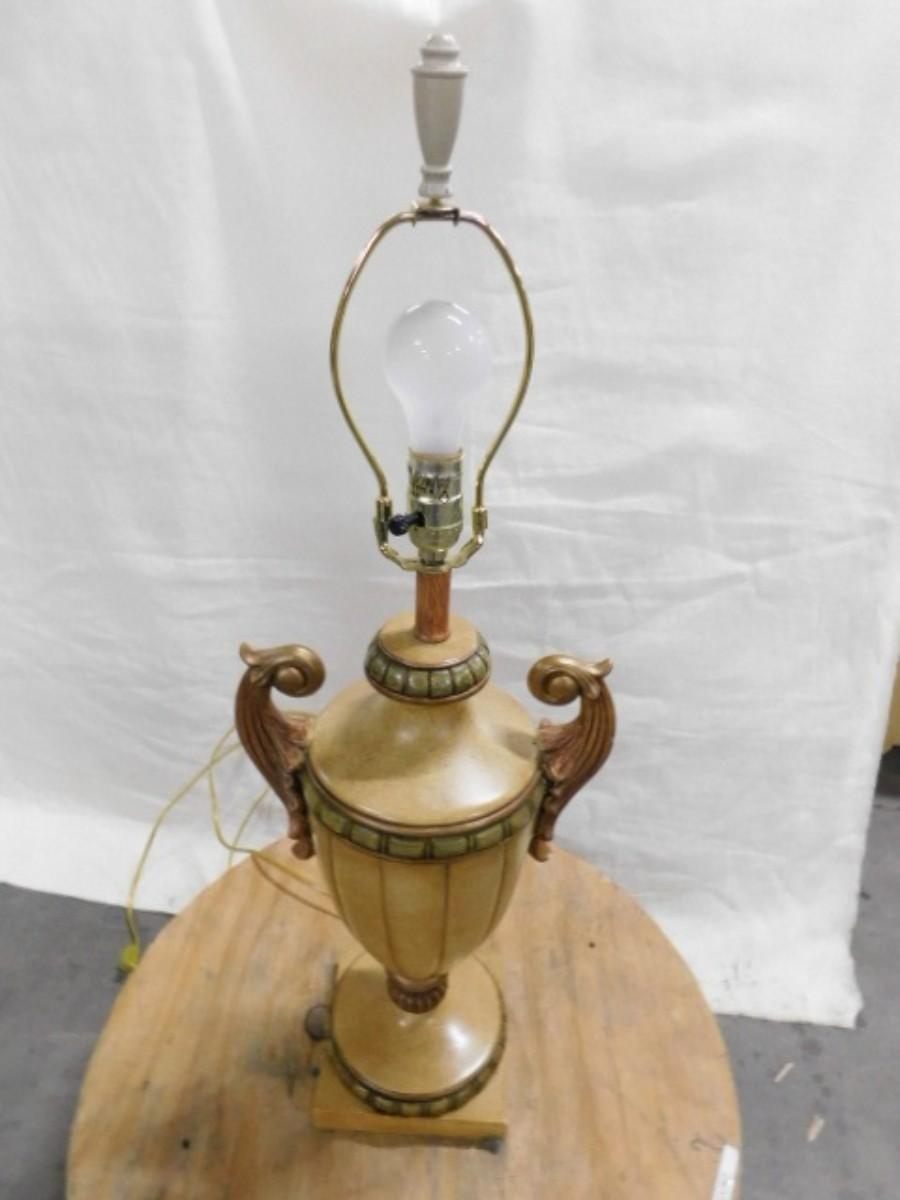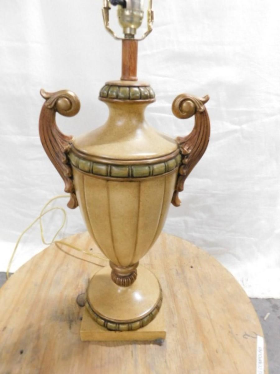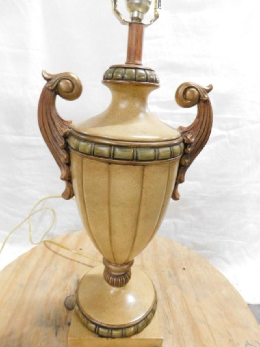 Pair of Resin Grecian Urn Table Lamps Expect some wear or scratches to the finish. Shipping option available via freight or local mover at Buyer's expense. Buyer must have all shipping scheduled within the stated dates and times of pickup. Recommended local mover is Beaty Bros. Moving 828-201-2982