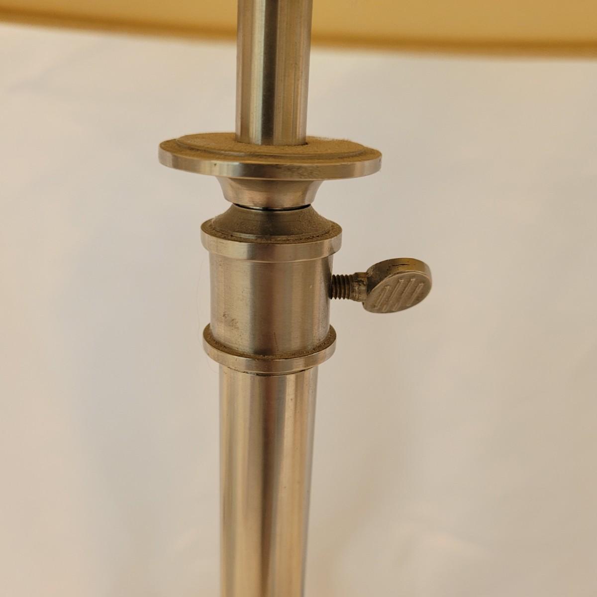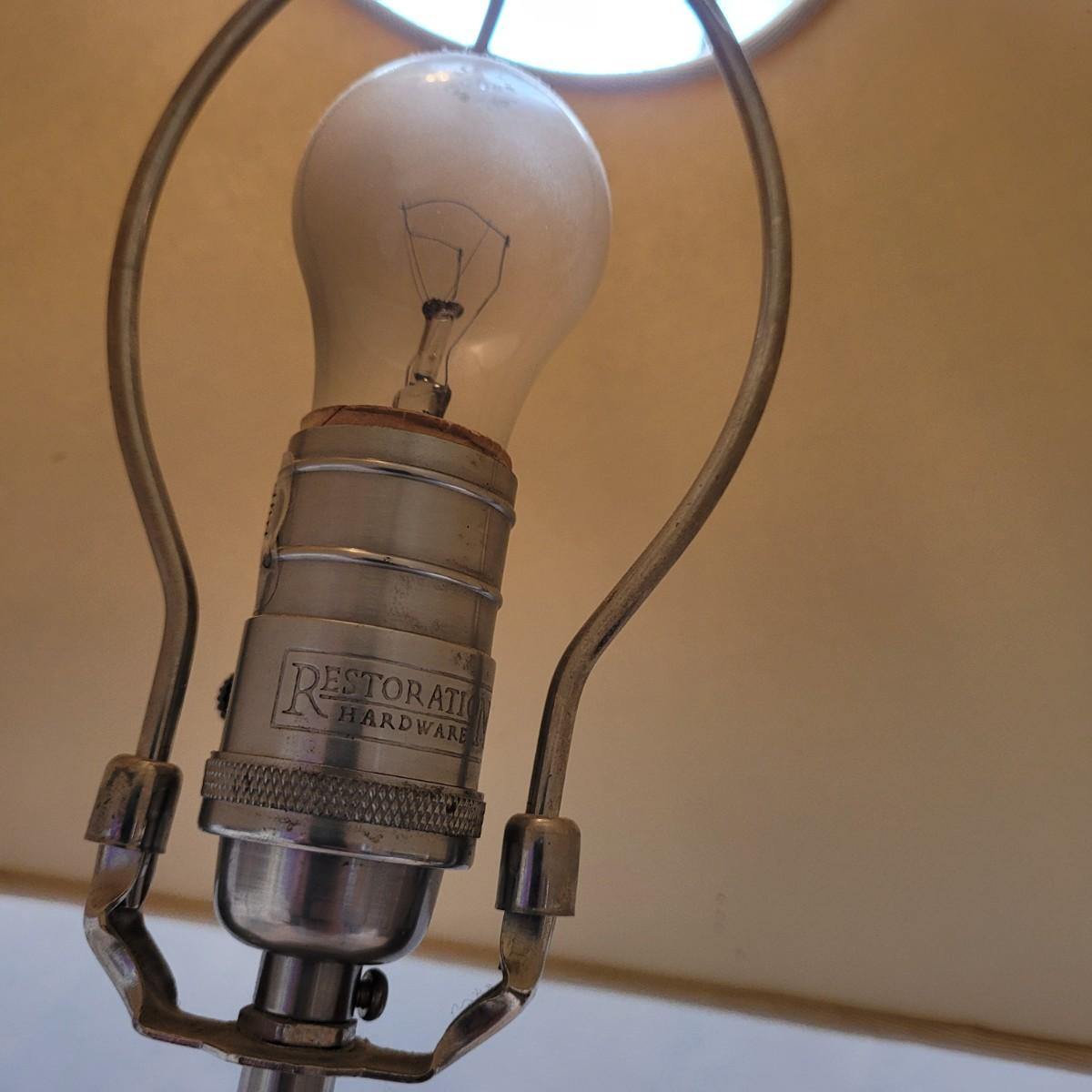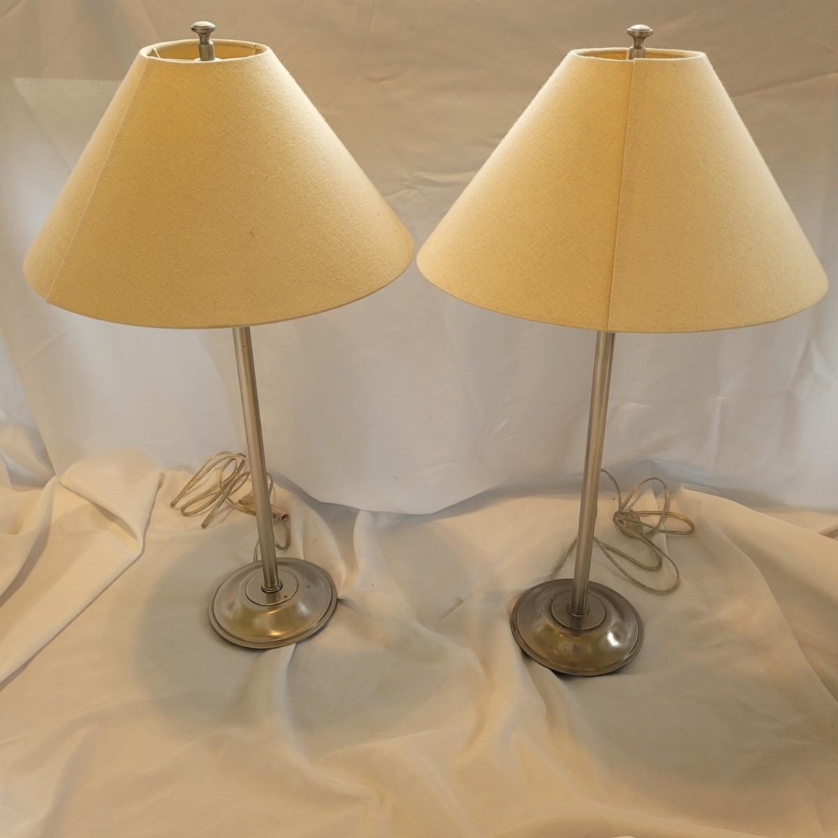This lot includes two metal table lamps with adjustable height. The two lamps are identical and made by Restoration Hardware. Both bases are made from what appears to be stainless steel. The lamp shades are made from cardboard and fabric and are tan or off white in color. Both lamps have an adjustable portion on the stem which allows the lamps to extend. Both lamps power on when plugged in and include a bulb.