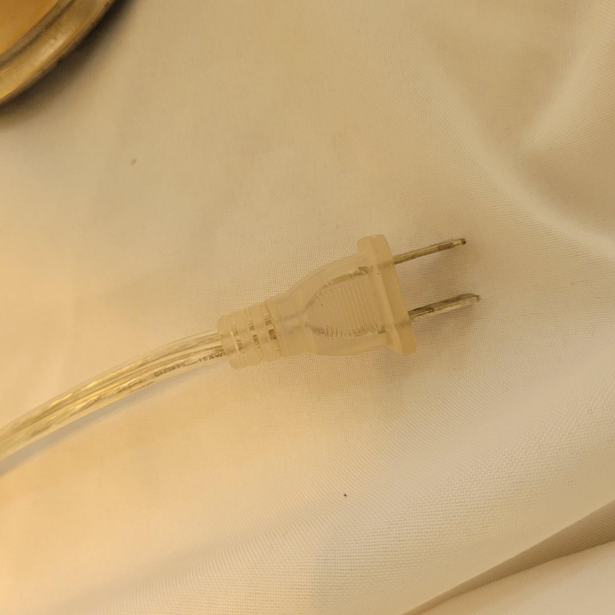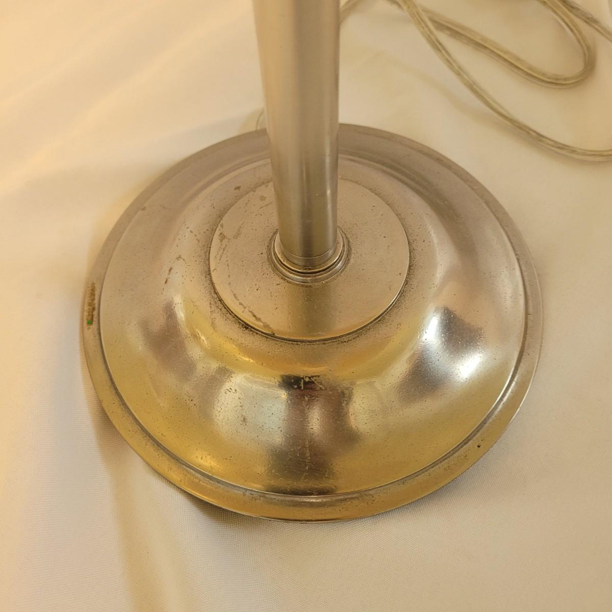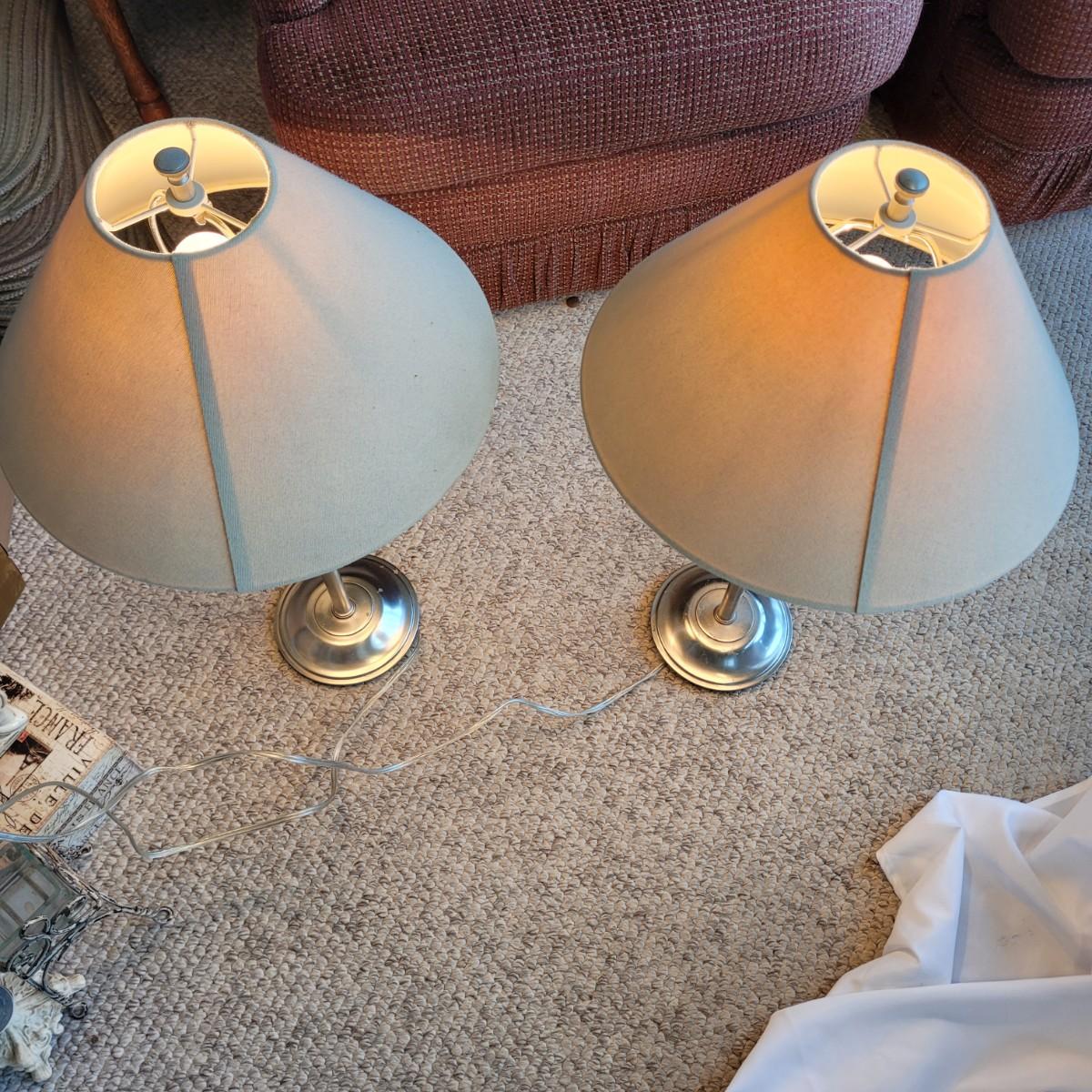 This lot includes two metal table lamps with adjustable height. The two lamps are identical and made by Restoration Hardware. Both bases are made from what appears to be stainless steel. The lamp shades are made from cardboard and fabric and are tan or off white in color. Both lamps have an adjustable portion on the stem which allows the lamps to extend. Both lamps power on when plugged in and include a bulb.