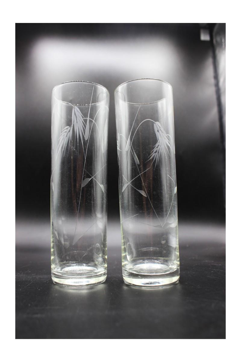 Pair of Retro Etched Design Thin Clear Glass Drinking Glass, there are no cracks or chips to either of the pieces and is in good usable condition. Check pictures for more details and for sizing.