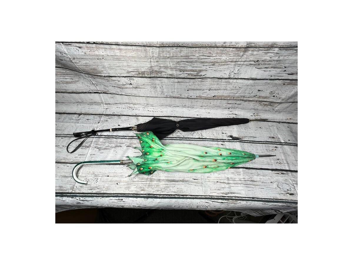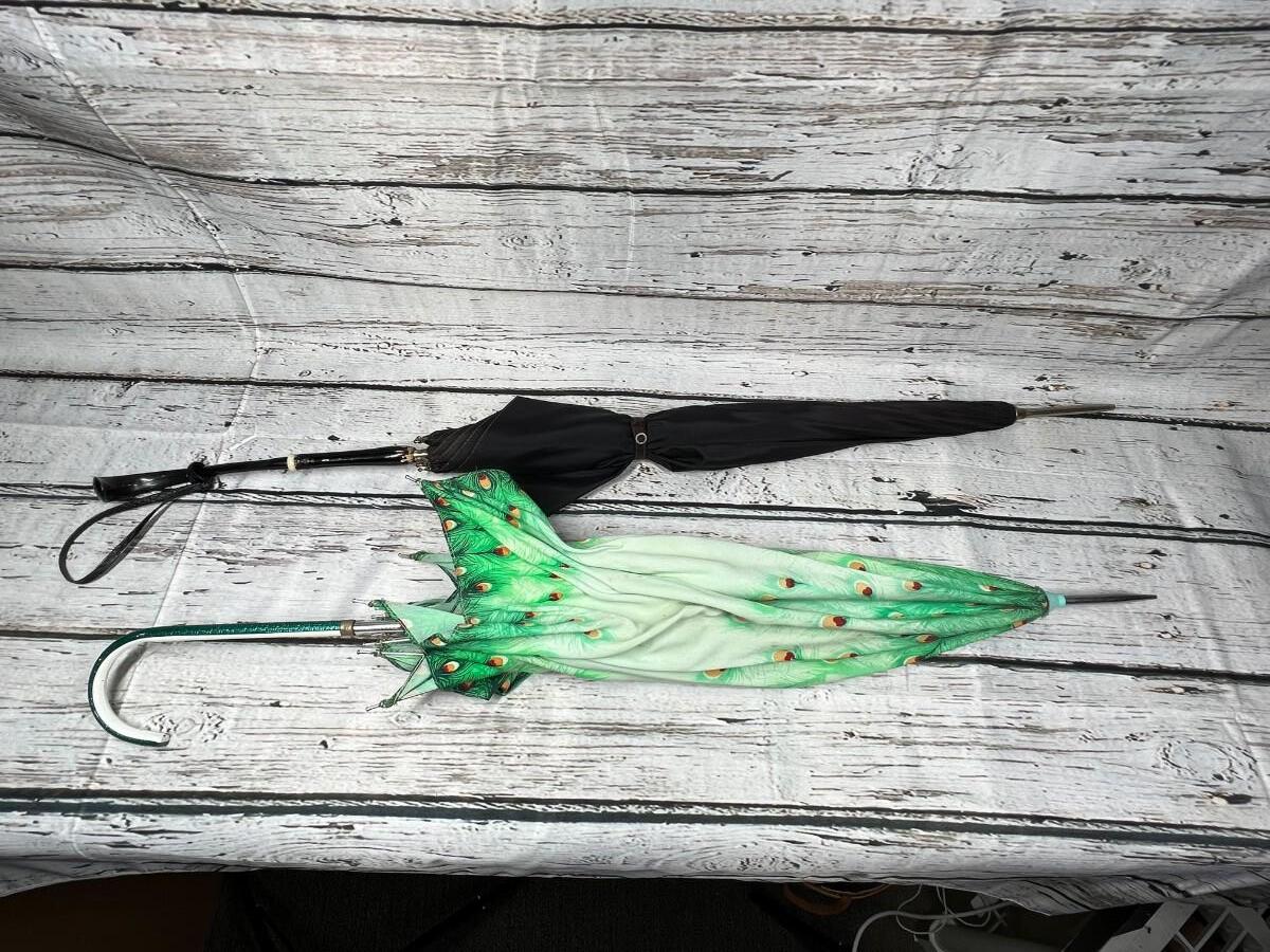 Pair of Retro Fashionable Parasols Umbrellas Peacock Feather Design Green & Gothic Black