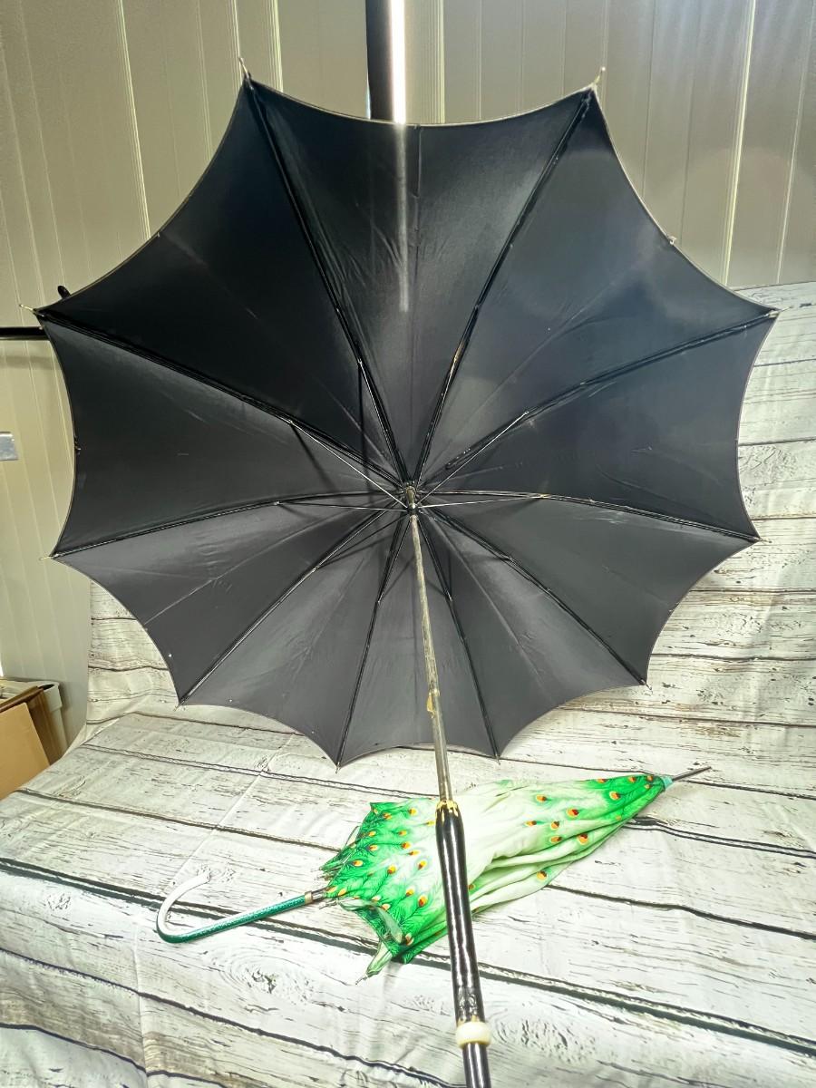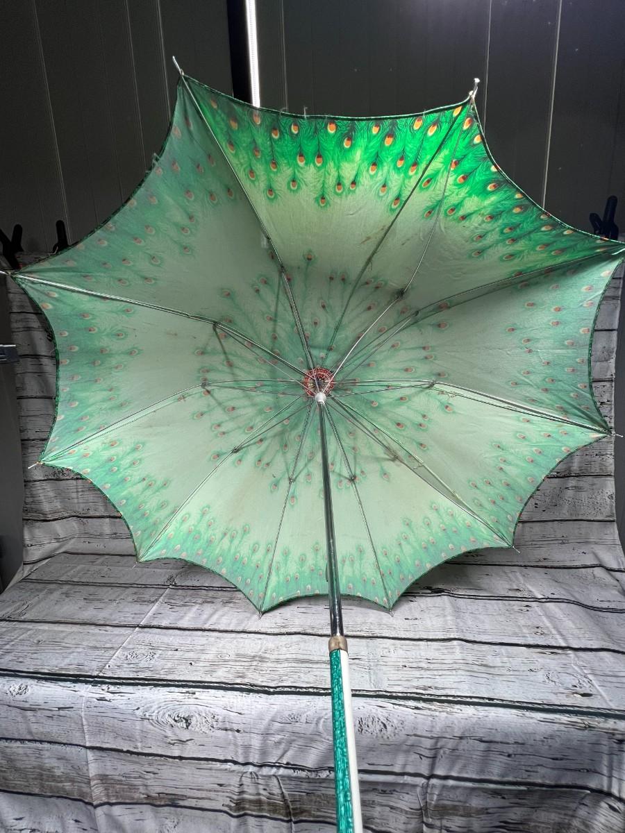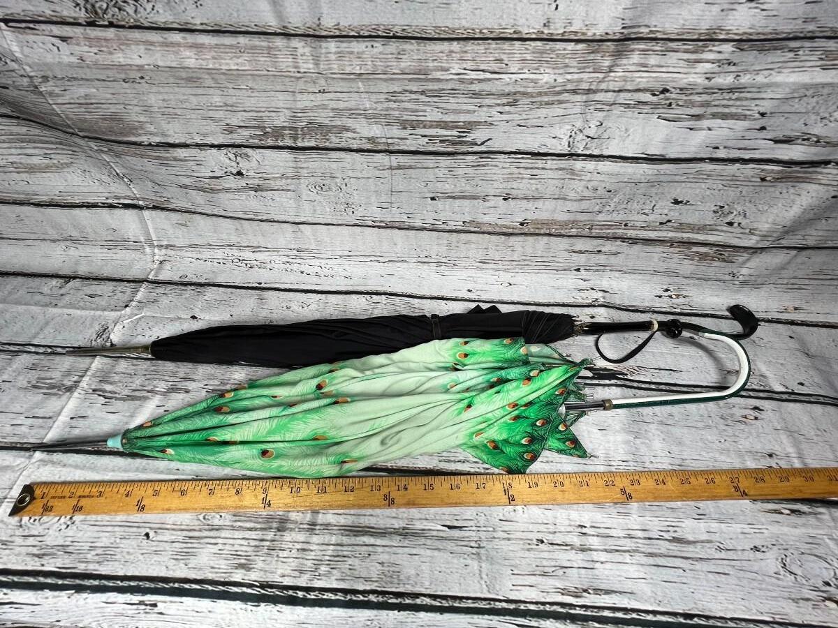 Pair of Retro Fashionable Parasols Umbrellas Peacock Feather Design Green & Gothic Black, there is some wear to the parasols, but there is no significant damage and is in overall good vintage condition. Check pictures for more details and for sizing.