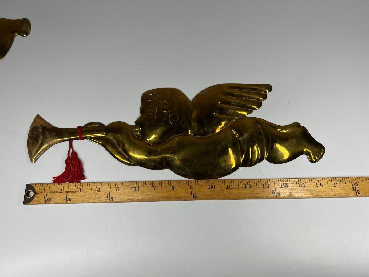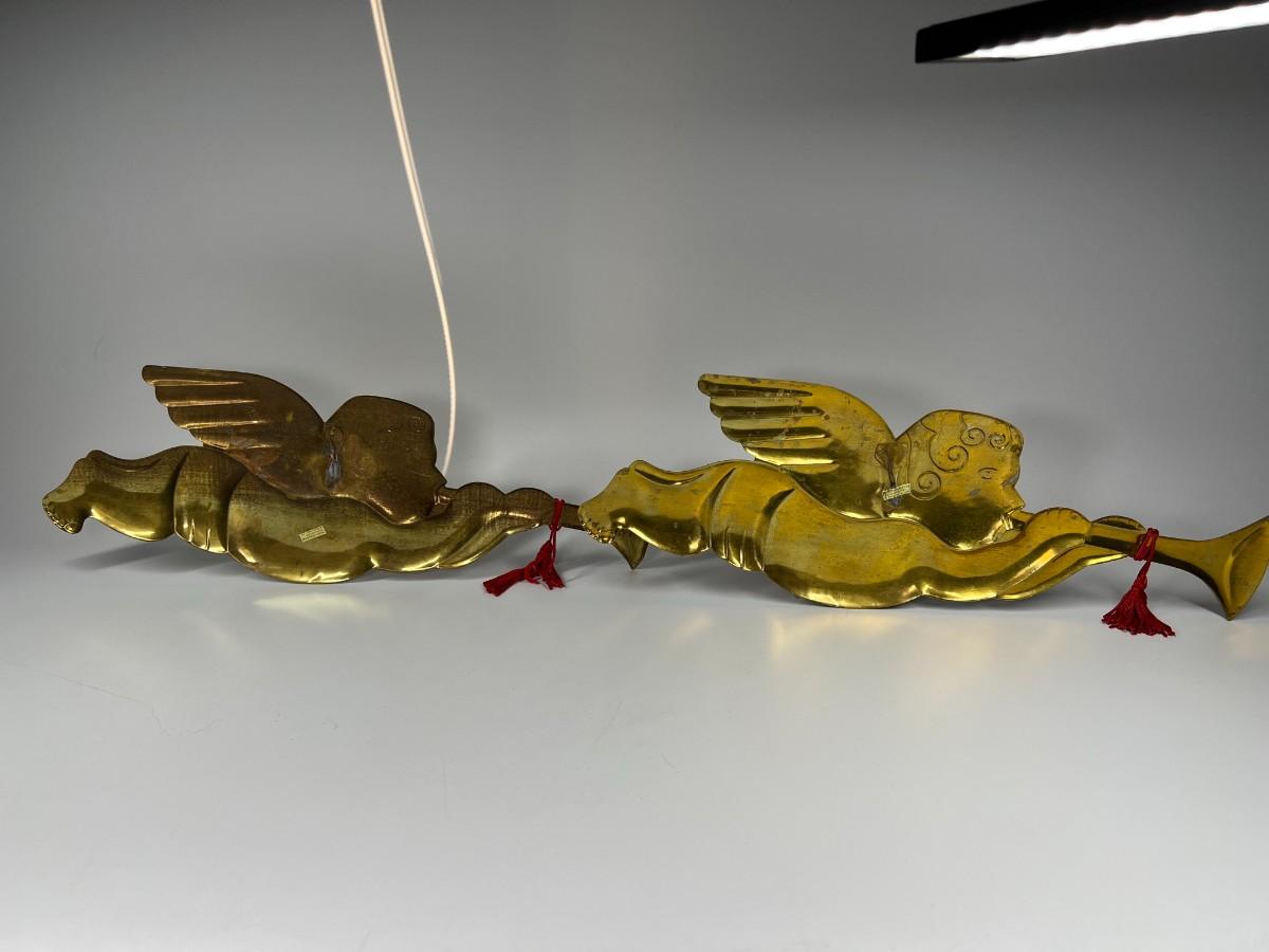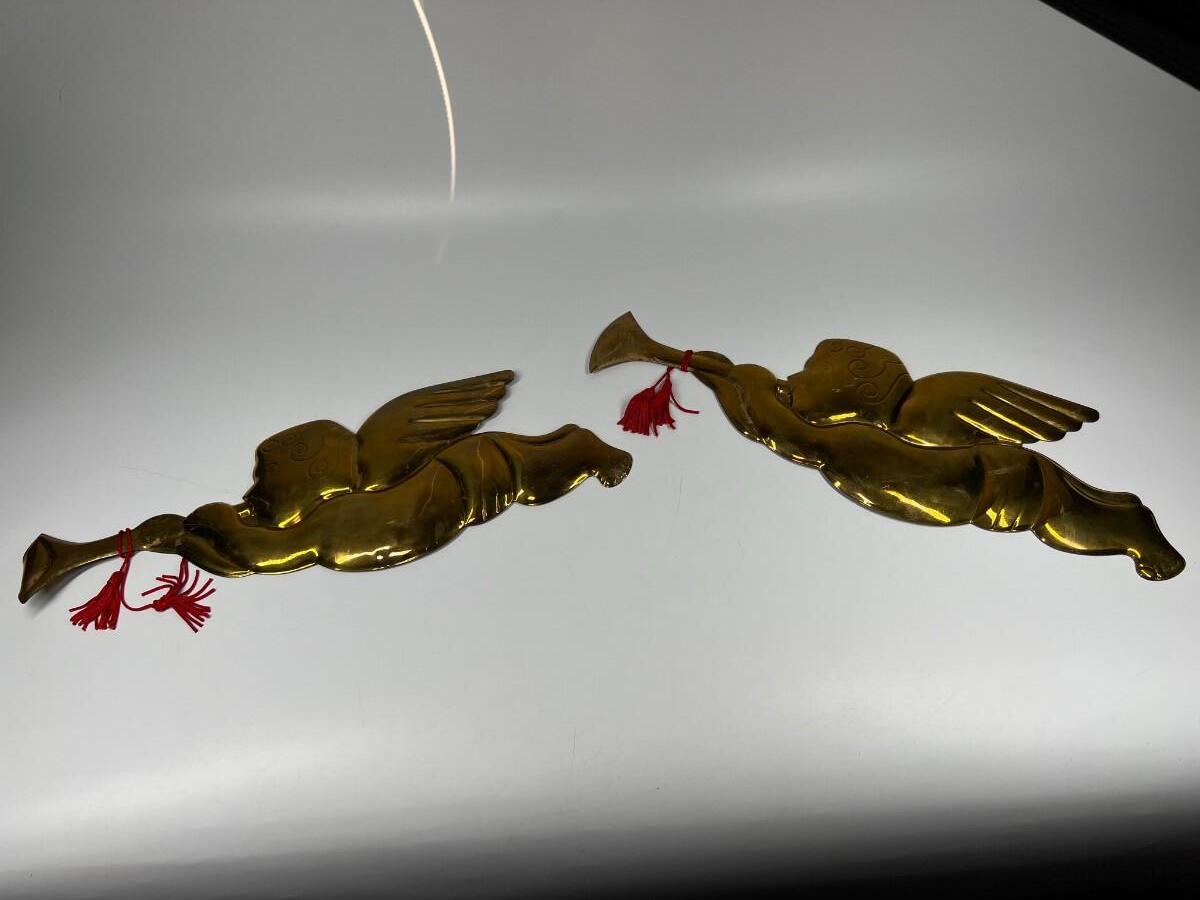 Pair of Retro Gold Tin Angel Cherub Holiday Decor, there is a light dent and bend on one of the trumpets of the angels, but there is no other significant damage and is in good displayable condition. Check pictures for more details and for sizing.