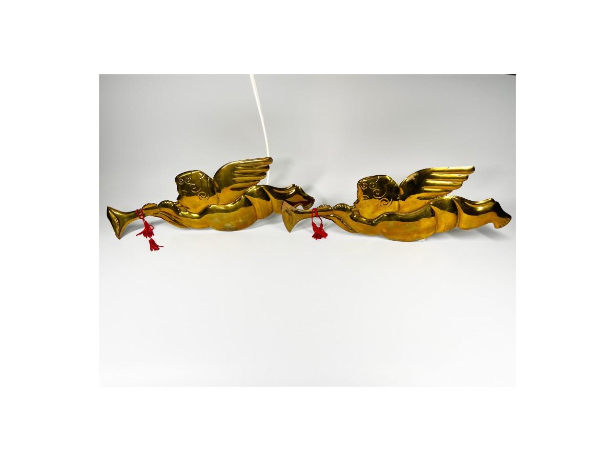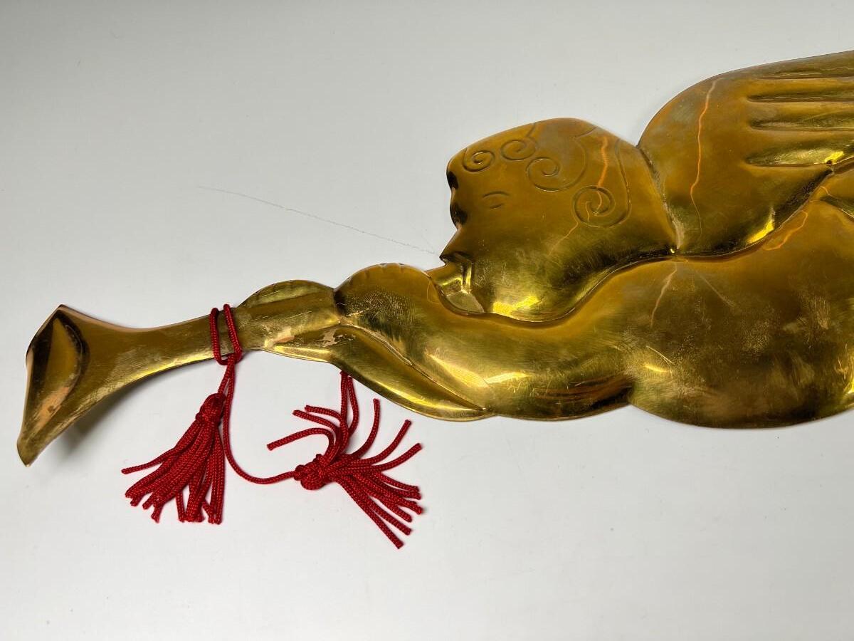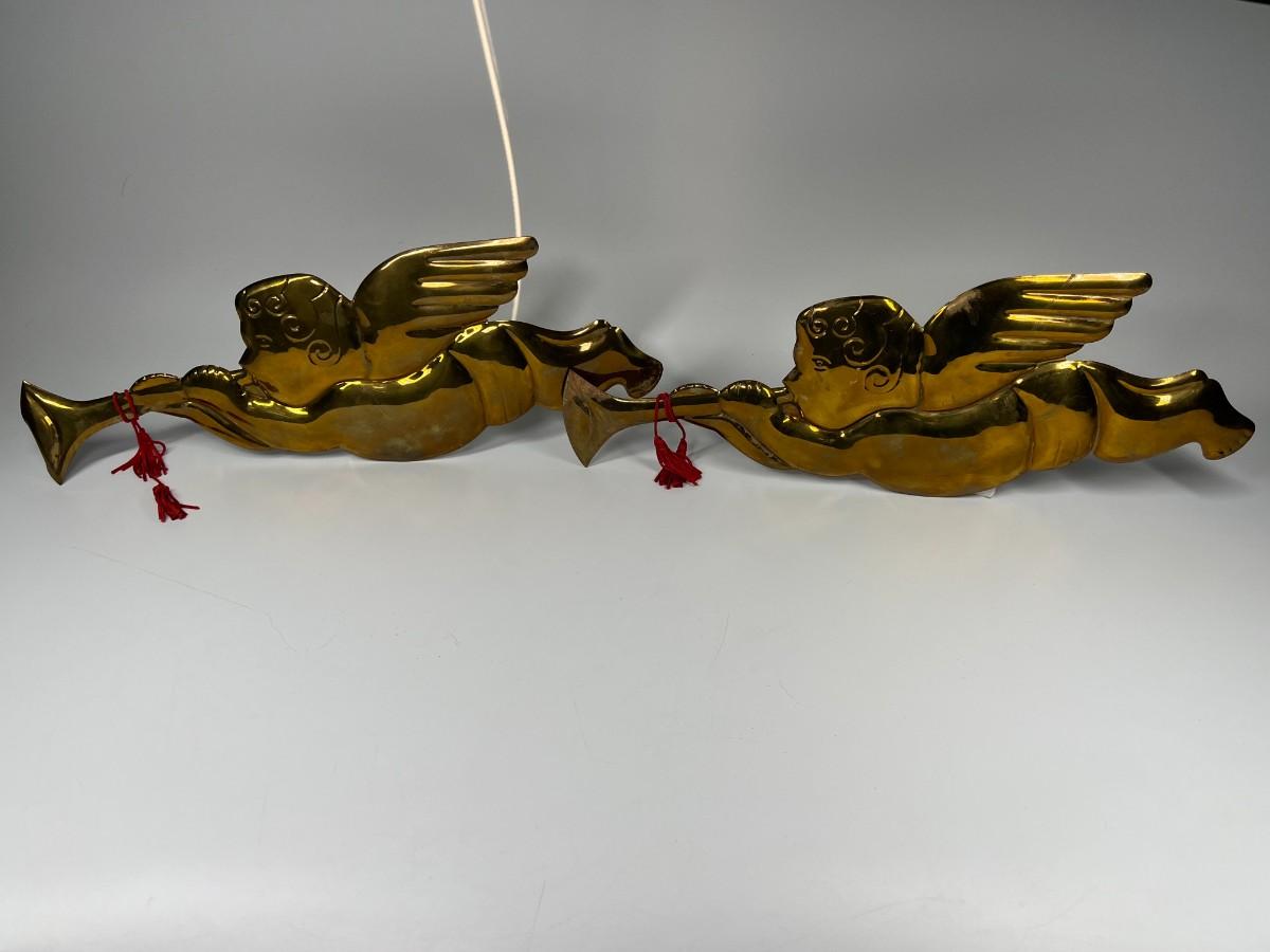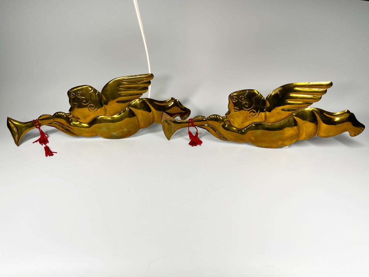 Pair of Retro Gold Tin Angel Cherub Holiday Decor, there is a light dent and bend on one of the trumpets of the angels, but there is no other significant damage and is in good displayable condition. Check pictures for more details and for sizing.