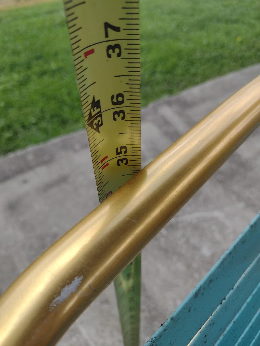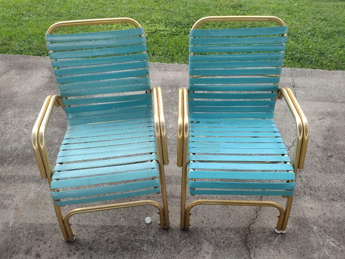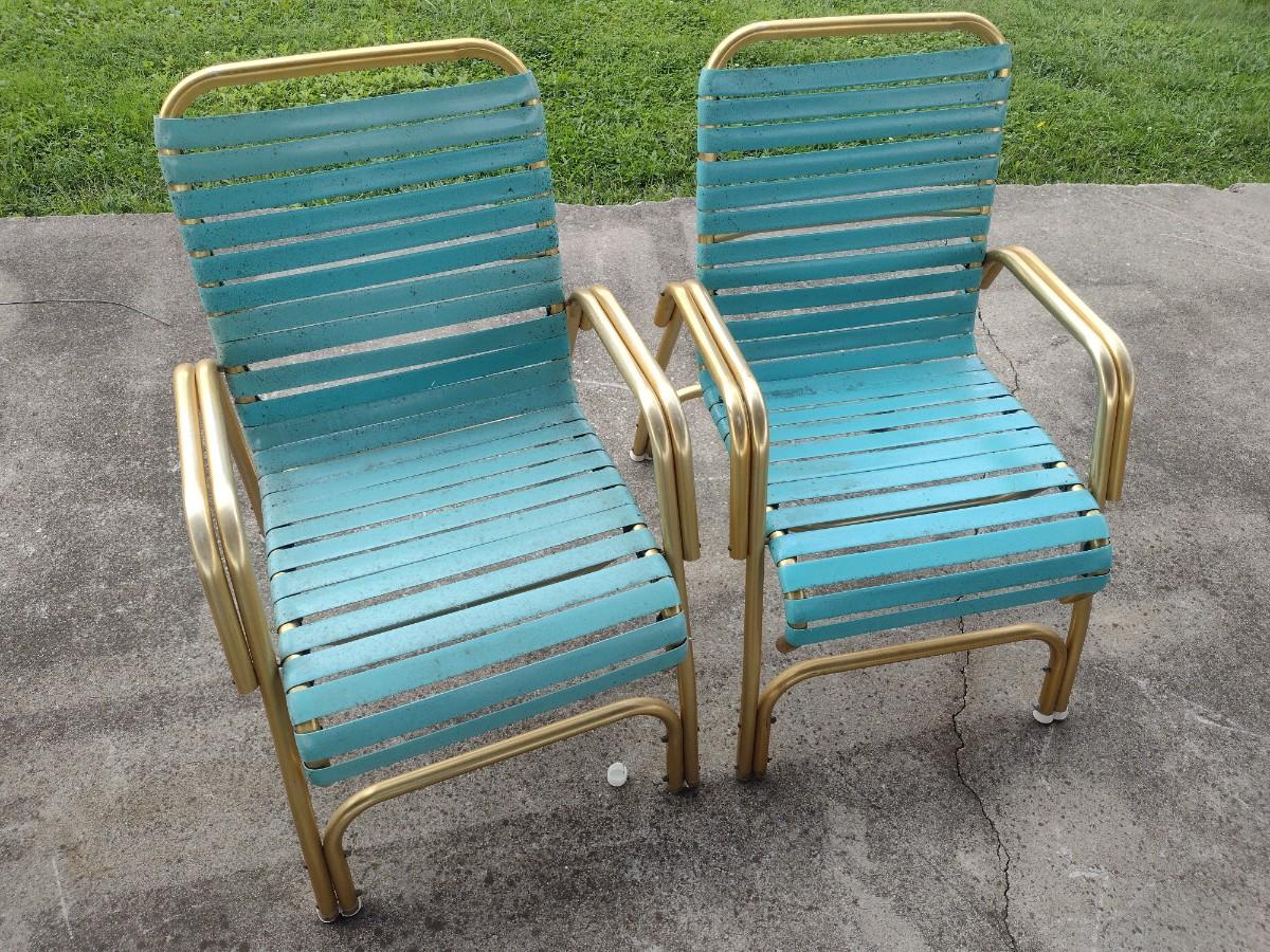 Pair of Retro Gold Tone Aluminum Tube Frame Stacking Lawn Chairs with Plastic Strap Seat and Back. Chairs will need to be cleaned due to tree sap.