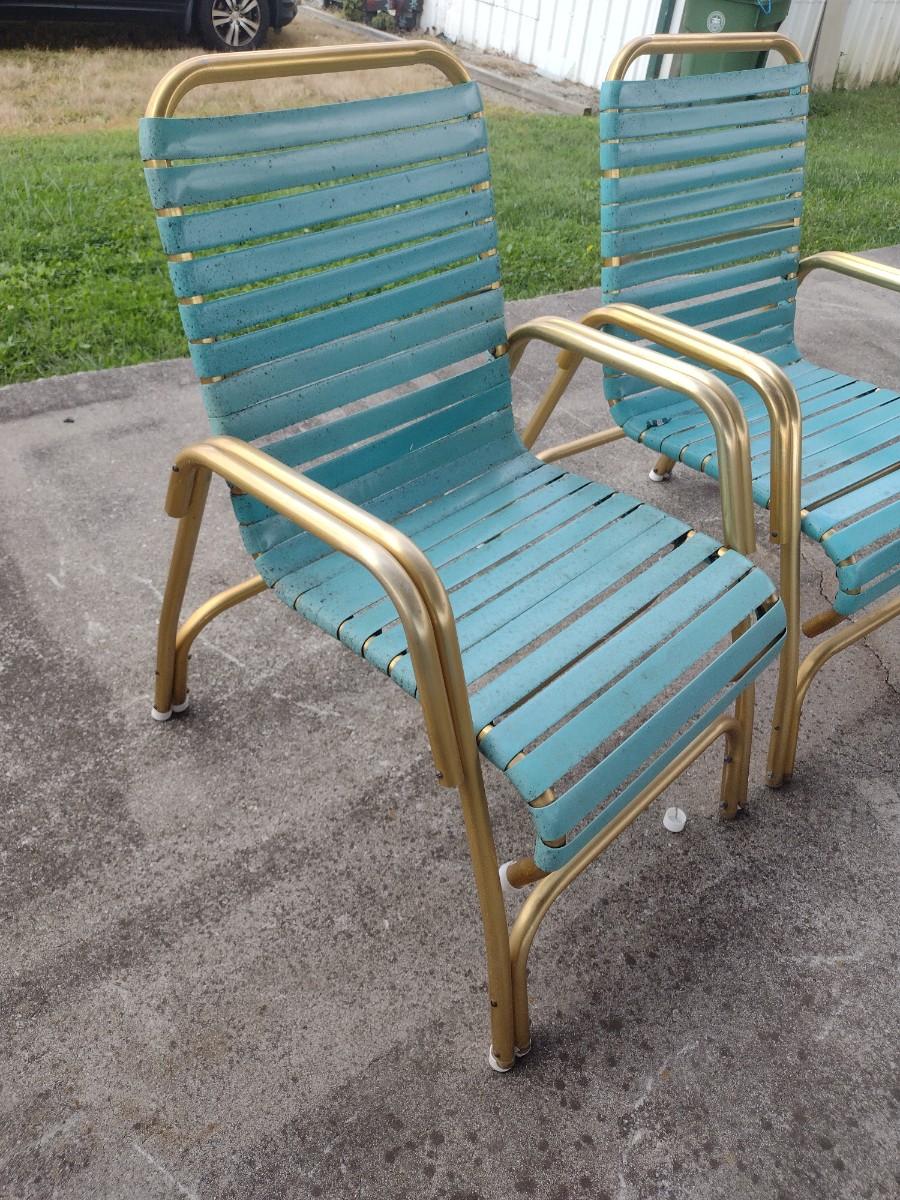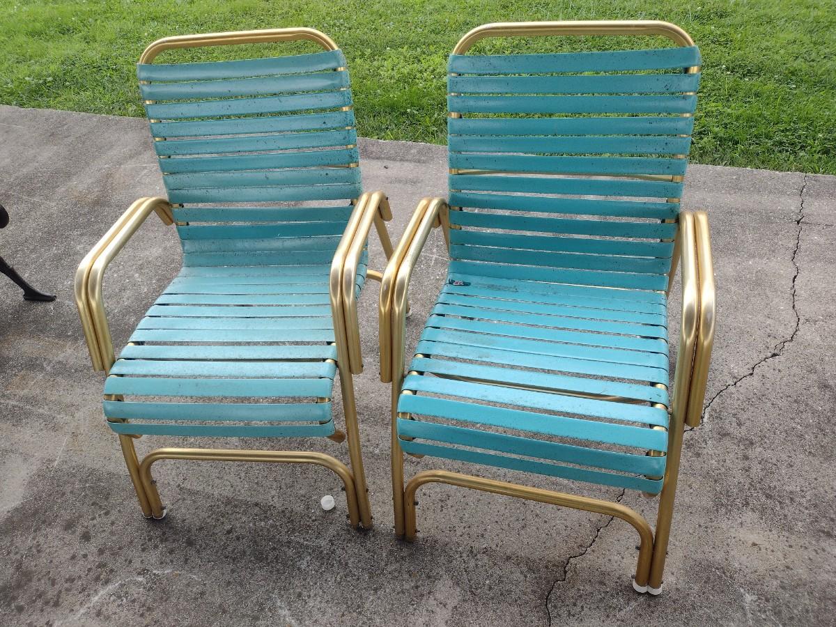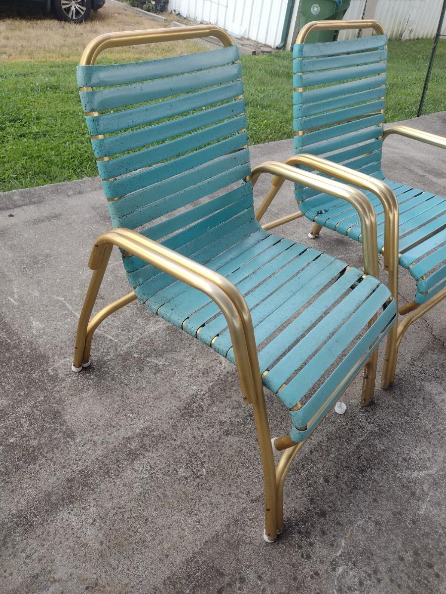 Pair of Retro Gold Tone Aluminum Tube Frame Stacking Lawn Chairs with Plastic Strap Seat and Back. Chairs will need to be cleaned due to tree sap.