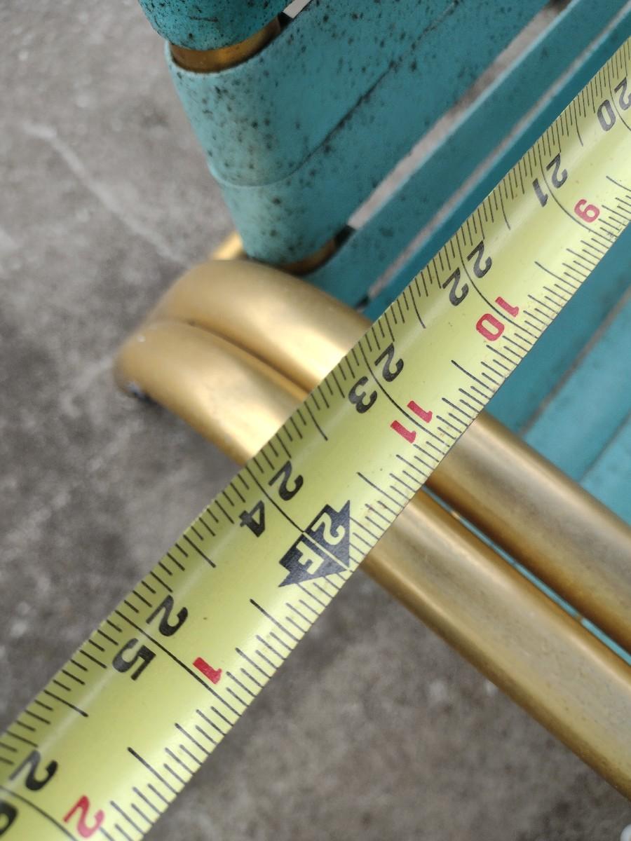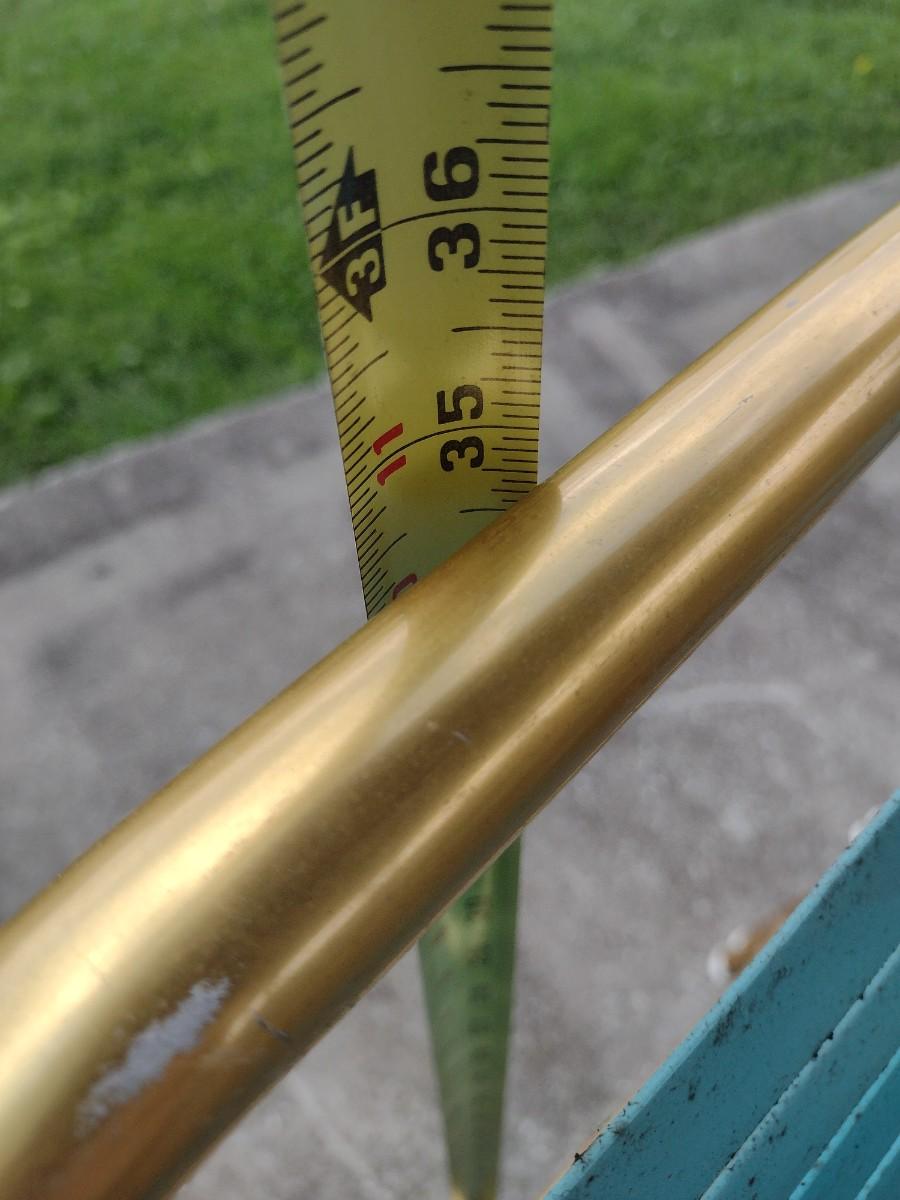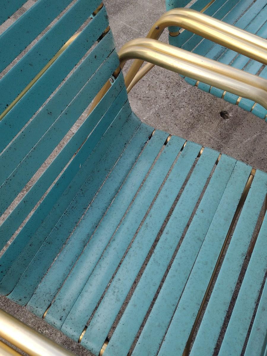 Pair of Retro Gold Tone Aluminum Tube Frame Stacking Lawn Chairs with Plastic Strap Seat and Back. Chairs will need to be cleaned due to tree sap.