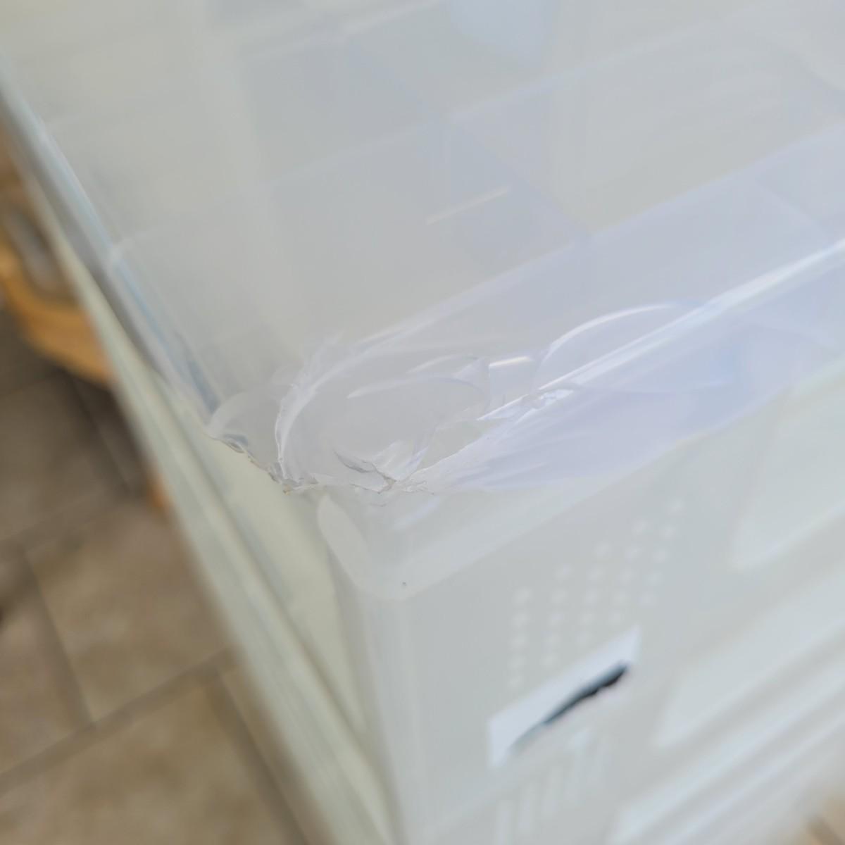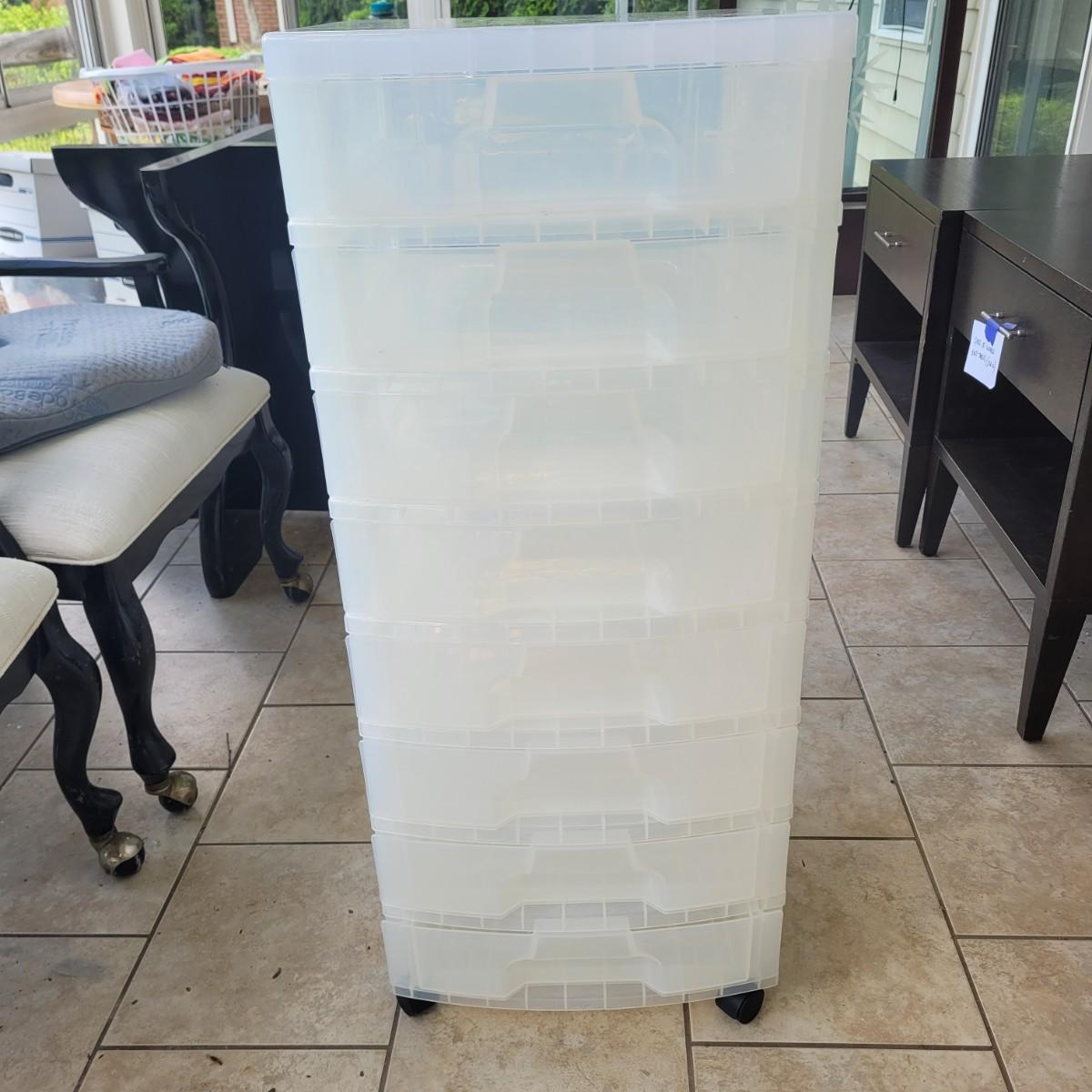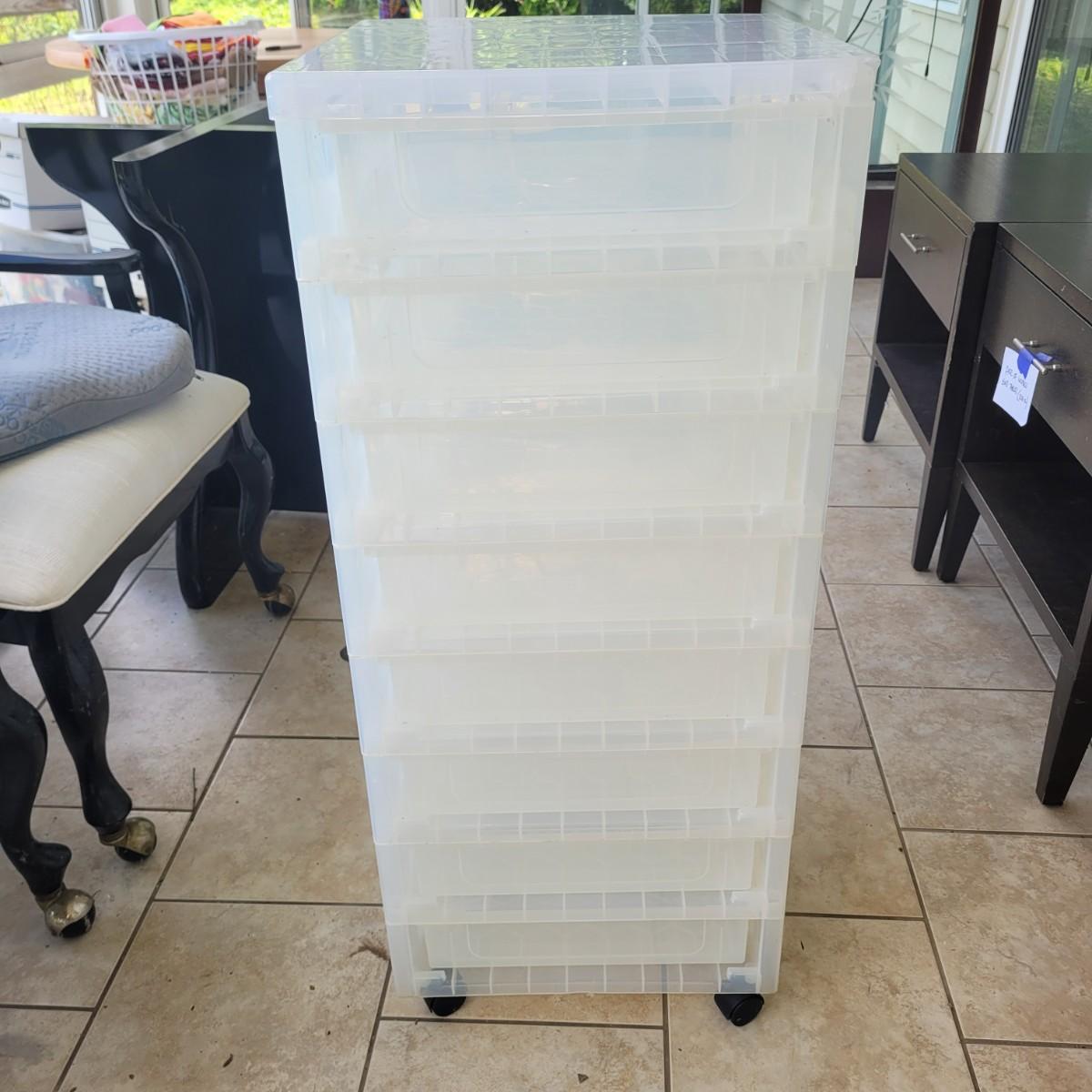 This lot includes three identical rolling plastic drawers. One has been opened while others appear to be unused. All are in like new condition. Each shelf features swiveling wheels and eight individual sliding drawers for storage. Individually, the units measure 16" x 17" x 37"H. The opened shelf has a crack on the back corner that does not affect functionality.