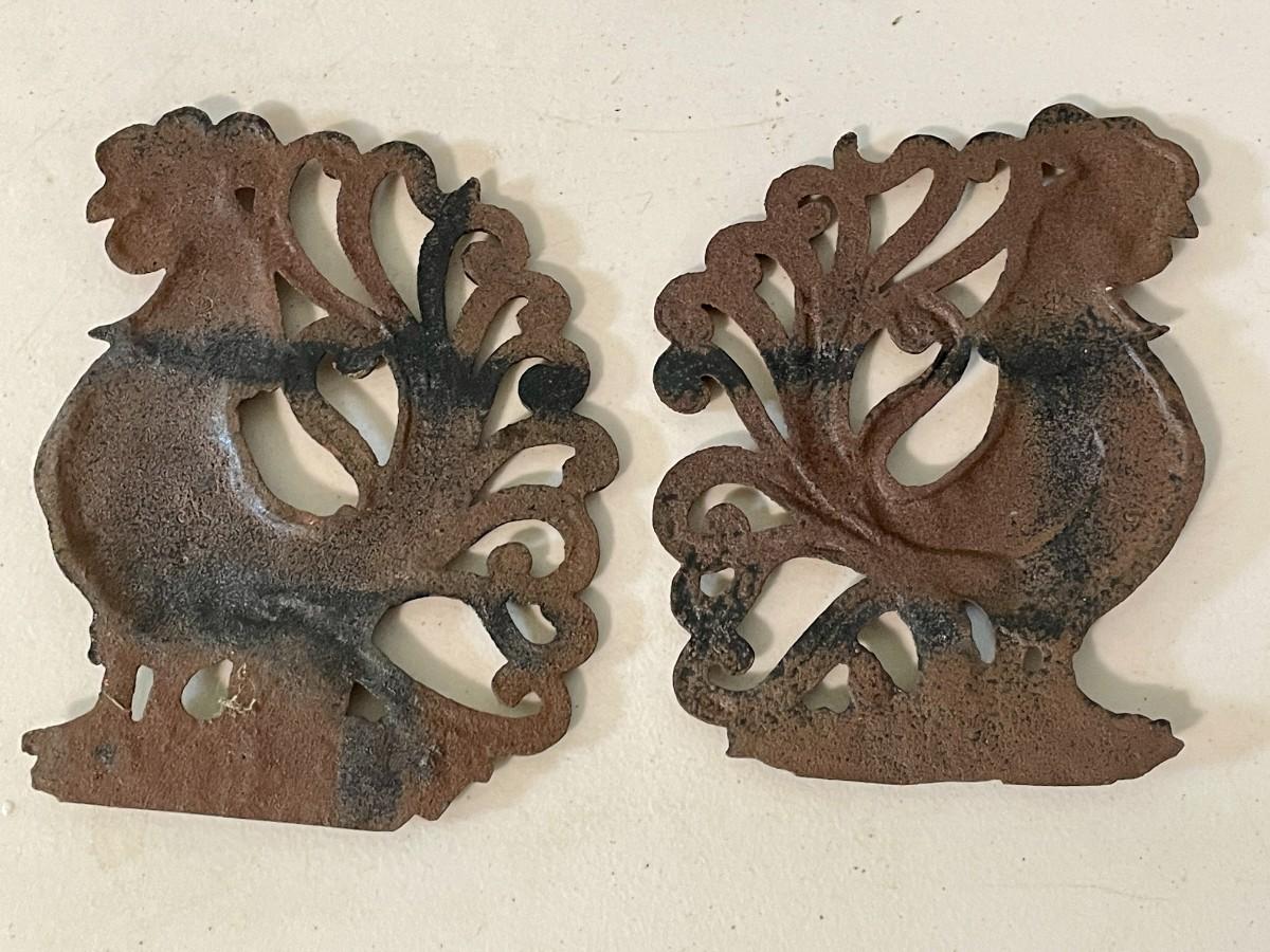 Pair of rooster oven mitts & painted cast iron rooster wall hangings